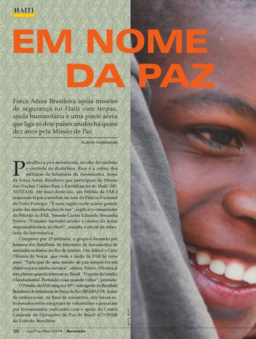 atrulhas a pé e motorizada, escolta de comboio e controle de distúrbios. Essa é a rotina dos militares da Infantaria da Aeronáutica, tropa da Força Aérea Brasileira que participam da Missão das Nações Unidas Para a Estabilização do Haiti (MINUSTAH). Até maio deste ano, um Pelotão da FAB é responsável por patrulhas na área do Palácio Nacional de Porto Príncipe. “É uma região onde ocorre grande parte das manifestações de rua”, explica o comandante do Pelotão da FAB, Tenente Carlos Eduardo Pessanha Novoa. “Estamos bastante unidos e cientes da nossa responsabilidade no Haiti”, ressalta o oficial da Infantaria da Aeronáutica. Composto por 29 militares, o grupo é formado por homens dos Batalhões de Infantaria da Aeronáutica de unidades sediadas no Rio de Janeiro. Um deles é o Cabo Oliveira de Souza, que veste a farda da FAB há nove anos. “Participar de uma missão de paz sempre foi um objetivo para minha carreira”, afirma. Noivo, Oliveira já tem planos quando retornar ao Brasil. “O apoio da família é fundamental. Pretendo casar quando voltar”, promete. O Pelotão da FAB integra o 19º Contingente do Batalhão Brasileiro de Infantaria de Força de Paz (BRABAT 19). Antes de embarcarem, no fi nal de novembro, eles foram selecionados entre um grupo de voluntários e passaram por treinamentos realizados com o apoio do Centro Conjunto de Operações de Paz do Brasil (CCOPAB) do Exército Brasileiro.