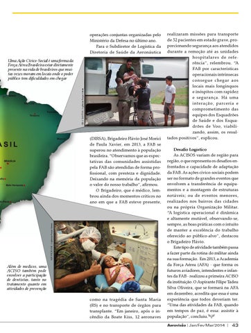 realizaram missões para transporte de 52 pacientes em estado grave, proporcionando segurança aos atendidos durante a remoção até as unidades hospitalares de referência”, relembrou. “A FAB por características operacionais intrínsecas consegue chegar aos locais mais longínquos e inóspitos com rapidez e segurança. Há uma interação, parceria e comprometimento das equipes dos Esquadrões de Saúde e dos Esquadrões de Voo, viabilizando, assim, os resultados positivos”, explicou. Desafio Logístico As ACISOS variam de região para região, o que representa os desafios enfrentados e capacidade de adaptação da FAB. As ações cívico-sociais podem ser no formato de grandes eventos que envolvem a transferência de equipamentos e a montagem de estruturas notáveis; ou de eventos menores, realizados nos bairros das cidades ou na própria Organização Militar. “A logística operacional é dinâmica e altamente mutável, observando-se, sempre, as boas práticas com o intuito de manter a excelência do trabalho oferecido ao público-alvo”, destacou o Brigadeiro Flávio. Este tipo de atividade também passa a fazer parte da rotina do militar ainda na sua formação. Em 2013, a Academia da Força Aérea (AFA) - que forma os futuros aviadores, intendentes e infantes da FAB - realizou a primeira ACISO da instituição. O Aspirante Filipe Tadeu Silva Oliveira, que se formará na AFA em dezembro, acredita que essa é uma experiência que todos deveriam ter. “Uma das atividades da FAB, quando em tempos de paz, é essa: assistir à população”, concluiu. Aerovisão Jan/Fev/Mar/2014