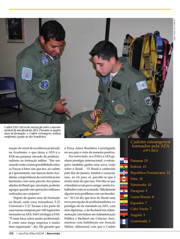 Cadete Del Cid recebe instrução sobre o assento ejetável de um oficial da AFA. Durante os quatro anos de formação, o Cadete estrangeiro utiliza uniformes iguais ao dos brasileiros mação do nível de excelência praticada na Academia, o que deixa a AFA e a FAB em patamar elevado de profissionalismo na formação militar. “Em um mundo onde a interoperabilidade entre as Forças é fator sine qua non, ao cadete já é apresentado, nos bancos desta Academia, a importância da convivência em harmonia com uma parcela dos países aliados do Brasil que, em muito, poderão agregar quando em operações militares realizadas em conjunto”. Depois de quatro anos de formação no Brasil, onde voou treinadores T-25 Universal e T-27 Tucano e fez parte de uma turma composta por 148 Aspirantes formados na AFA, Del Cid elogia a FAB. “É uma força aérea muito profissional. É como uma mega empresa e muito bem organizada”, diz. Ele garante que
