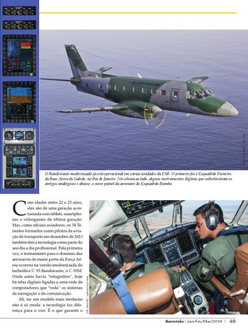 om idades entre 22 e 25 anos, eles são de uma geração acostumada com tablets, smartphones e videogames de última geração. Mas, como oficiais aviadores, os 58 Tenentes formados como pilotos da aviação de transporte em dezembro de 2013 também têm a tecnologia como parte do seu dia a dia profissional. Pela primeira vez, o treinamento para o domínio das aeronaves de maior porte da Força Aérea ocorreu na versão modernizada do turboélice C-95 Bandeirante, o C-95M. Onde antes havia “reloginhos”, hoje há telas digitais ligadas a uma rede de computadores que “roda” os sistemas de navegação e de comunicação. Ali, ter um modelo mais moderno não é só moda: a tecnologia faz diferença para o voo. É o que garante o
