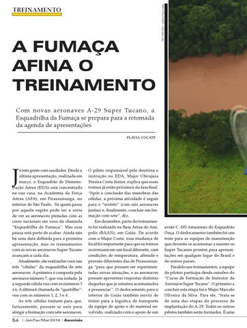 á tem gente com saudades. Desde a última apresentação, realizada em março, o Esquadrão de Demonstração Aérea (EDA) está concentrado na sua casa, na Academia da Força Aérea (AFA), em Pirassununga, no interior de São Paulo. Só quem passa por aquela região pode ter a sorte de ver as aeronaves pintadas com as cores nacionais em voos da chamada “Esquadrilha da Fumaça”. Mas essa pausa está perto de acabar. Ainda não há uma data definida para a primeira apresentação, mas os treinamentos com as novas aeronaves Super Tucano avançam a cada dia. Atualmente, são realizados voos nas três “células” da esquadrilha de sete aeronaves. A primeira é composta pela aeronave número 7, que voa isolada. Já a segunda célula voa com os números 5 e 6. A última é chamada de “quatrilho”: voa com os números 1, 2, 3 e 4. As três células treinam para que, futuramente, possam se unir para atingir a formação com sete aeronaves.