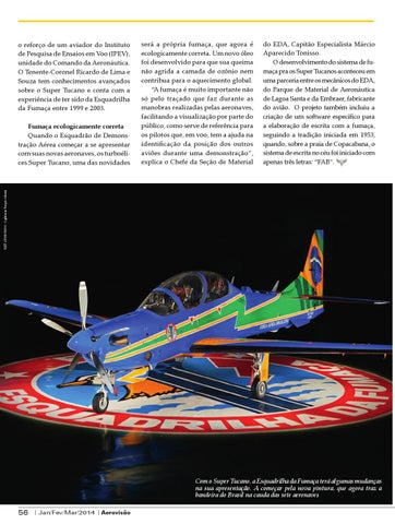 do EDA, Capitão Especialista Márcio Aparecido Tonisso. O desenvolvimento do sistema de fumaça pra os Super Tucanos aconteceu em uma parceria entre os mecânicos do EDA, do Parque de Material de Aeronáutica de Lagoa Santa e da Embraer, fabricante do avião. O projeto também incluiu a criação de um software específico para a elaboração de escrita com a fumaça, seguindo a tradição iniciada em 1953, quando, sobre a praia de Copacabana, o sistema de escrita no céu foi iniciado com apenas três letras: “FAB”.