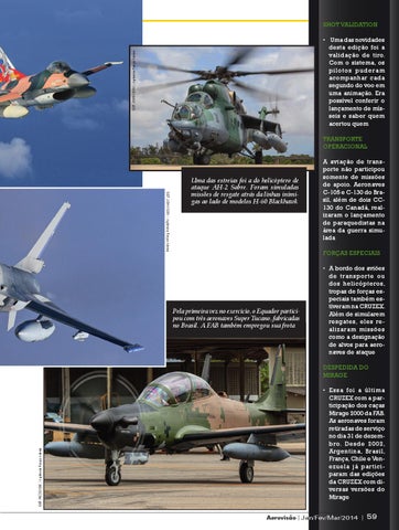 DESPEDIDA DO MIRAGE • Essa foi a última CRUZEX com a participação dos caças Mirage 2000 da FAB. As aeronaves foram retiradas de serviço no dia 31 de dezembro. Desde 2002, Argentina, Brasil, França, Chile e Venezuela já participaram das edições da CRUZEX com diversas versões do Mirage Aerovisão Jan/Fev/Mar/2014