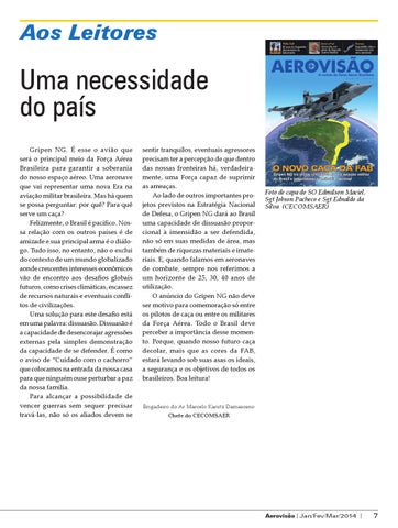 sentir tranquilos, eventuais agressores precisam ter a percepção de que dentro das nossas fronteiras há, verdadeiramente, uma Força capaz de suprimir as ameaças. Ao lado de outros importantes projetos previstos na Estratégia Nacional de Defesa, o Gripen NG dará ao Brasil uma capacidade de dissuasão proporcional à imensidão a ser defendida, não só em suas medidas de área, mas também de riquezas materiais e imateriais. E, quando falamos em aeronaves de combate, sempre nos referimos a um horizonte de 25, 30, 40 anos de utilização. O anúncio do Gripen NG não deve ser motivo para comemoração só entre os pilotos de caça ou entre os militares da Força Aérea. Todo o Brasil deve perceber a importância desse momento. Porque, quando nosso futuro caça decolar, mais que as cores da FAB, estará levando sob suas asas os ideais, a segurança e os objetivos de todos os brasileiros. Boa leitura!
