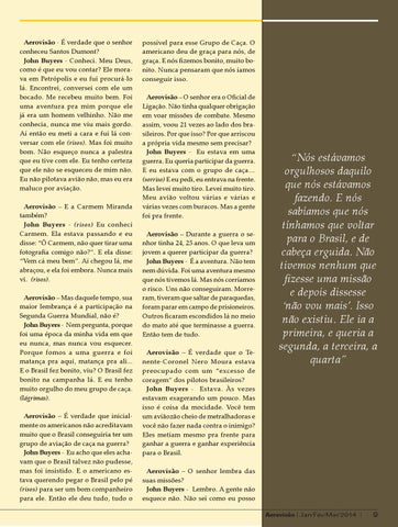 possível para esse Grupo de Caça. O americano deu de graça para nós, de graça. E nós fizemos bonito, muito bonito. Nunca pensaram que nós íamos conseguir isso. Aerovisão – O senhor era o Oficial de Ligação. Não tinha qualquer obrigação em voar missões de combate. Mesmo assim, voou 21 vezes ao lado dos brasileiros. Por que isso? Por que arriscou a própria vida mesmo sem precisar? John Buyers - Eu estava em uma guerra. Eu queria participar da guerra. E eu estava com o grupo de caça… (sorriso) E eu pedi, eu entrava na frente. Mas levei muito tiro. Levei muito tiro. Meu avião voltou várias e várias e várias vezes com buracos. Mas a gente foi pra frente. Aerovisão – Durante a guerra o senhor tinha 24, 25 anos. O que leva um jovem a querer participar da guerra? John Buyers - É a aventura. Não tem nem dúvida. Foi uma aventura mesmo que nós tivemos lá. Mas nós corríamos o risco. Uns não conseguiram. Morreram, tiveram que saltar de paraquedas, foram parar em campo de prisioneiros. Outros ficaram escondidos lá no meio do mato até que terminasse a guerra. Então tem de tudo. Aerovisão – É verdade que o Tenente-Coronel Nero Moura estava preocupado com um “excesso de coragem” dos pilotos brasileiros? John Buyers - Estava. Às vezes estavam exagerando um pouco. Mas isso é coisa da mocidade. Você tem um aviãozão cheio de metralhadoras e você não fazer nada contra o inimigo? Eles metiam mesmo pra frente para ganhar a guerra e ganhar experiência para o Brasil. Aerovisão – O senhor lembra das suas missões? John Buyers - Lembro. A gente não esquece não. Não sei como eu posso