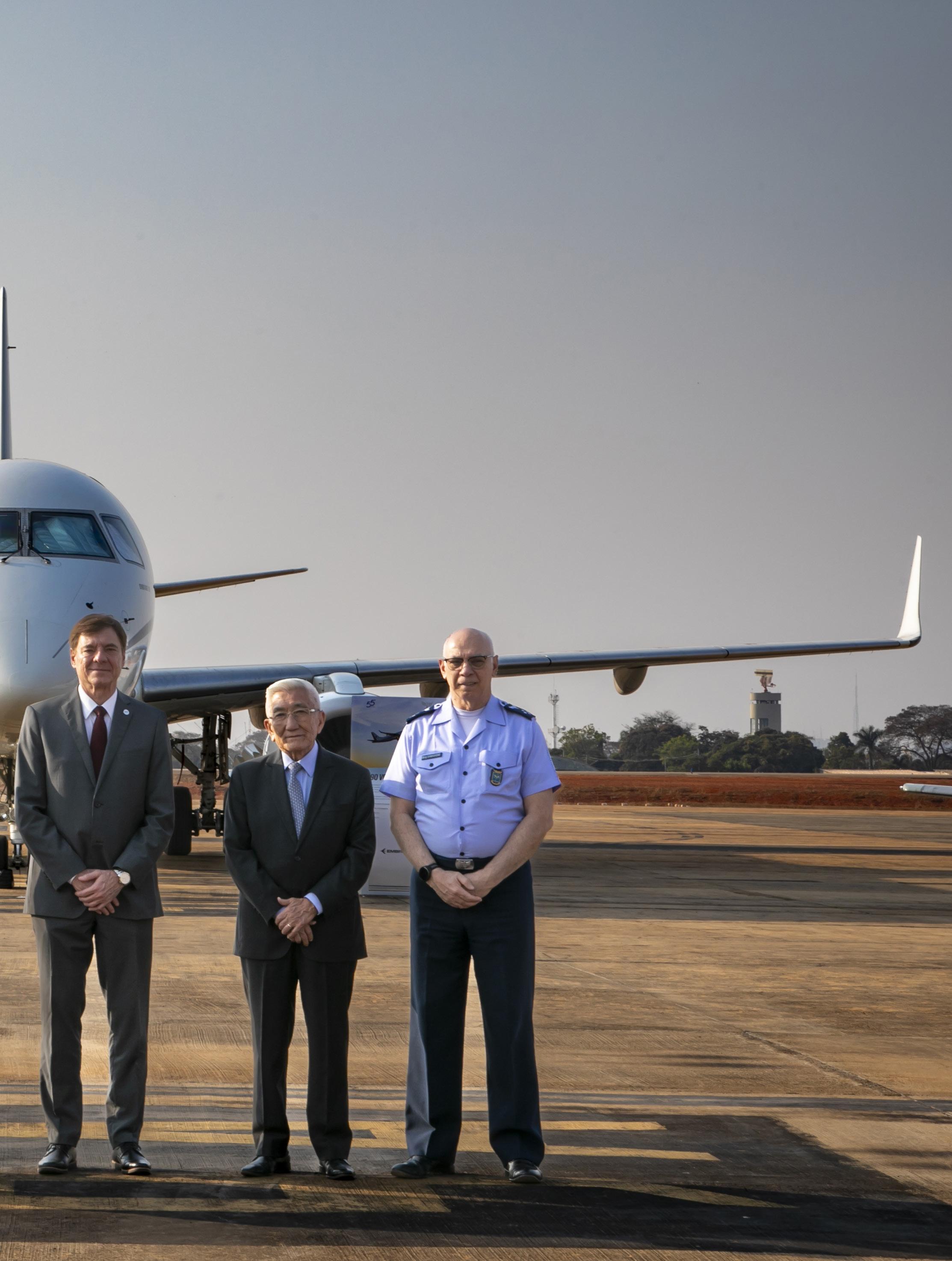 que transformaram o sonho de voarem em realidade. Agradeço a confiança que a Força Aérea deposita na empresa”, destacou o presidente. Na imagem, da esquerda para a direita, à frente do VC2: Tenente-Brigadeiro do Ar Nivaldo Luiz Rossato (ex-Comandante da Aeronáutica), João Bosco da Costa Junior (CEO da Embraer Defesa e Segurança), Tenente-Brigadeiro do Ar Lélio Viana Lôbo (ex-Ministro da Aeronáutica), Francisco Gomes Neto (presidente da Embraer), Tenente-Brigadeiro do Ar Juniti Saito (ex-Comandante da Aeronáutica) e Tenente-Brigadeiro do Ar Marcelo Kanitz Damasceno (Comandante da Aeronáutica).