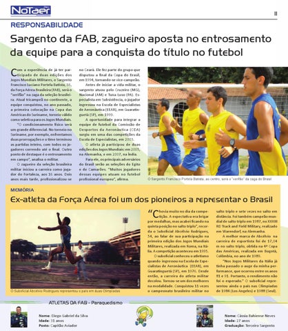 no Ceará. Ele fez parte do grupo que disputou a final da Copa do Brasil, em 1994, tornando-se vice-campeão. Antes de iniciar a vida militar, o sargento atuou pelo Cruzeiro (MG), Nacional (AM) e Tuna Luso (PA). Especialista em Subsistência, o jogador ingressou na Escola de Especialistas de Aeronáutica (EEAR), em Guaratinguetá (SP), em 1999. A oportunidade para integrar a equipe de futebol da Comissão de Desportos da Aeronáutica (CDA) surgiu em uma das competições da Escola de Especialistas, em 2003. O atleta já participou de duas edições dos Jogos Mundiais: em 2005, na Alemanha, e em 2007, na Índia. Para ele, os principais adversários do Brasil serão as seleções do Egito e de Camarões. “Muitos jogadores dessas equipes atuam no futebol profissional europeu”, afirma.