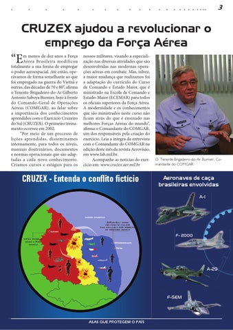 nossos militares, visando a especialização nas diversas atividades que são desenvolvidas nas modernas operações aéreas em combate. Mas, talvez, a maior mudança que realizamos foi a adaptação do currículo do Curso de Comando e Estado Maior, que é ministrado na Escola de Comando e Estado-Maior (ECEMAR) para todos os oficiais superiores da Força Aérea. A modernidade e os conhecimentos que são ministrados neste curso não ficam atrás do que é ensinado nas melhores Forças Aéreas do mundo”, afirma o Comandante do COMGAR, um dos responsáveis pela criação do exercício. Leia a íntegra da entrevista com o Comandante do COMGAR na edição deste mês da revista Aerovisão, em www.fab.mil.br. Acompanhe as notícias do exercício em: www.cruzex.aer.mil.br