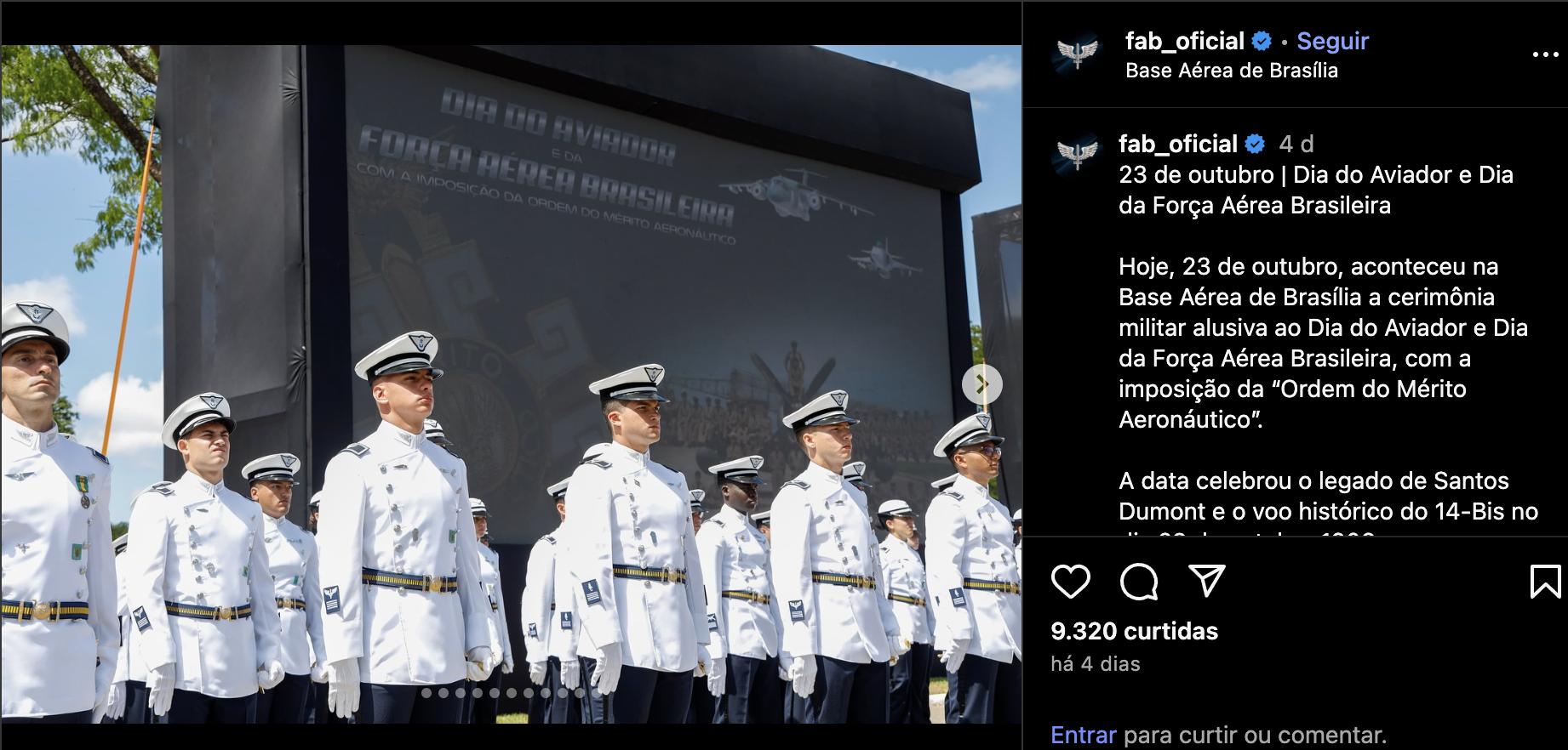 A publicação no Instagram sobre a cerimônia militar alusiva ao Dia do Aviador e da Força Aérea Brasileira, com a imposição da “Ordem do Mérito Aeronáutico”, no dia 23 de outubro, foi o destaque nas mídias sociais.