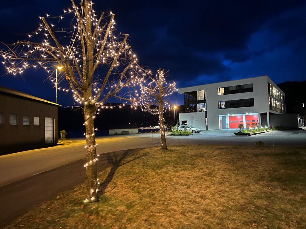 Siste innsats besto i å henge opp julebelysningen på de to trærne i "trekanten"
