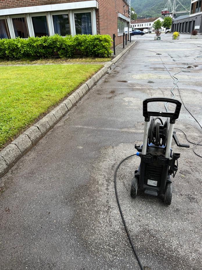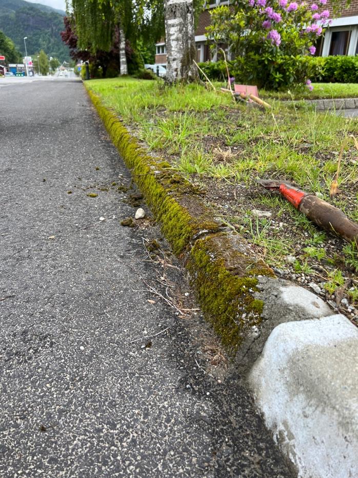 Rense kantstein tar tid, men det gir et ryddig inntrykk etter jobben. Noen gode økter ble gjort ved taxi-bua og parkeringsplassen der.