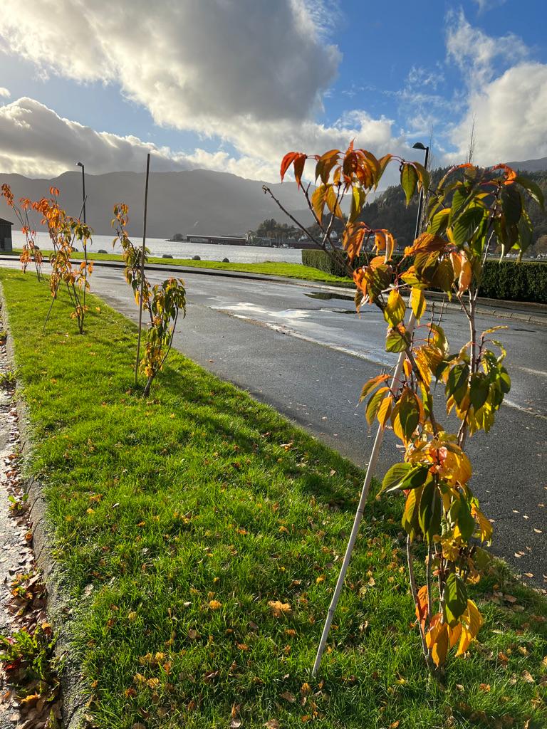 Høstfarger på Vangnes. Plenen har blitt fin og prydkirsebærtrærne vokser seg større. Totalt 15 trær ble plantet i svingen forrige år.