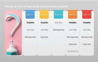 Gledajući ove odgovore, 80% doktora jeste preporučilo Smješka. Ipak, 80% zubara je takođepreporučiloDentopuritas,dokje100%zubarapreporučiloZubiMaxinijedanoddoktora nije izričito rekao da je Smješko njegova prva preporuka.