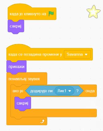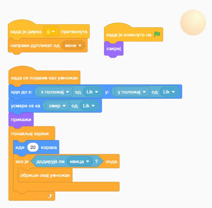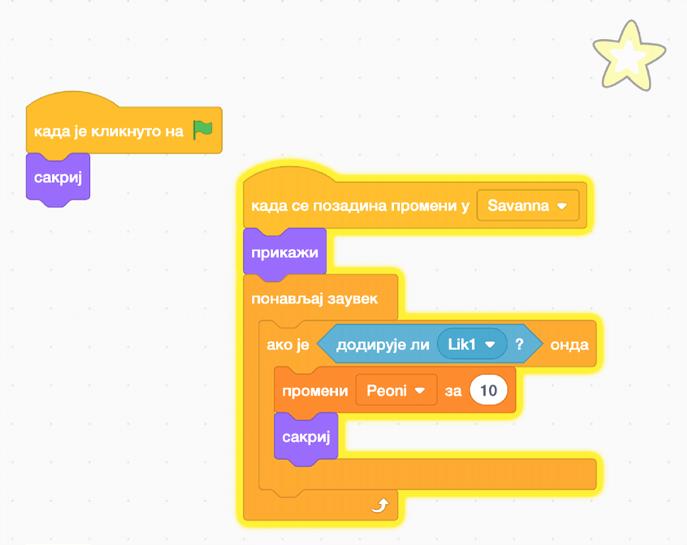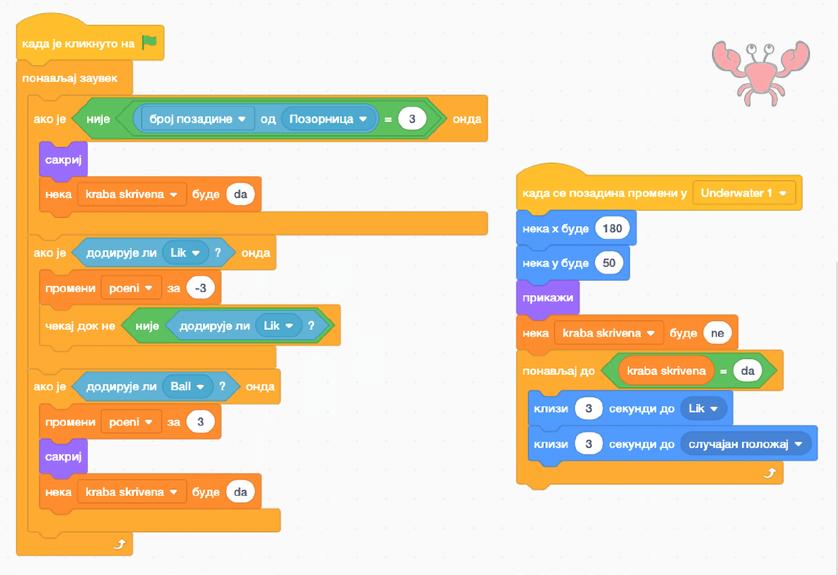 Nakon što postavimo komande za svakog dobrog lika, prelazimo na zle likove. Stavićemo da je jedan od zlih likova kraba, i pojavljuje se na trećoj pozadini. Moramo se prisjetiti da je ideja sledeća - kada glavni lik dodirne krabu, on gubi 3 poena, međutim, ako je pogodi loptom, on dobija 3 poena i kraba nestaje. Isti način postavljanja komandi treba primijeniti i na sledećeg “lošeg” lika.