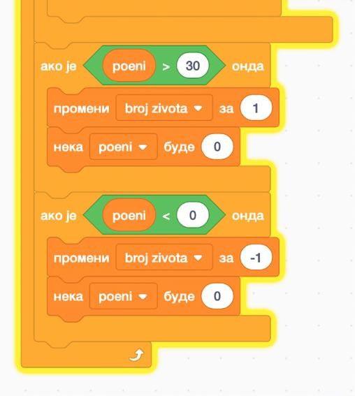 1. Kada sakupi preko 30 poena, dobija novi život, a poeni se spuste na 0. Kada broj poena padne ispod 0, gubi život. Ako izgubi sve živote, igra se zaustavlja i piše KRAJ IGRE.