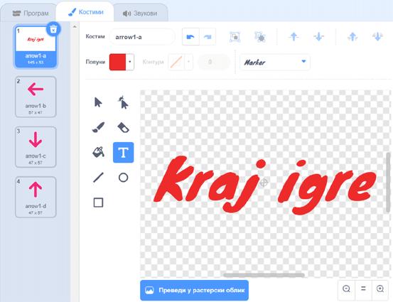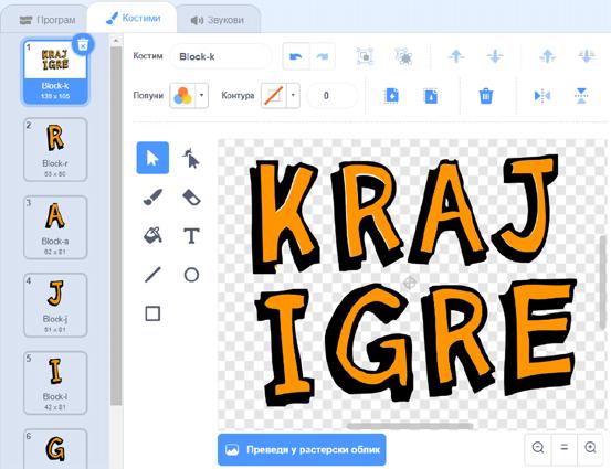 Drugi način: KRAJ IGRE možemo napisati tako što ćemo u okviru otvorenog taba za prvo slovo, dodati jedan po jedan kostim koji će kreirati ove riječi. Slova možemo da iskopiramo ili čitav kostim da selektujemo i kopiramo na prvi kostim tako što ćemo kliknuti na plavu ikonicu sa bijelim plusom. Kako bi ga nalijepili na prvobitni kostim u koji ređamo slova, treba da kliknemo na plavu ikonicu sa bijelom strelicom ka dolje. Na kraju slažemo slova, uz dodatnu pažnju na to da smo selektovali sve njihove djelove.