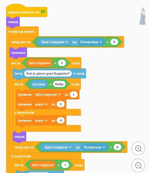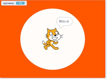 Ideja: Kada je slovo T pritisnuto, neka Scratch mačak pita: ”Koliko je 4*19?” Ako je odgovor tačan, neka mačak kaže ”Bravo!”. Ukoliko je odgovor netačan, neka mačak kaže “Netačan odgovor”.
