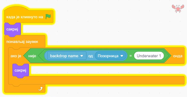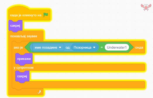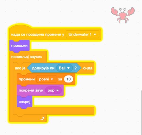 Šta ako, nakon što prikažemo raka, dodamo kod koji provjerava da li ga je loptica dotakla? Ovaj kod se izvršava u bloku ponavljaj zauvijek, tako da, čim loptica pogodi raka, pitamo da li je pozadina i dalje Underwater 1, i ukoliko nije, rak se opet pojavljuje.