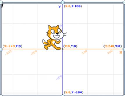Za pisanje programa je veoma važno da razumijemo na koji način se naši likovi kreću po pozornici. Kad se započne novi projekat, lik mačka se nalazi na sredini ekrana (x,y)=(0,0). Za pozicije lijevo od sredine, X je negativan, a za pozicije desno od sredine, X je pozitivan. Slično, za pozicije ispod sredine Y je negativan, a za pozicije iznad sredine, Y je pozitivan.