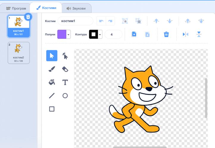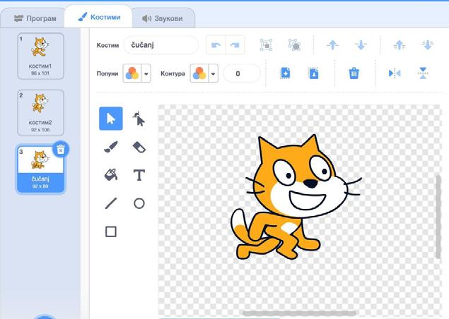 4. Neki likovi imaju više kostima, a kostim je slika izgleda našeg lika. Klikom na jezičak “Kostimi”, iznad palete blokova, možeš pronaći sve dostupne kostime. Njih možeš mijenjati uz pomoć ponuđenih alatki, što ti daje mogućnost da nekom kostimu promijeniš boju, izraz lica, pa čak i visinu! Naravno, uvijek možeš dodavati i nove kostime.