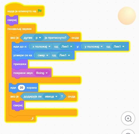 Sada kada smo je sakrili, želimo da se loptica negdje kreće, a ne samo da se prikaže. Loptica je već usmjerena, pa joj sada zadaj komandu da se kreće 20 koraka. Da ne bi ostajala zaglavljena, sakrij lopticu ako dođe do ivice.
