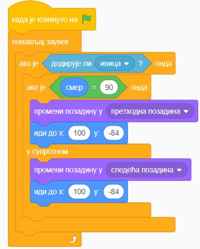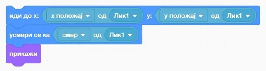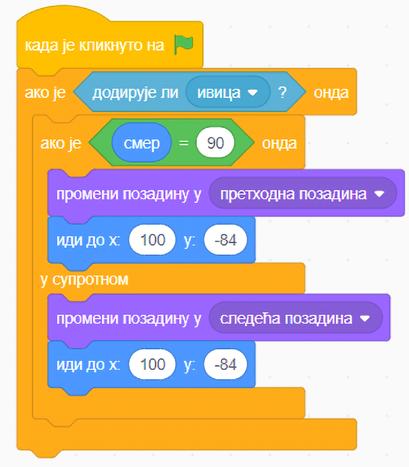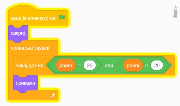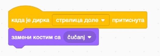Kako bismo zadali ovaj uslov, potrebno je da već kreiranom kodu dodamo komandu iz bloka izgled sledeći kostim, po uzoru na sliku desno.