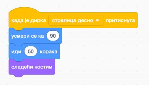 Iz bloka događaji izvlačimo komandu kada je dirka strelica desno pritisnuta. Iz bloka kretanje prevlačimo idi 10 koraka.