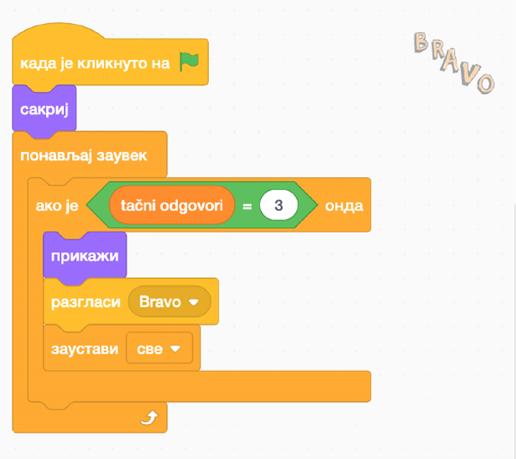 Takođe, kada je nivo pređen, napisaćemo BRAVO. To radiš na sličan način kao što smo pravili KRAJ IGRE, samo, naravno, sa drugim slovima.