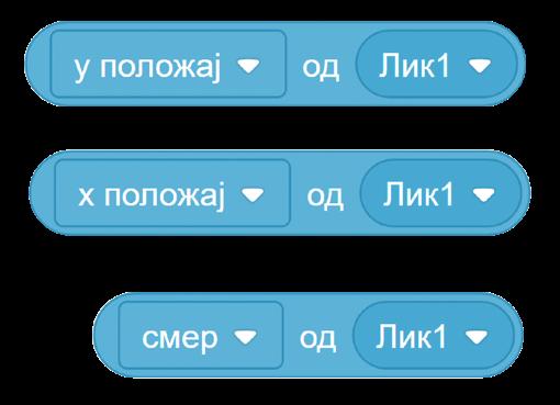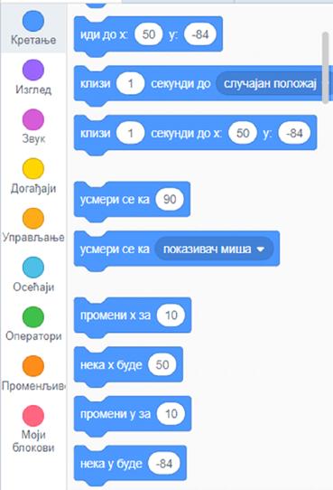 Postoji šest blokova Kretanja, koji koriste koordinate da promijene poziciju lika. Kada kliknemo na broj unutar bloka, možemo unijeti novi negativan ili pozitivan broj.