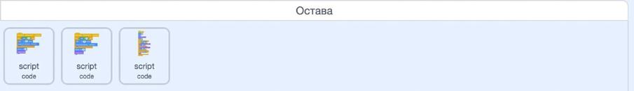 Važno je obratiti pažnju na ostavu. Kako ne bi morali isti set blokova iznova da gradimo u sledećem projektu, možemo ih jednostavno sačuvati u “Ostavi”. Kod jednom sačuvan u ostavi, možemo da koristimo i u svakom drugom projektu. Ovo nam pruža mnoge olakšice, posebno ako je kod veoma dugačak, kao na slici ispod, ili ako se često koristi.