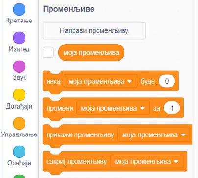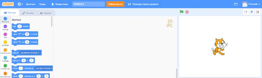 2. Blokovi komandi su podijeljeni u kategorije različitih boja, kao na gornjoj slici, a vrste blokova su: kretanje, izgled, zvuk, događaji, osjećaji, operatori, promjenjive. Na njih moraš posebno obratiti pažnju jer će ti pomoći da se lakše snađeš kada budemo radili zadatke. Svaki novi projekat u početku sadrži mačka kao lika, koji se naravno može promijeniti.