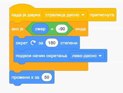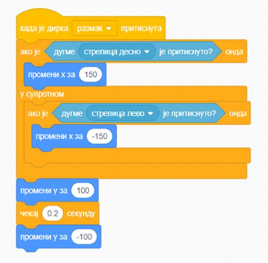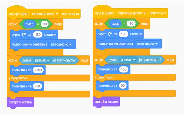 Za kretanje lijevo i desno koristimo X, pa će komanda biti promeni X za 10 i promeni X za -10.