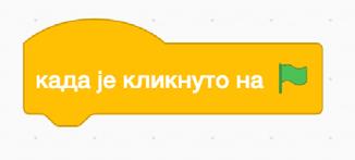 Putem blokova komandi, koje se nalaze na lijevoj strani ekrana, možeš pronaći 3 komande sa slike i to: (događaji - žuta) kada je kliknuto na, (izgled - tamno ljubičasta) izgovori i (zvuk - svijetlo ljubičasta) pokreni zvuk