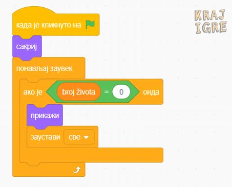 Nakon što kreiramo kostim za završenu igru, potrebno je da izgradimo kod koji će odgovarati utvrđenim uslovima i to: Ako naš lik izgubi sve živote, igrica se zaustavlja i piše KRAJ IGRE.