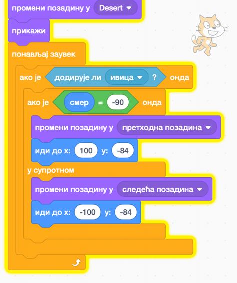 Međutim, potreban nam je kod koji će odgovarati pravilima koje smo postavili na početku. Lik se može kretati naprijed, a da se pritom pozadine mijenjaju, a nazad se može kretati samo do ivice. Zato, kada dođe do lijeve ivice vraćamo lika malo dalje od same ivice kako ne bi ostao tu zauvijek.