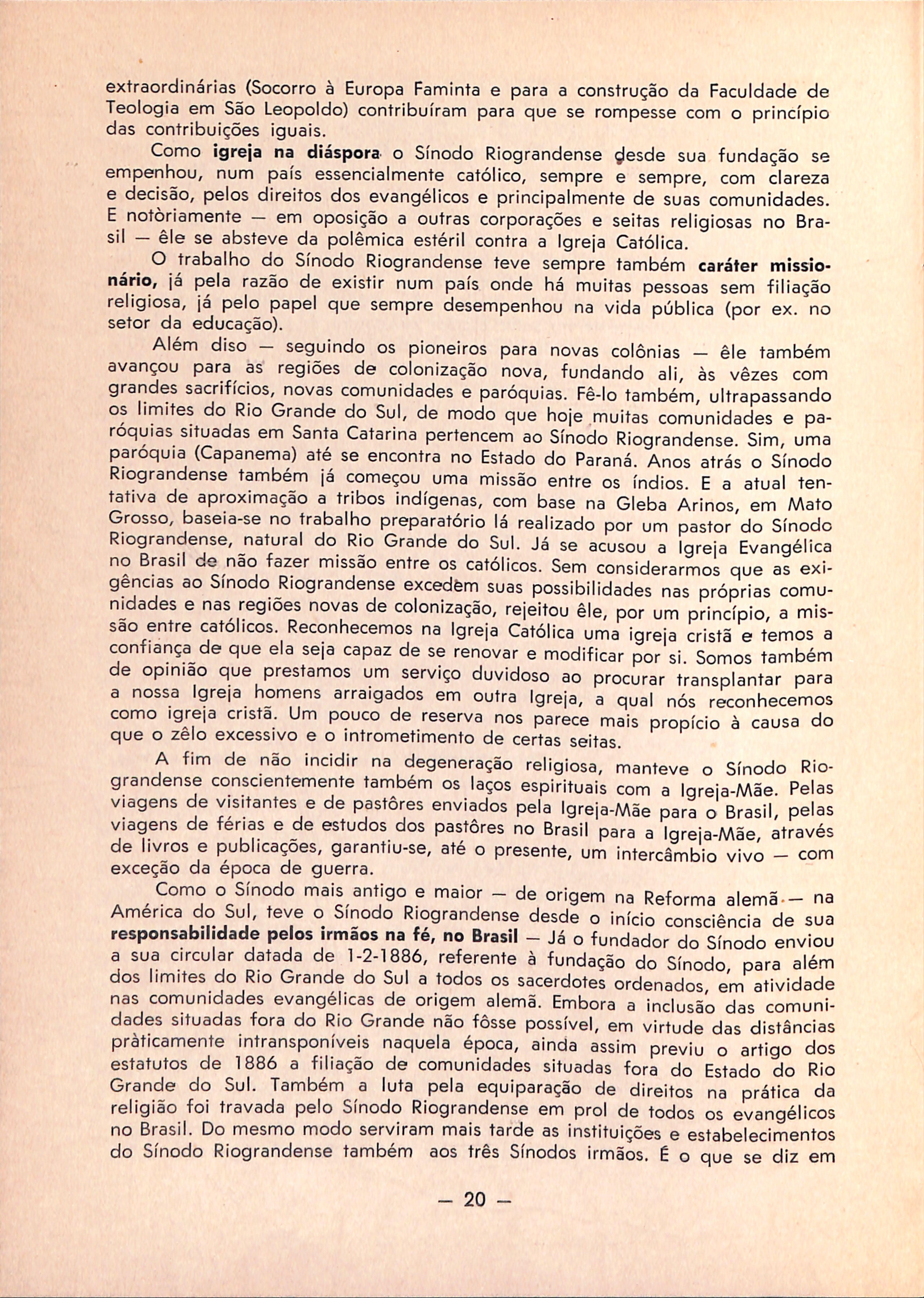 Como o Sínodo mais antigo e maior - de origem na Reforma alemãAmerica do Su , teve o Sínodo Riograndense desde o início consciência de sua responsabilidade pe os irmãos na fé, no Brasil - Já o fundador do Sínodo enviou a sua circular datada de 1-2-188Ó, referente à fundação do Sínodo, para além dos limites do Rio Grande do Sul a todos os sacerdotes ordenados, em atividade nas comunidades evangélicas de origem alemã. Embora a inclusão das comuni dades situadas fora do Rio Grande não fôsse possível, em virtude das distâncias pràticamente intransponíveis naquela época, ainda assim previu o artigo dos estatutos de 1886 a filiação de comunidades situadas fora do Estado do Rio Grande do Sul. Também a luta pela equiparação de direitos na prática da religião foi travada pelo Sínodo Riograndense em prol de todos os evangélicos no Brasil. Do mesmo modo serviram mais tarde as instituições e estabelecimentos do Sínodo Riograndense também aos três Sínodos irmãos. É o que se diz em