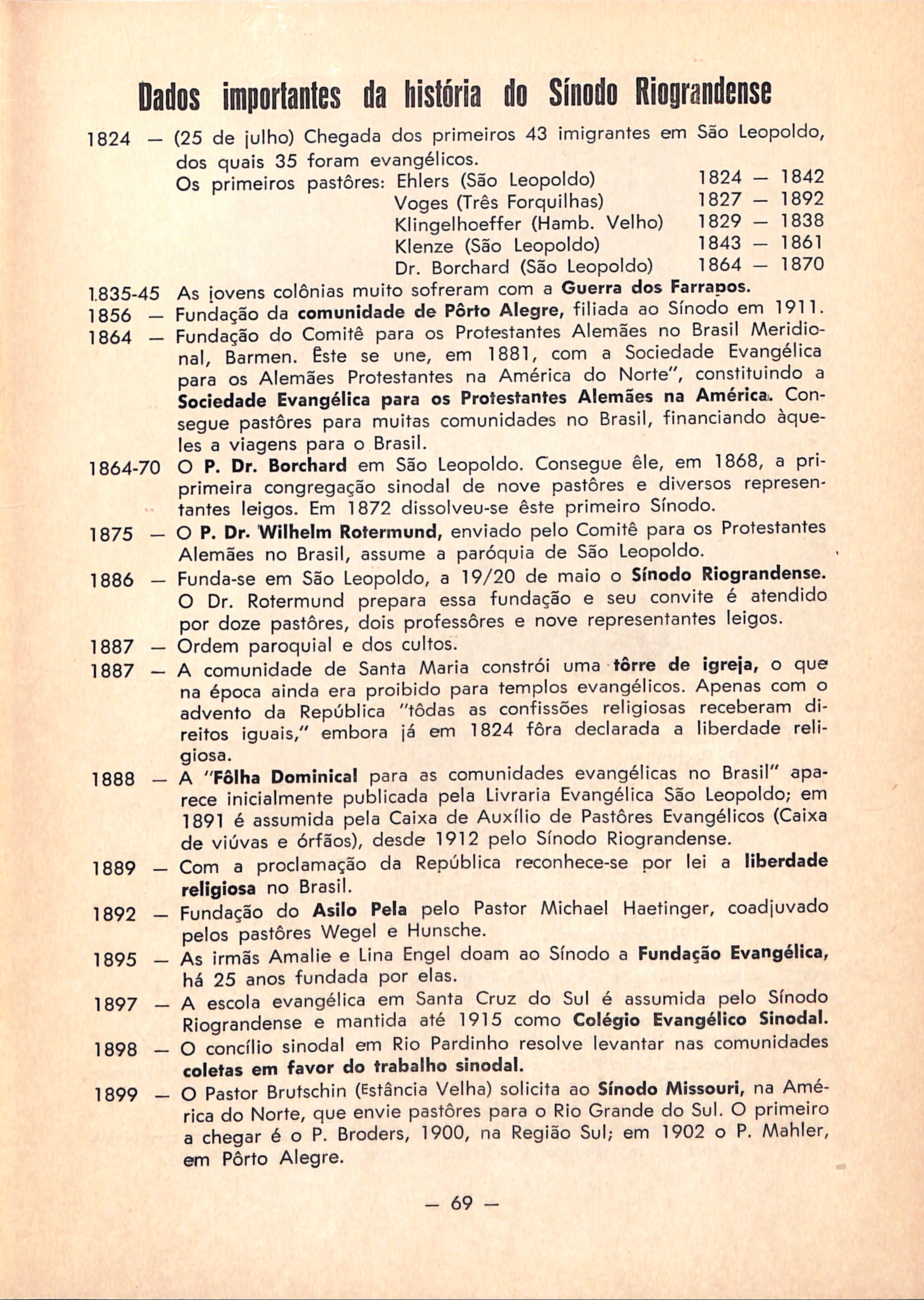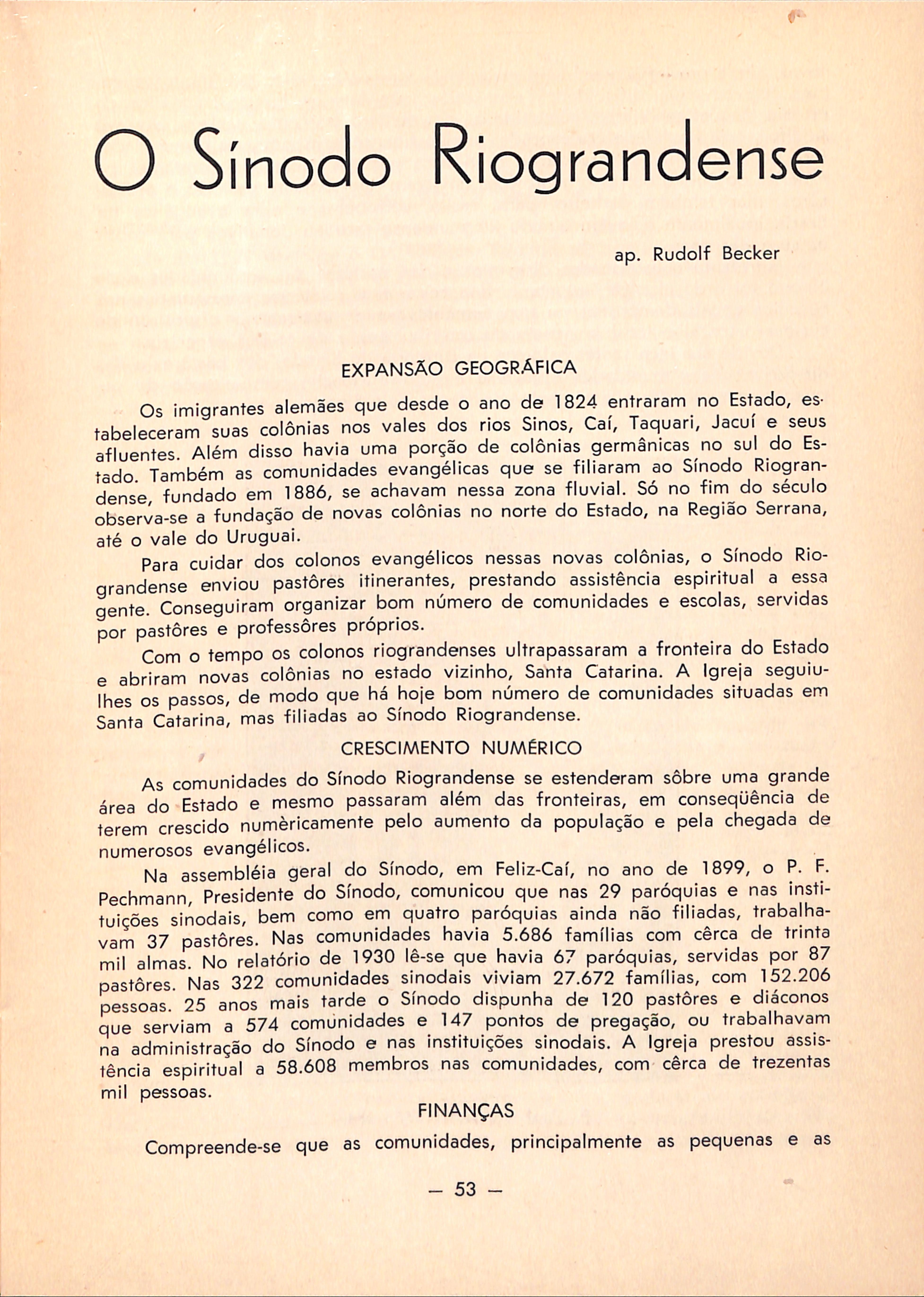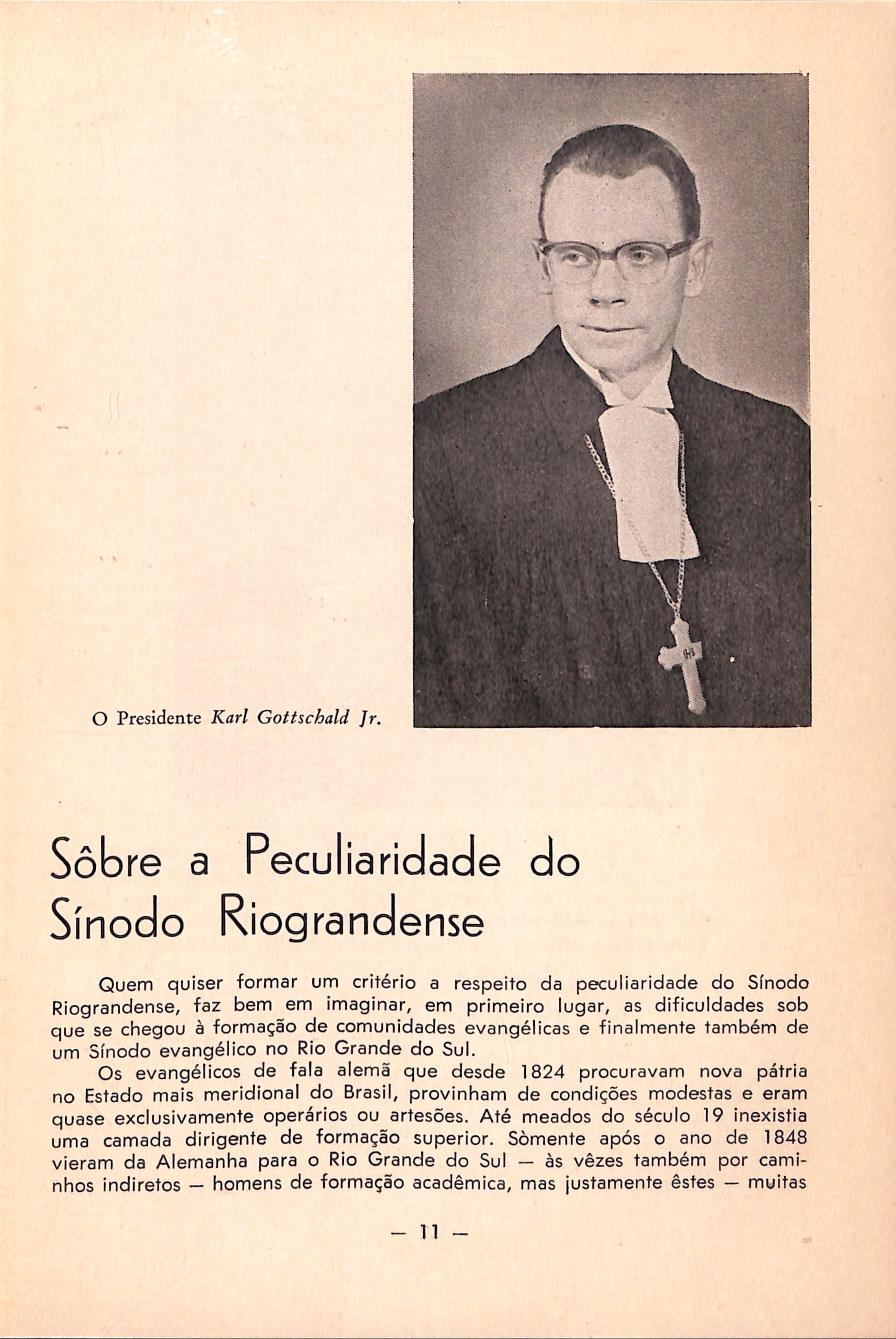 Quem quiser formar um critério a respeito da peculiaridade do Sínodo Riograndense, faz bem em imaginar, em primeiro lugar, as dificuldades sob que se chegou à formação de comunidades evangélicas e finalmente também de Sínodo evangélico no Rio Grande do Sul.