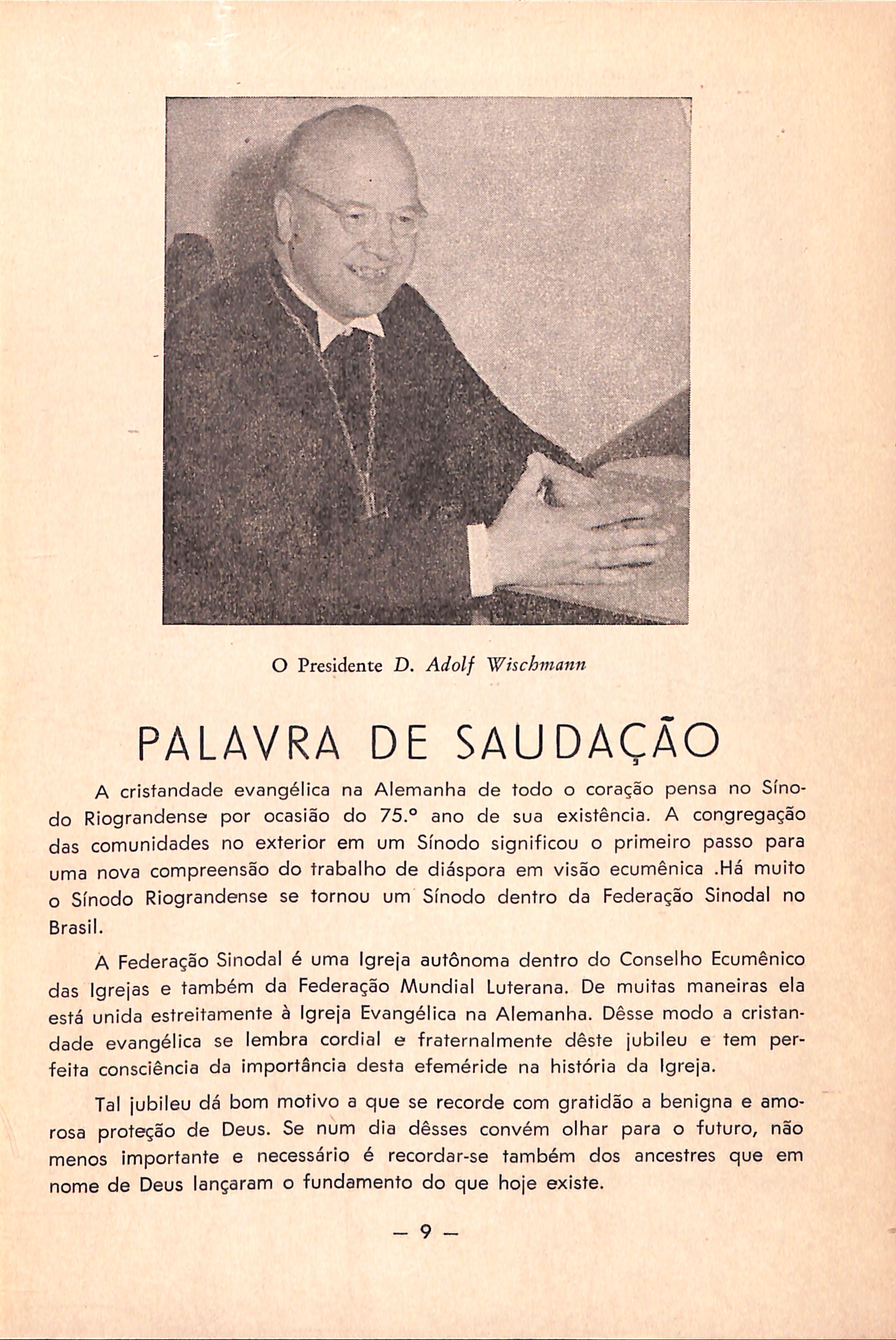 O Departamento do Exterior da Igreja Evangélica na Alemanha e com êle a cristandade evangélica na Alemanha saúdam o Sínodo ao ensejo de seu 75° ano de existência com sinceros e cordiais votos de bênçãos.