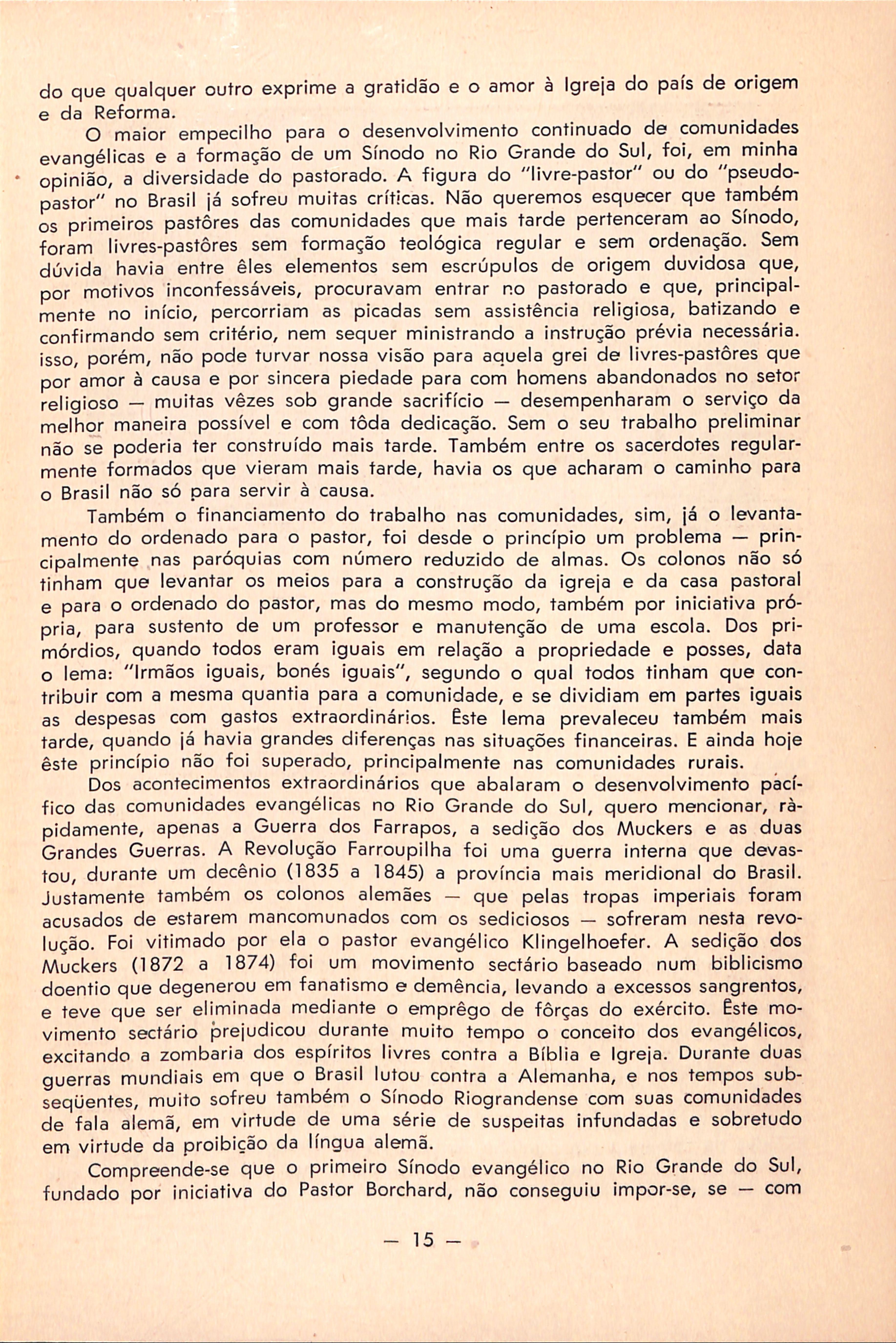 O maior empecilho para o desenvolvimento continuado de comunidades evangélicas e a formação de um Sínodo no Rio Grande do Sul, foi, em minha ● opinião, a diversidade do pastorado. A figura do "livre-pastor" ou do "pseudopastor" no Brasil já sofreu muitas críticas. Não queremos esquecer que também c; primeiros pastores das comunidades que mais tarde pertenceram ao Sínodo, foram livres-pastôres sem formação teológica regular e sem ordenação. Sem dúvida havia entre êles elementos sem escrúpulos de origem duvidosa que, motivos inconfessáveis, procuravam entrar no pastorado e que, principalsem assistência religiosa, batizando e