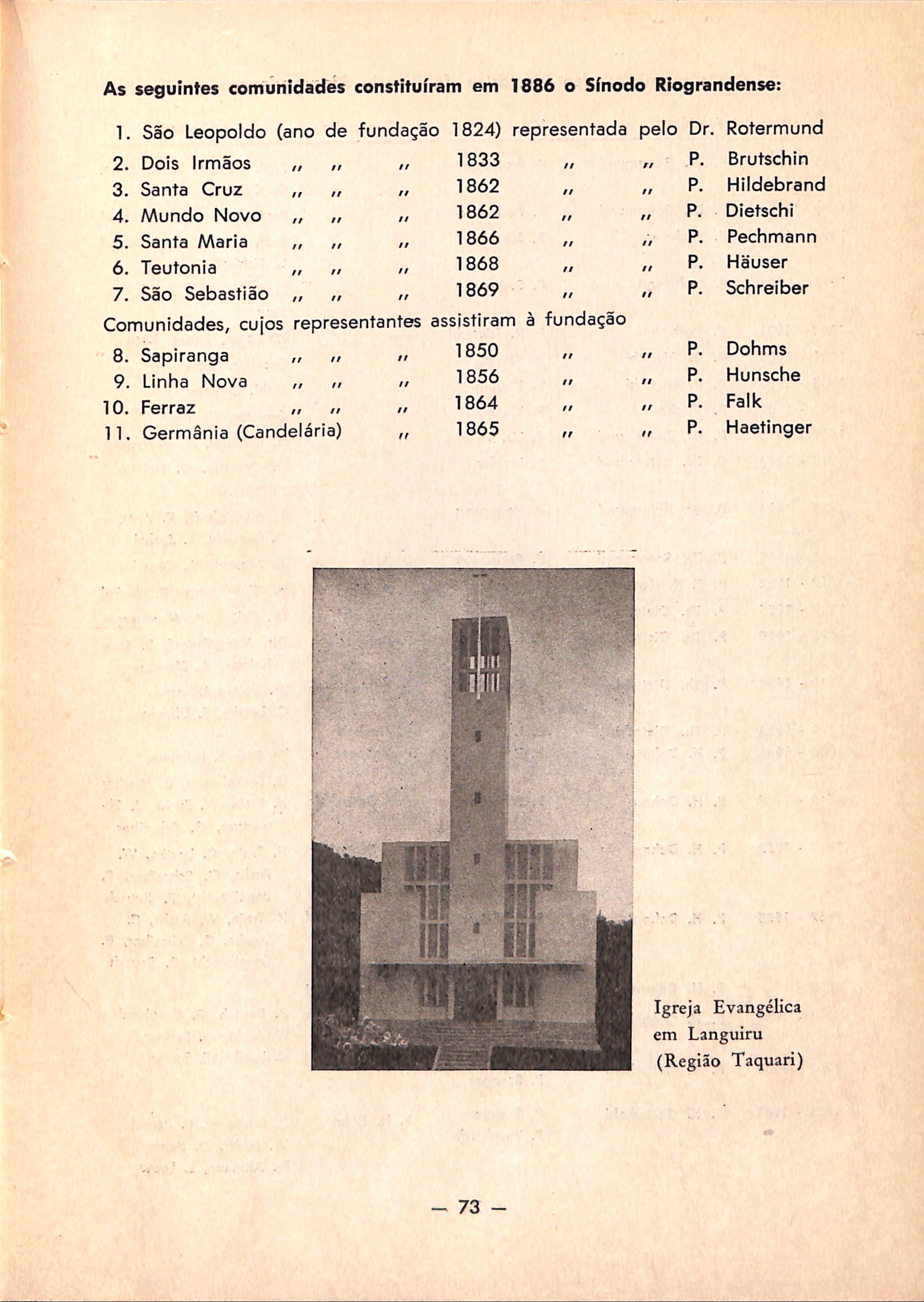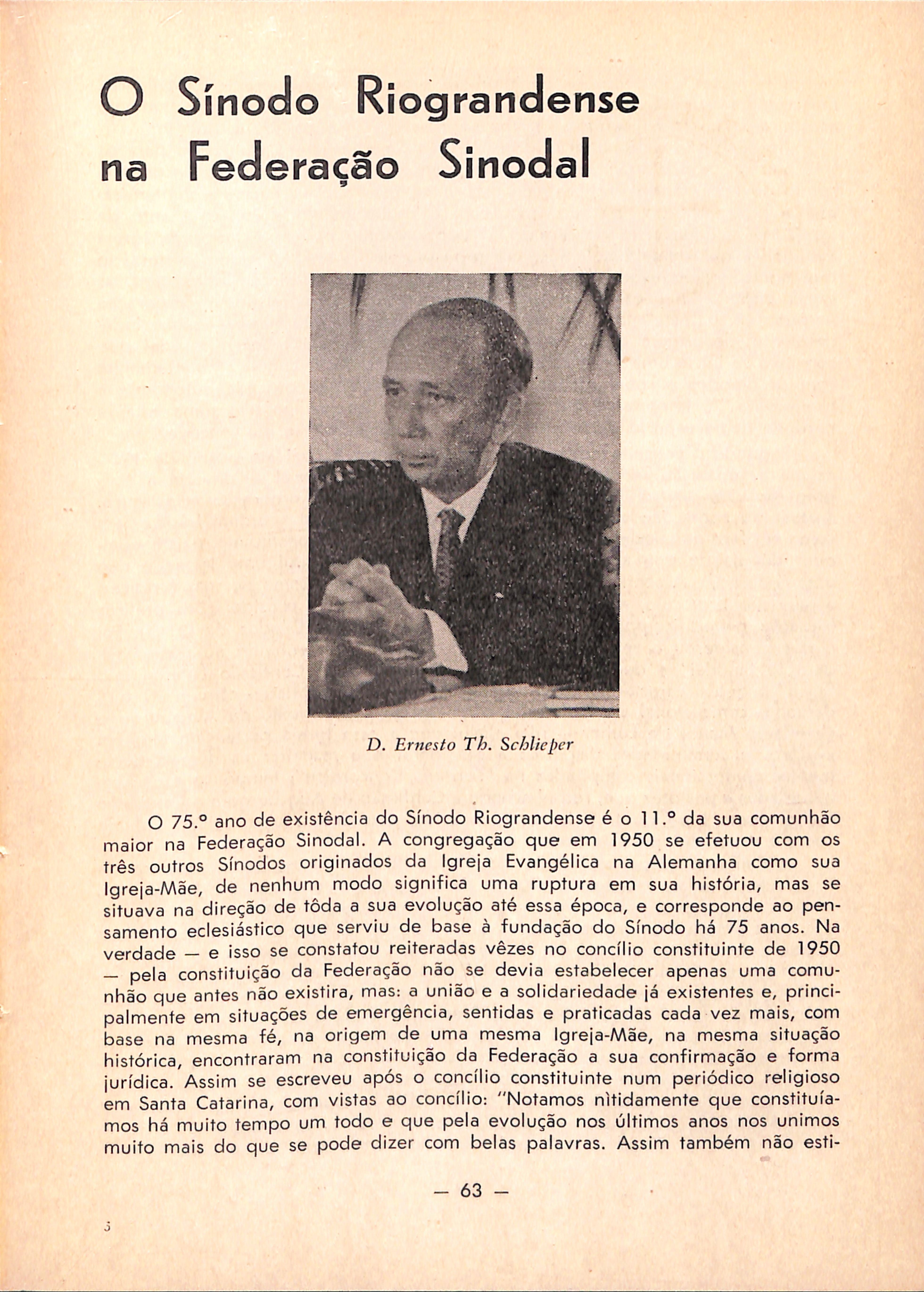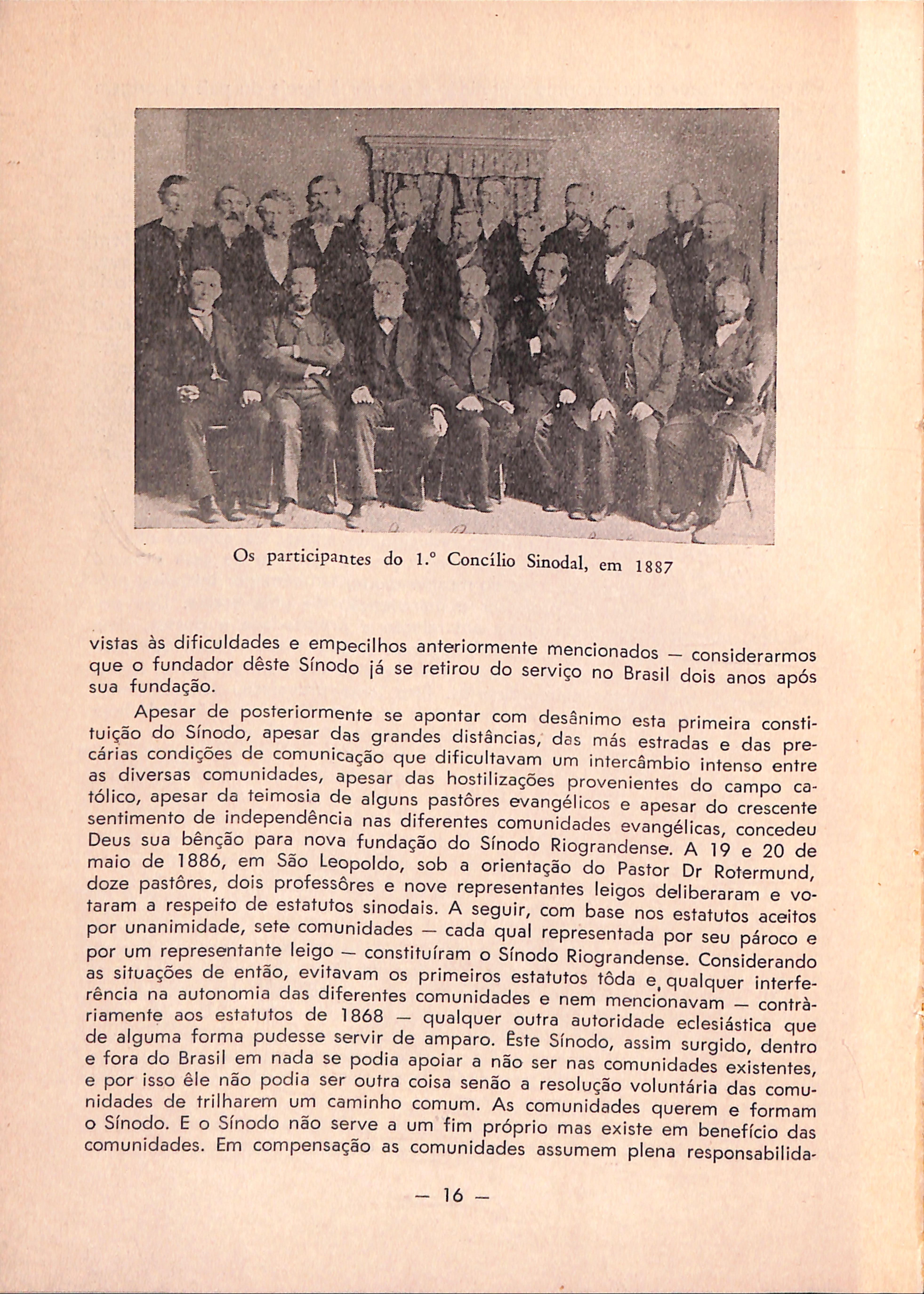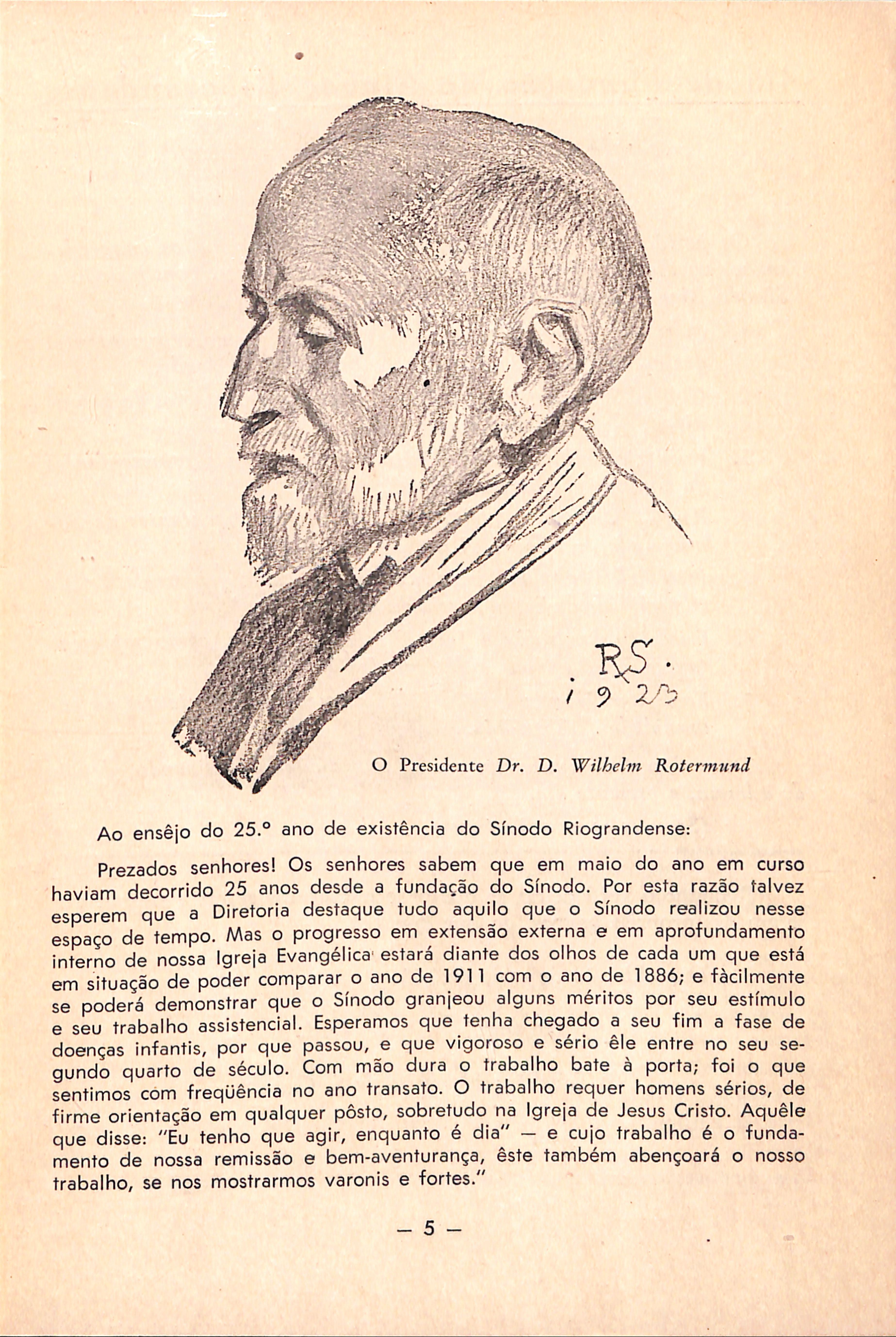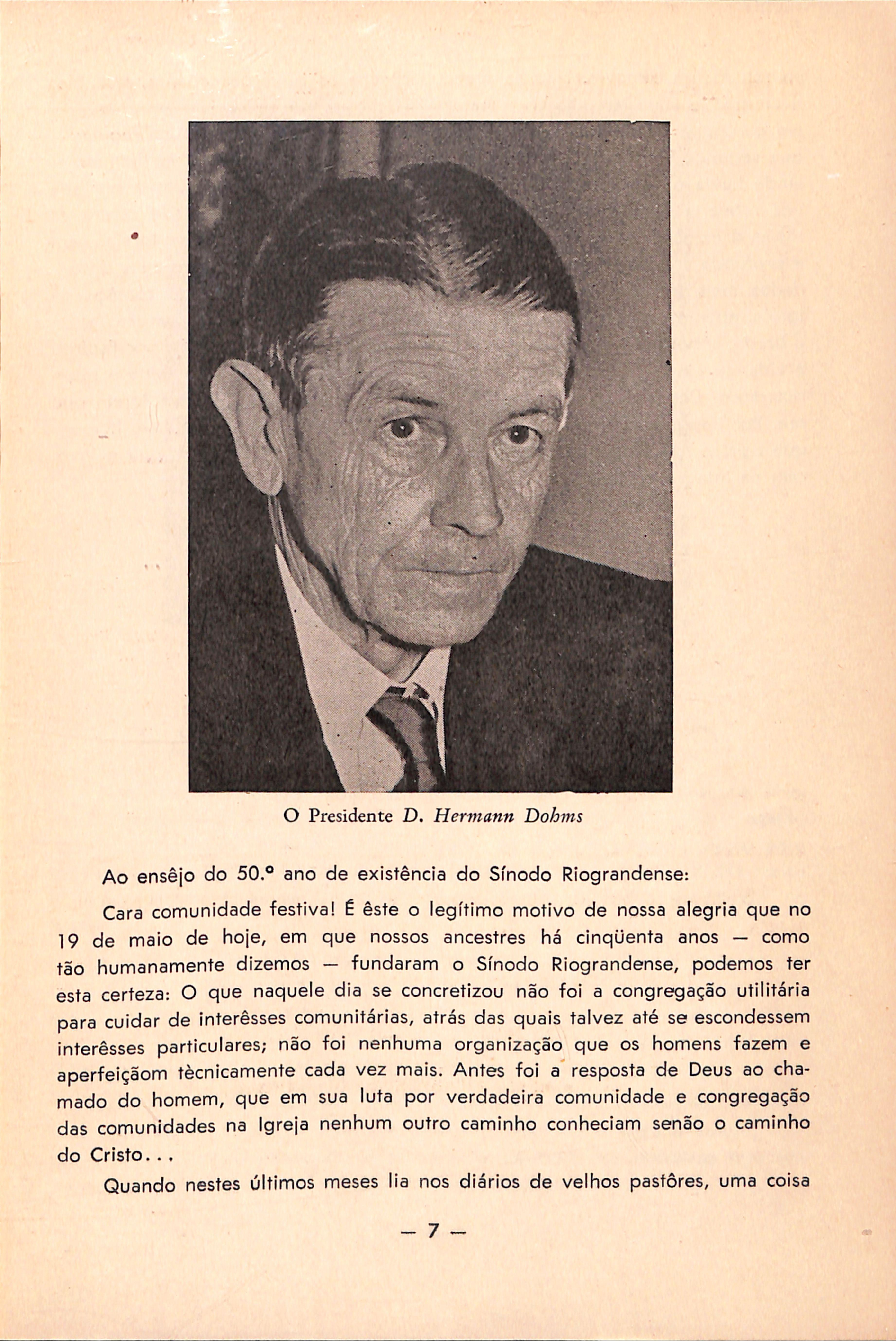 1. 2. 3. 4. 5. 6. 7.Ao ensêjo do 50.° ano de existência do Sínodo Riograndense: Cara comunidade festiva! É êste o legítimo motivo de nossa alegria que no 19 de maio de hoje, em que nossos ancestres há cinqüenta anos — como tão humanamente dizemos — fundaram o Sínodo Riograndense, podemos ter esta certeza: O que naquele dia se concretizou não foi a congregação utilitária cuidar de interêsses comunitárias, atrás das quais talvez até se escondessem para interêsses particulares; não foi nenhuma organização que os homens fazem e aperfeiçãom tècnicamente cada ado do homem, que em sua luta por verdadeira comunidade e congregação das comunidades na Igreja nenhum outro caminho conheciam senão o caminho