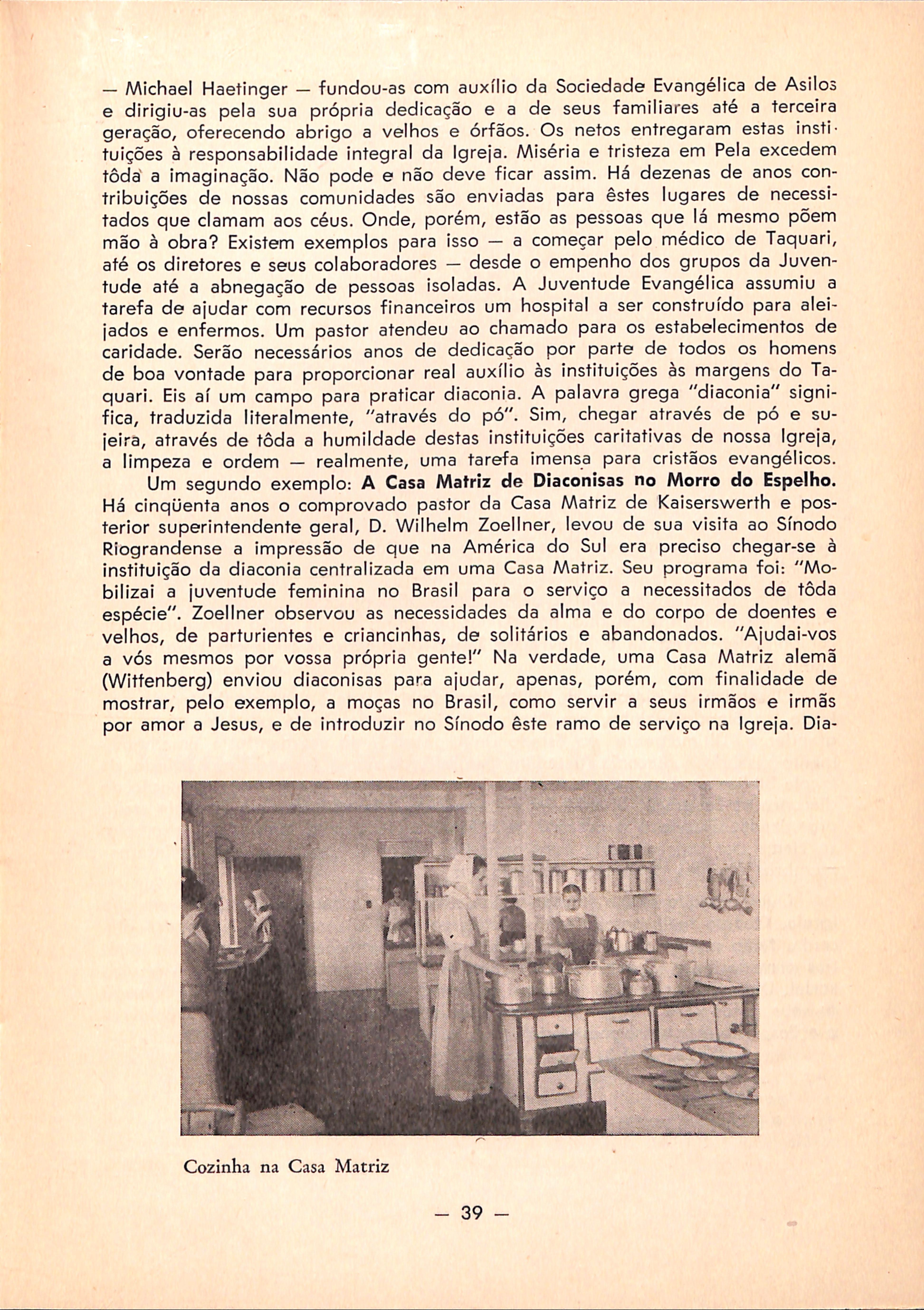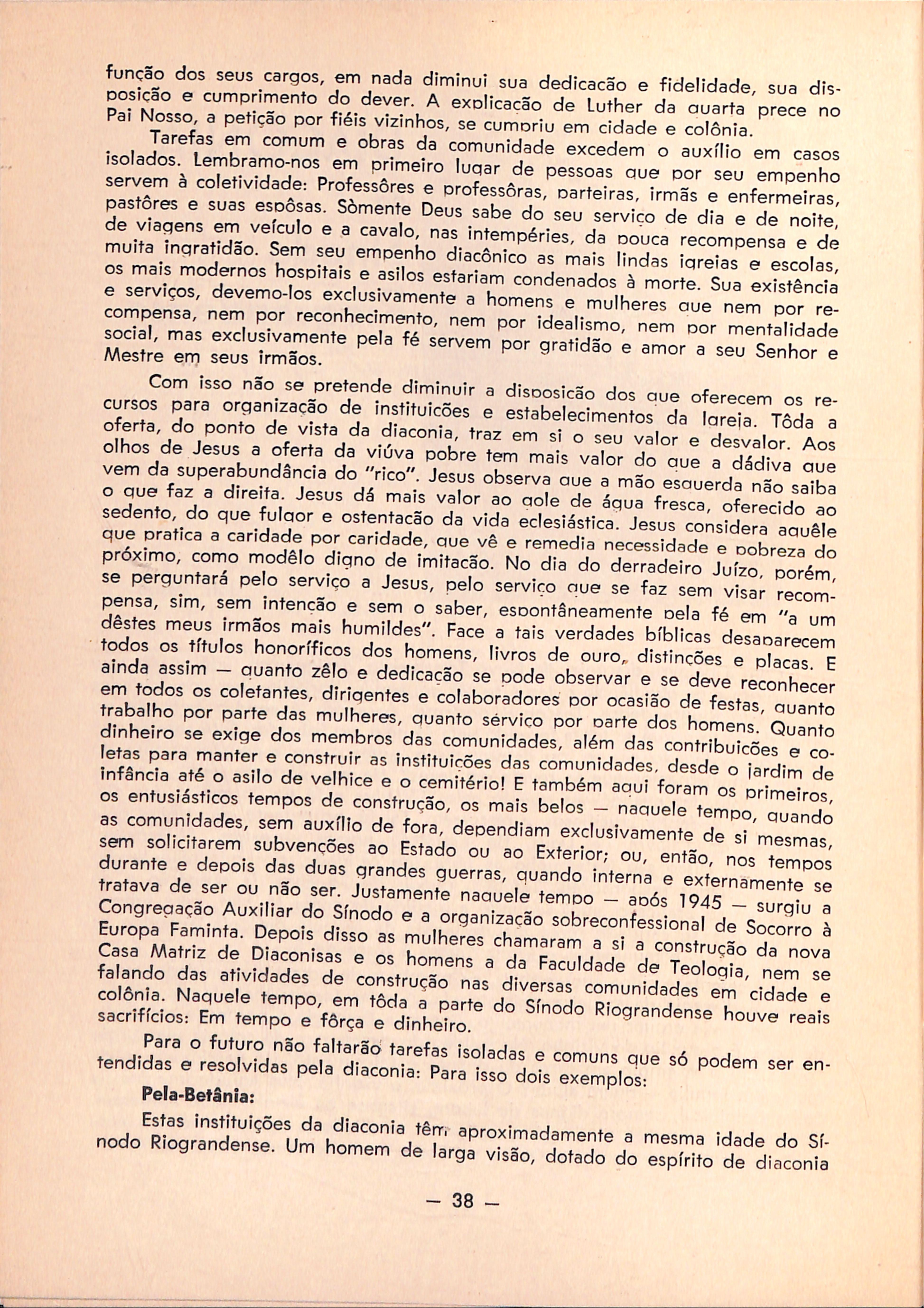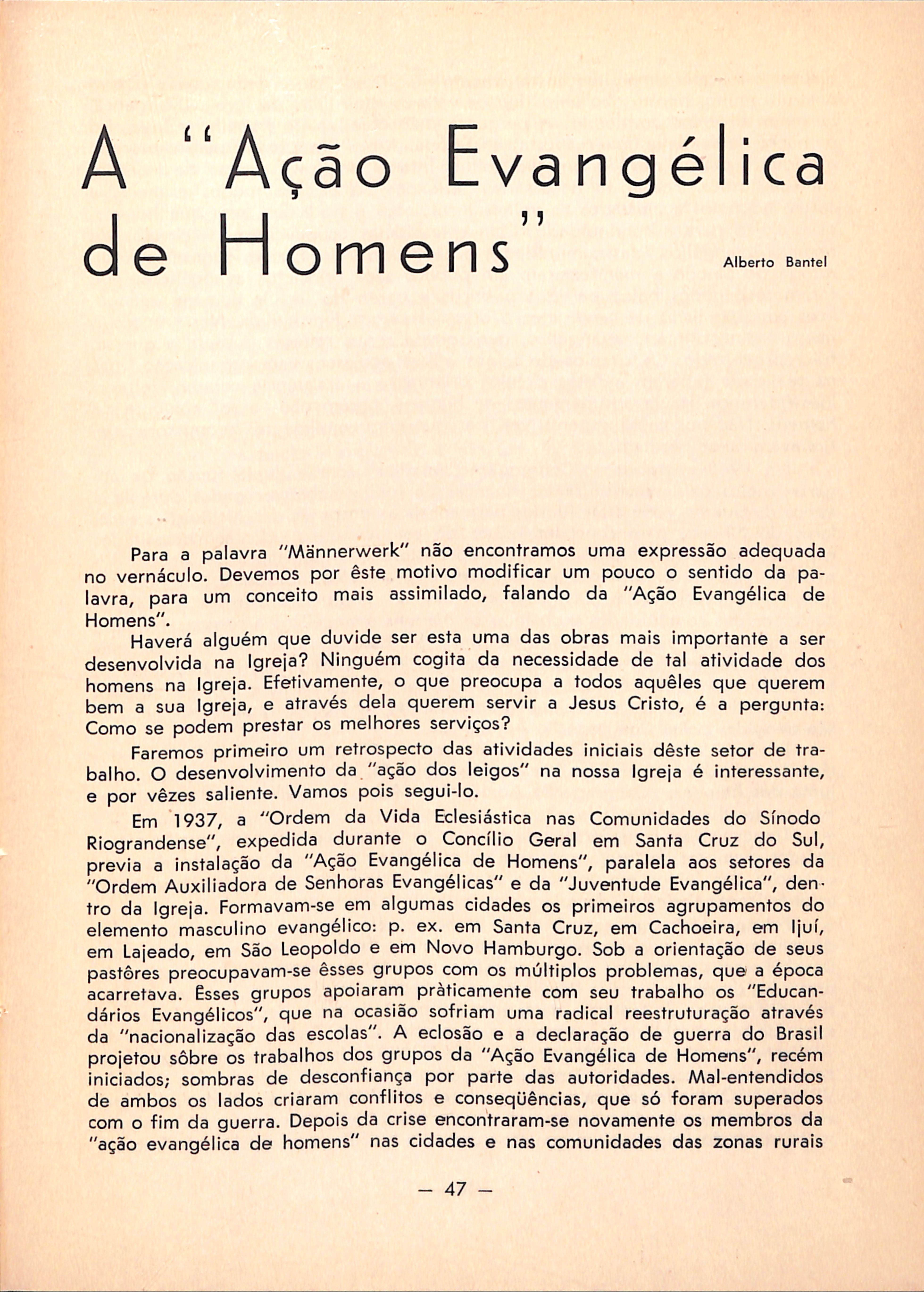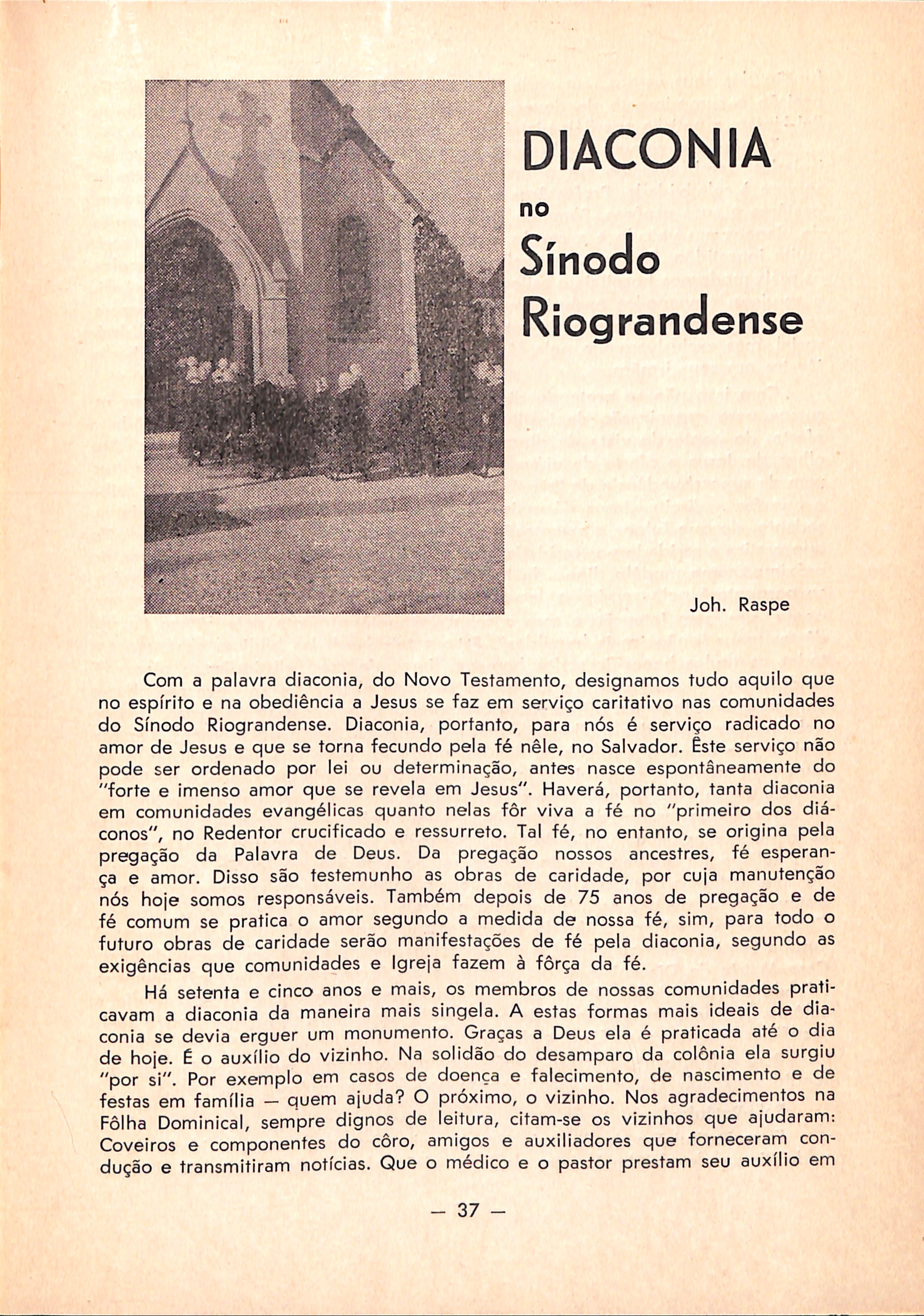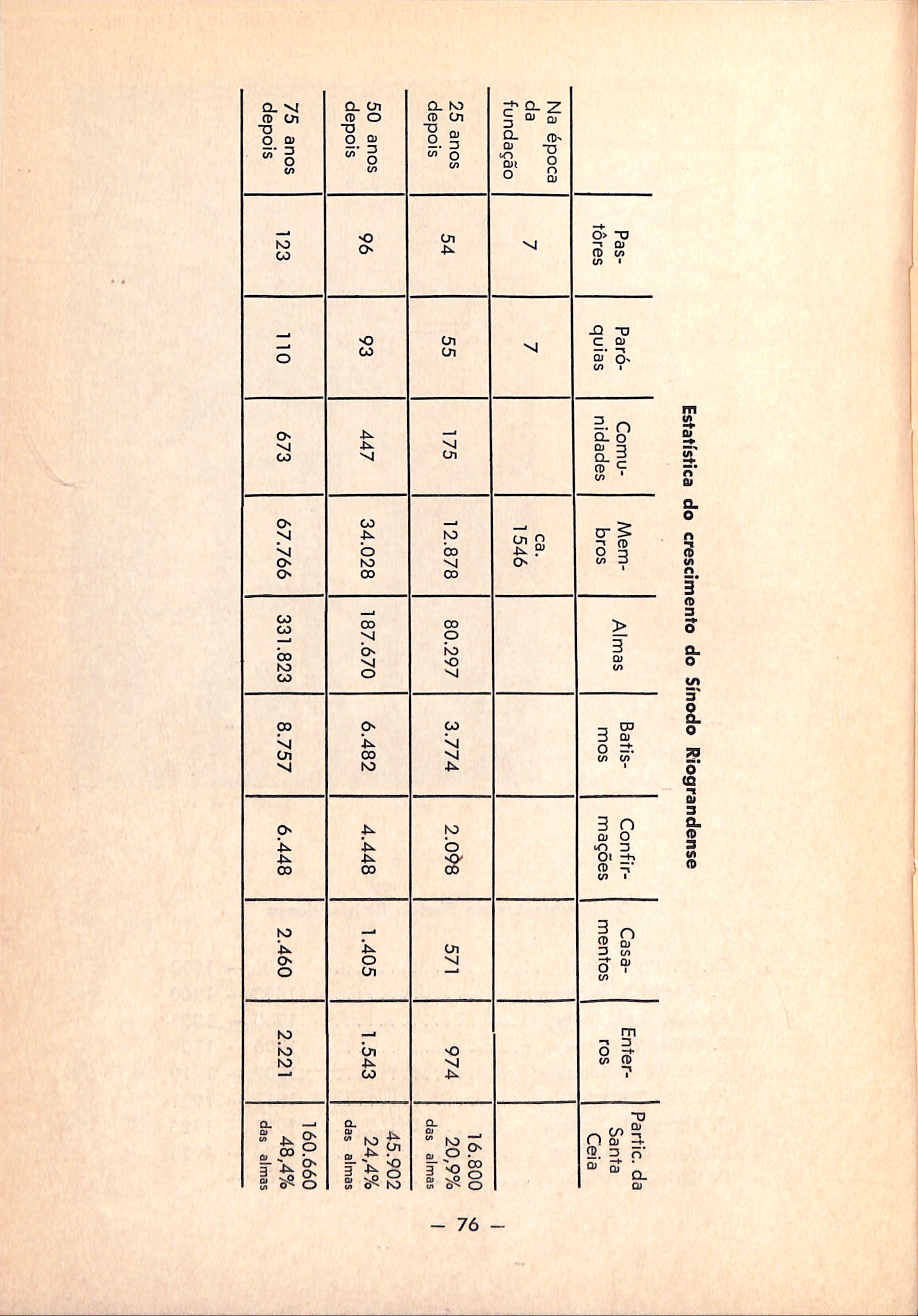 1. 2. 3. 4. 5. 6. 7.Ao ensêjo do 50.° ano de existência do Sínodo Riograndense: Cara comunidade festiva! É êste o legítimo motivo de nossa alegria que no 19 de maio de hoje, em que nossos ancestres há cinqüenta anos — como tão humanamente dizemos — fundaram o Sínodo Riograndense, podemos ter esta certeza: O que naquele dia se concretizou não foi a congregação utilitária cuidar de interêsses comunitárias, atrás das quais talvez até se escondessem para interêsses particulares; não foi nenhuma organização que os homens fazem e aperfeiçãom tècnicamente cada ado do homem, que em sua luta por verdadeira comunidade e congregação das comunidades na Igreja nenhum outro caminho conheciam senão o caminho