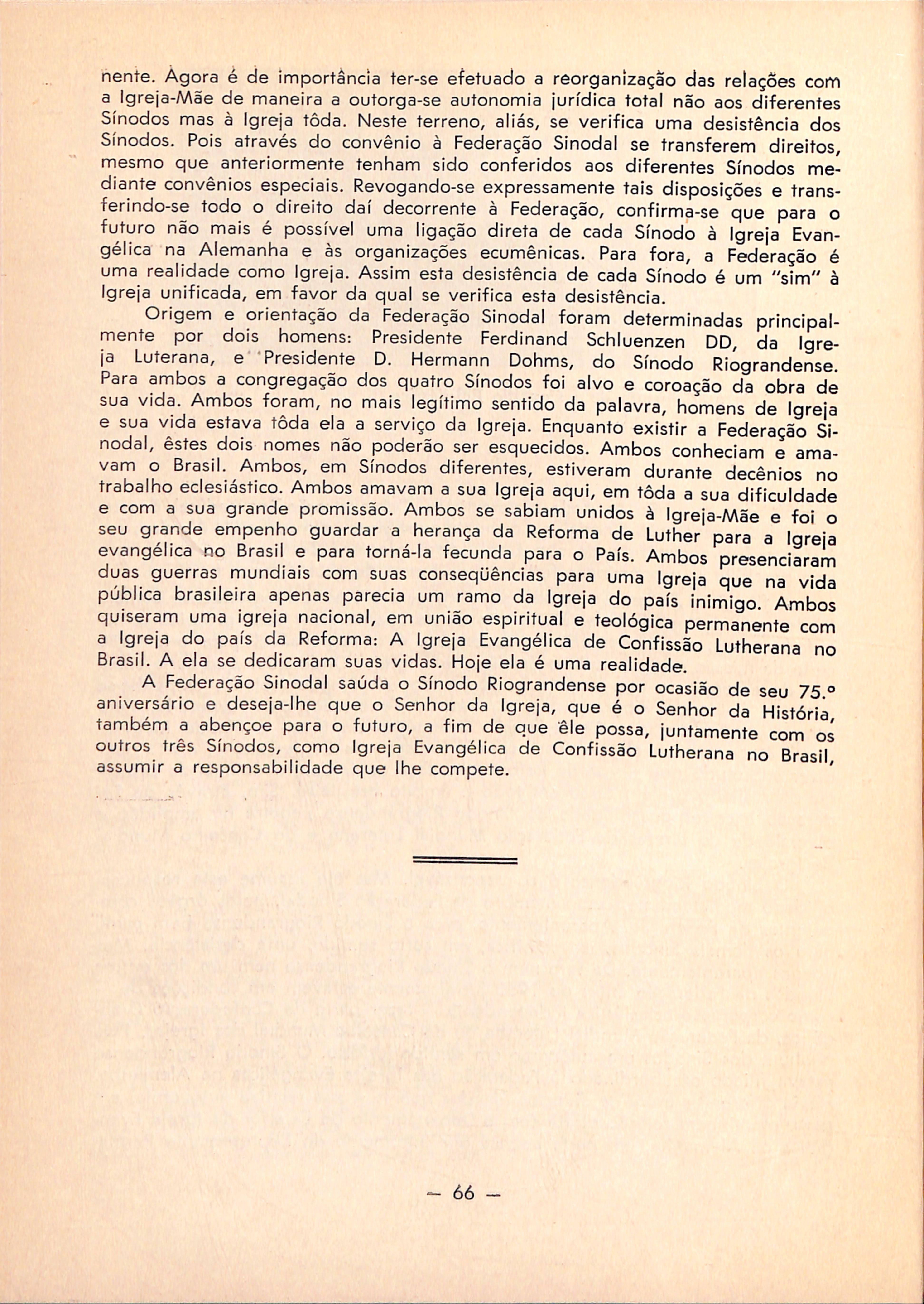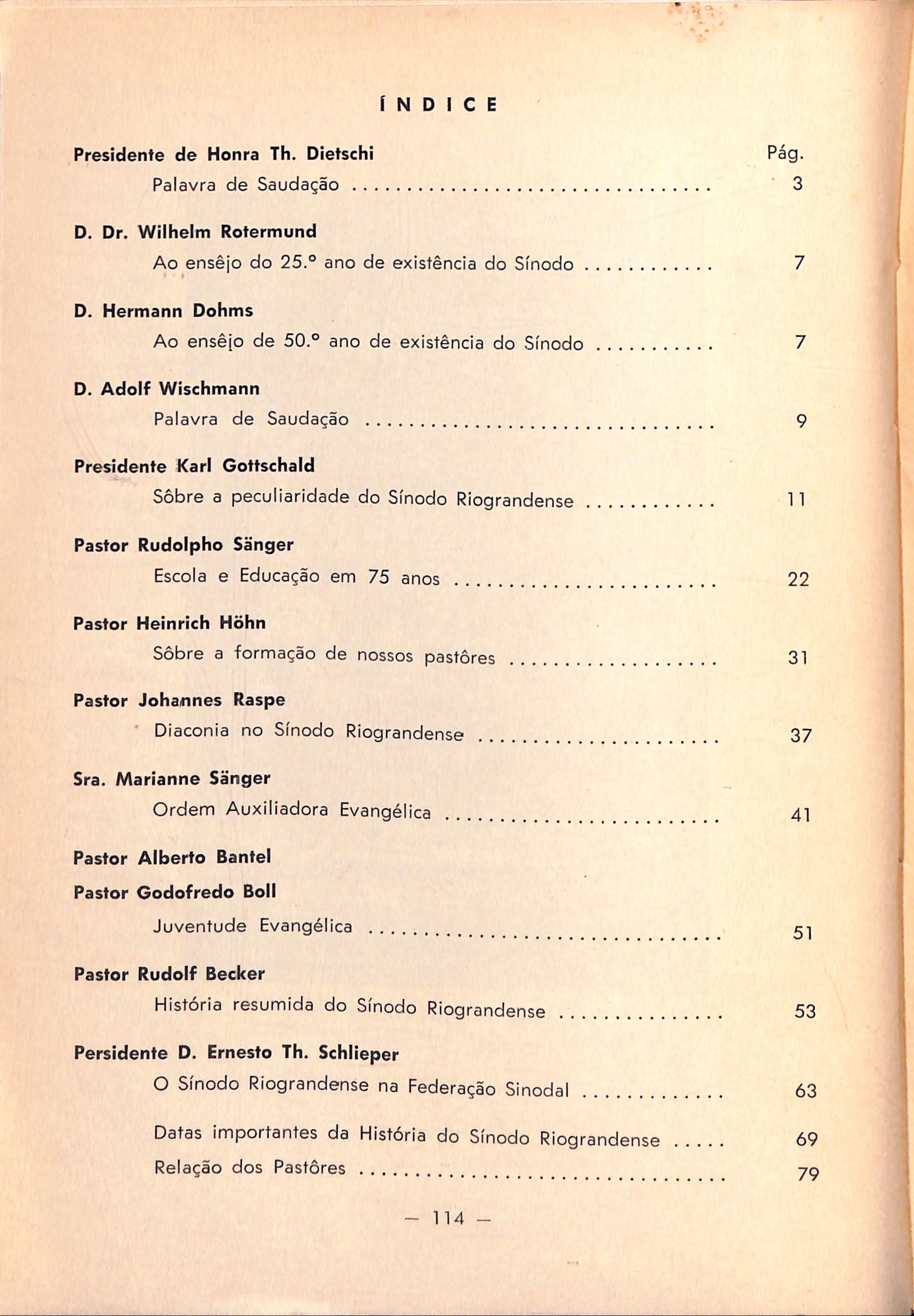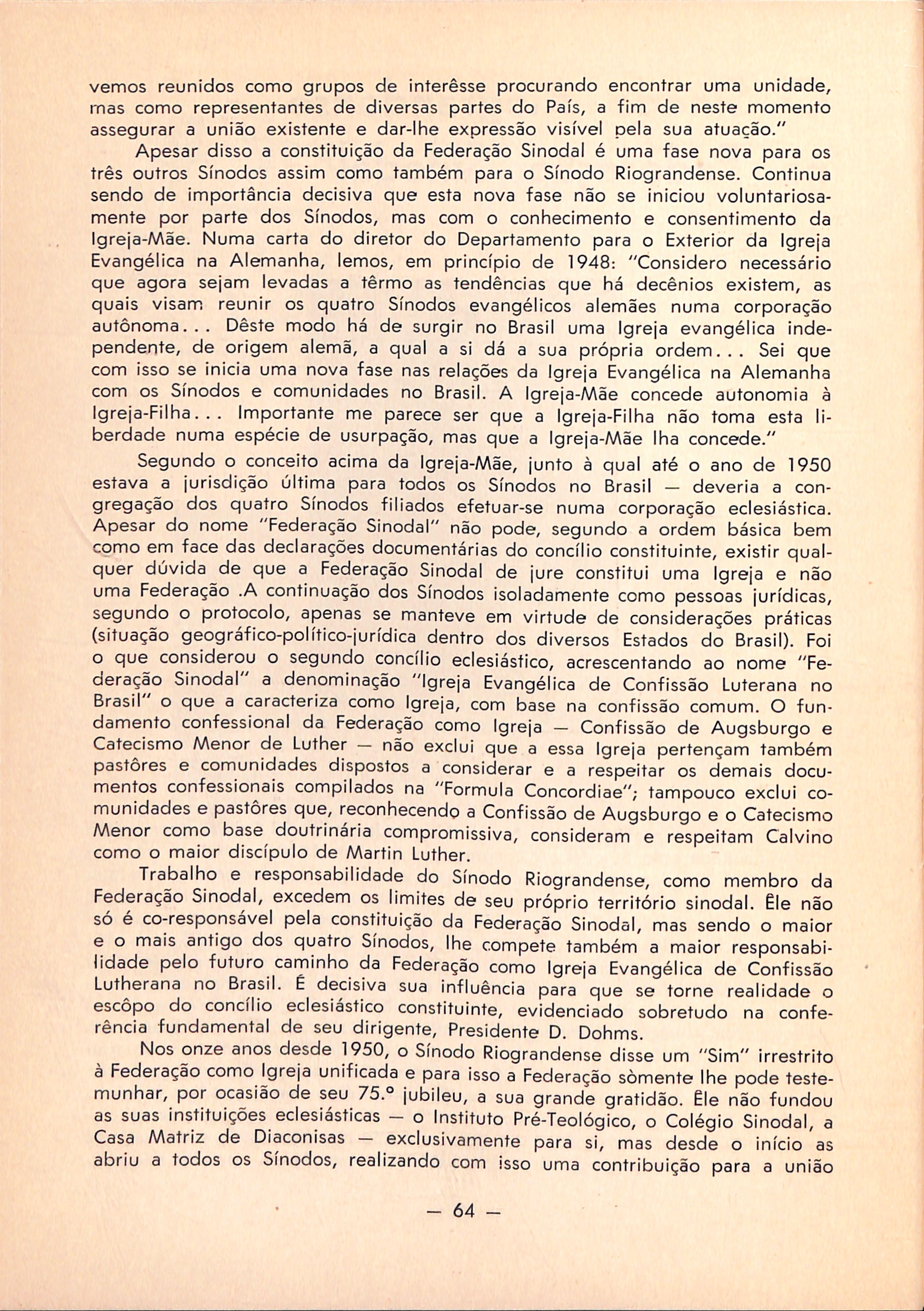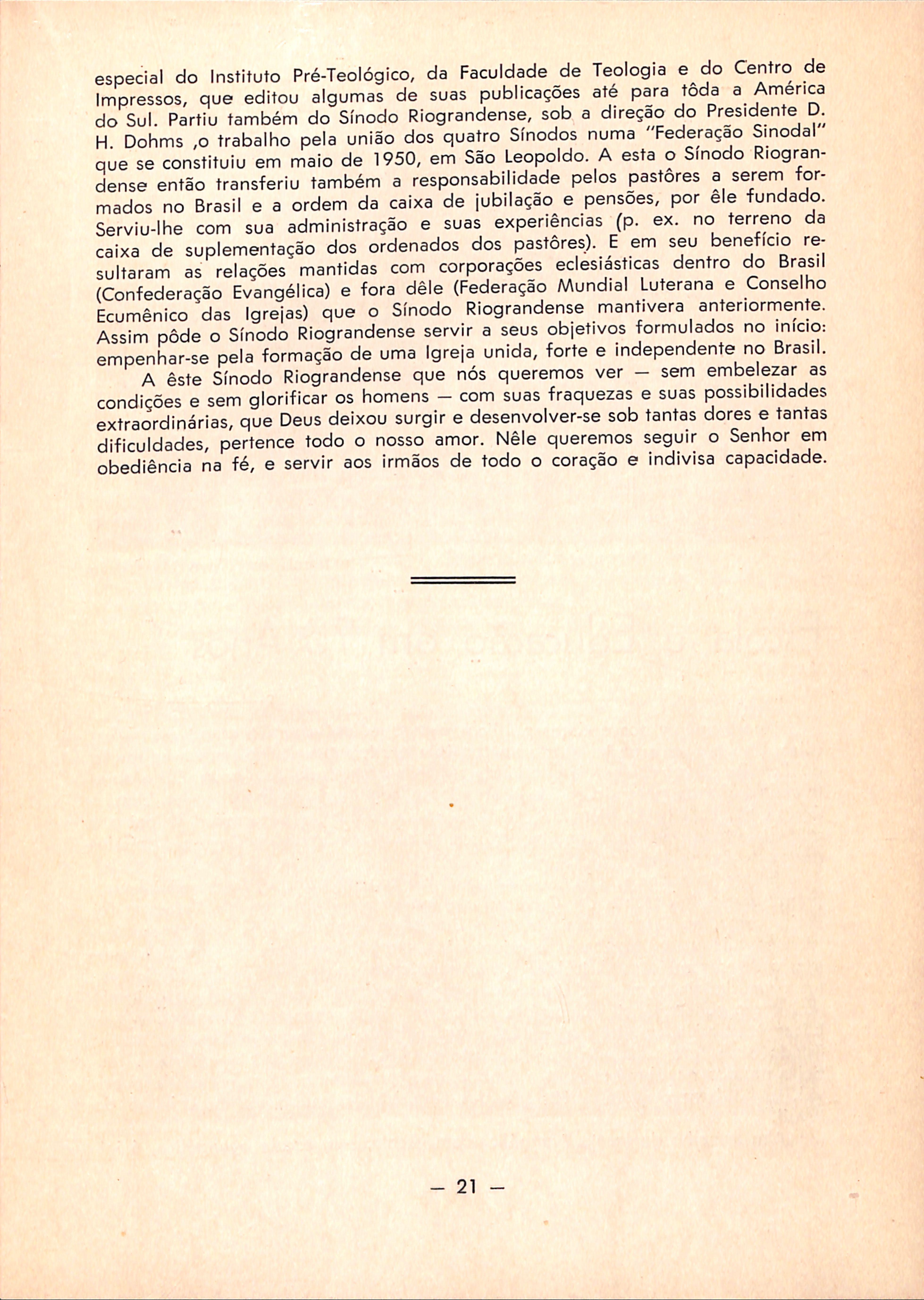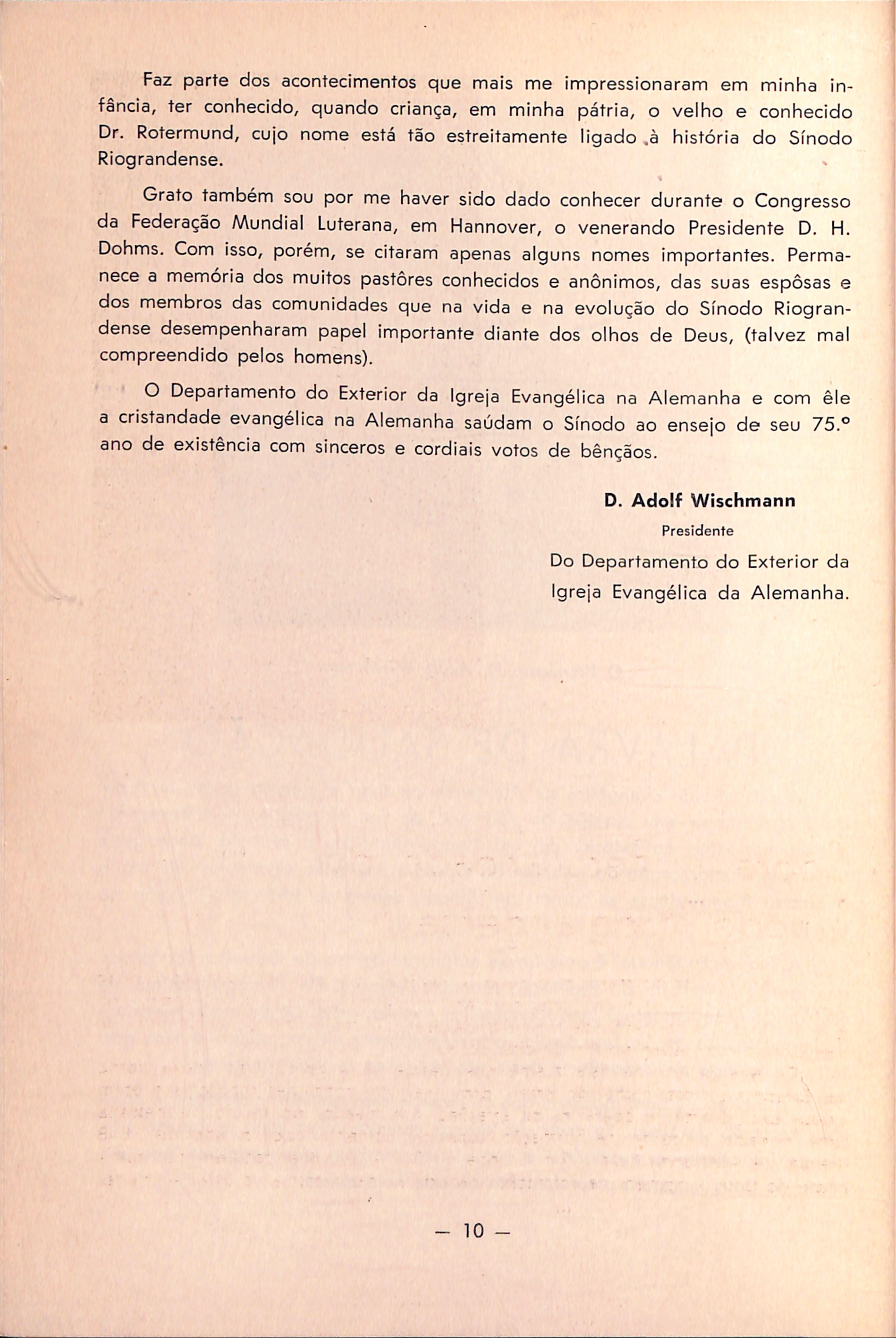 Grato também sou por me haver sido dado conhecer durante o Congresso da Federação Mundial Luterana, em Hannover, o venerando Presidente D. H. Dohms. Com isso, porém, se citaram apenas alguns nomes importantes. Perma nece a memória dos muitos pastores conhecidos e anônimos, das suas espôsas e dos membros das comunidades que na vida e na evolução do Sínodo Riogran dense desempenharam papel importante diante dos olhos de Deus, (talvez mal compreendido pelos homens).