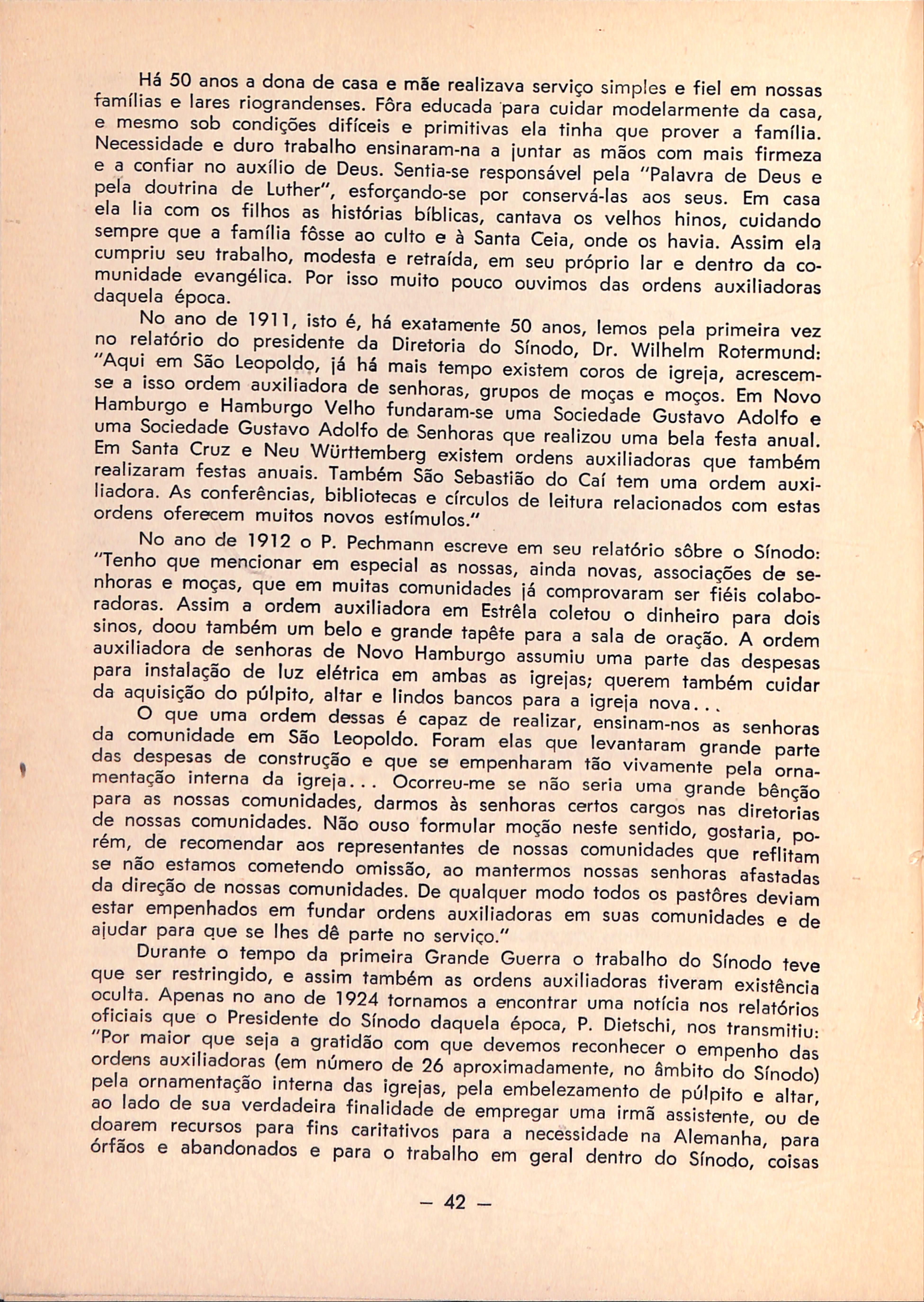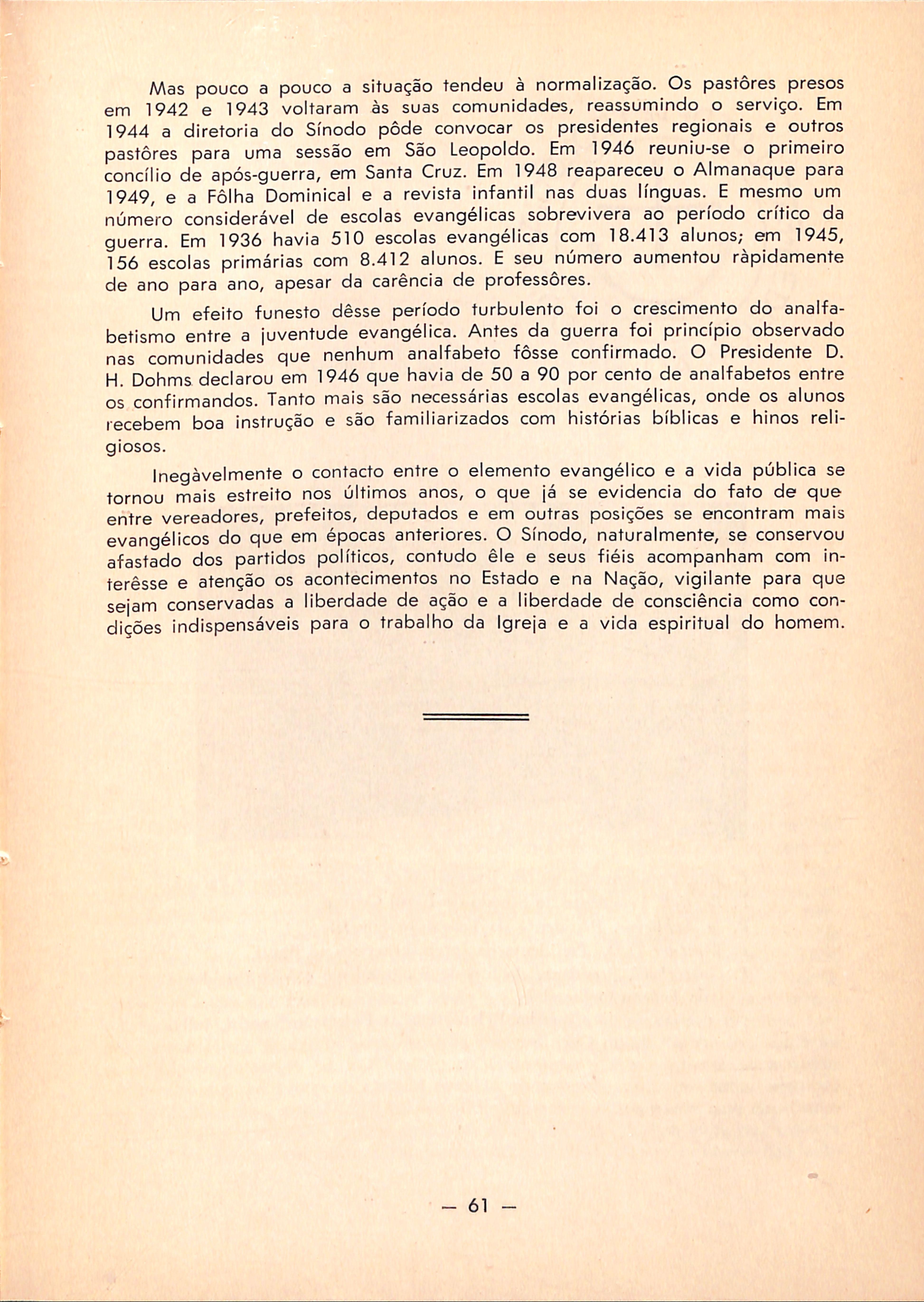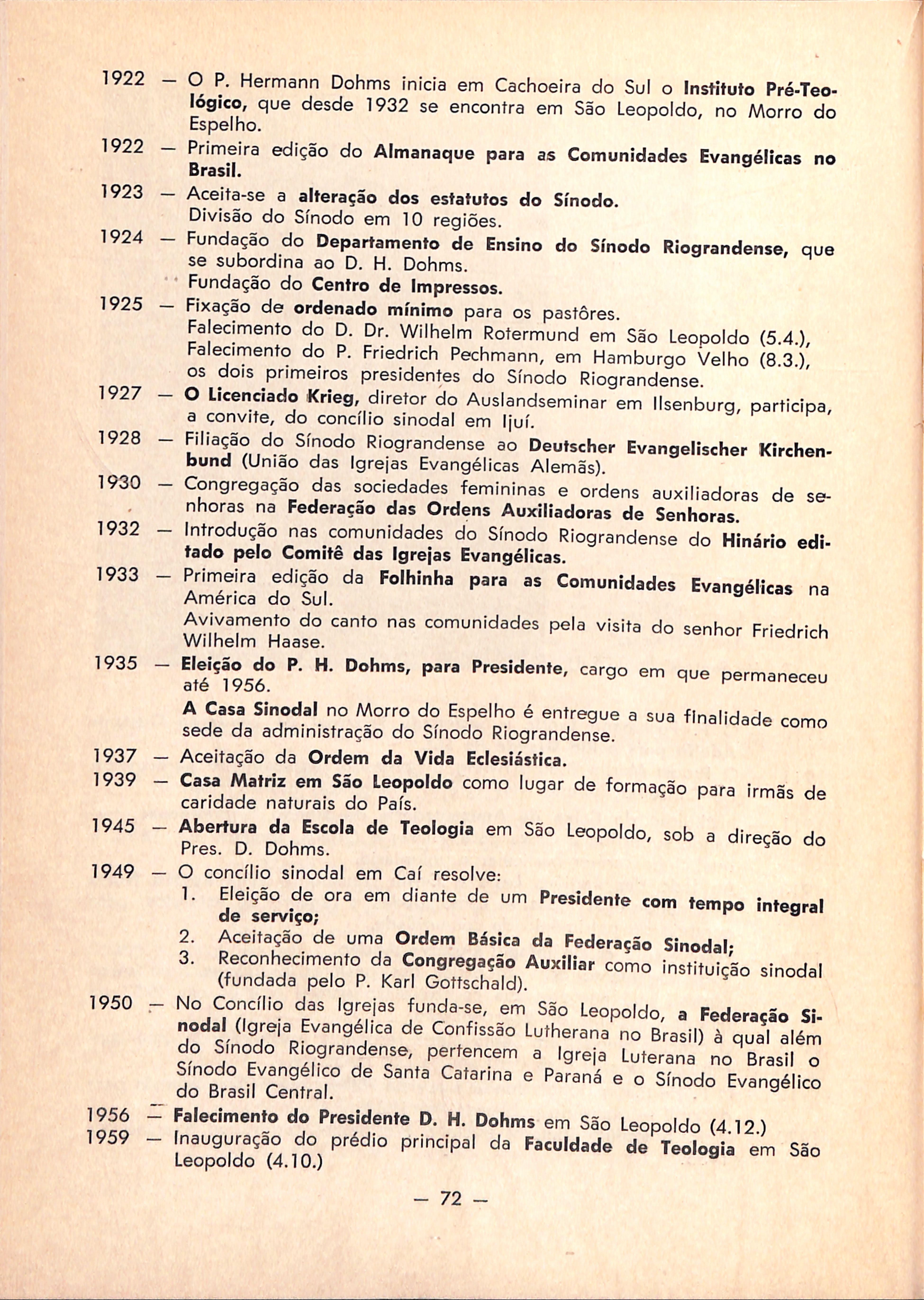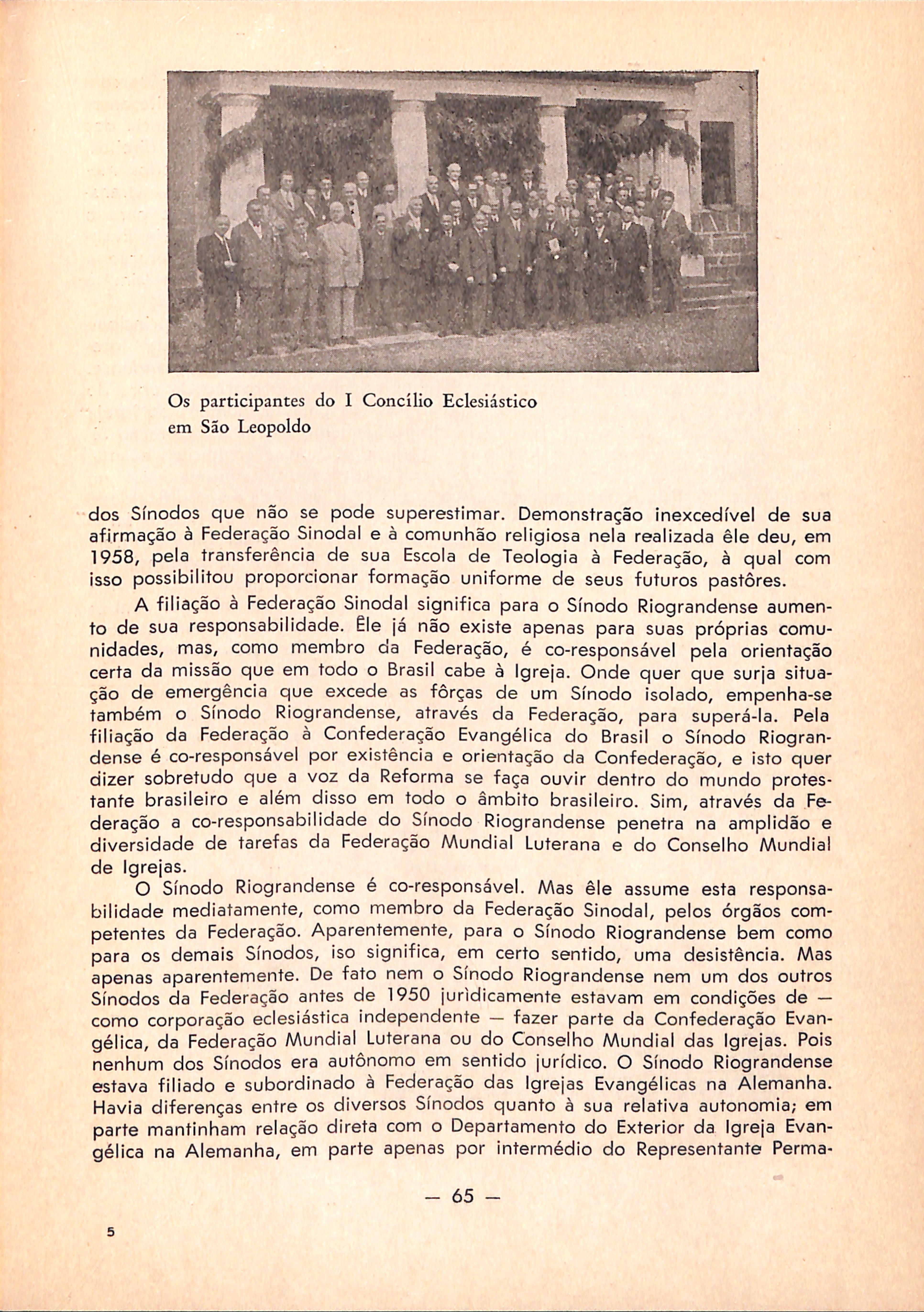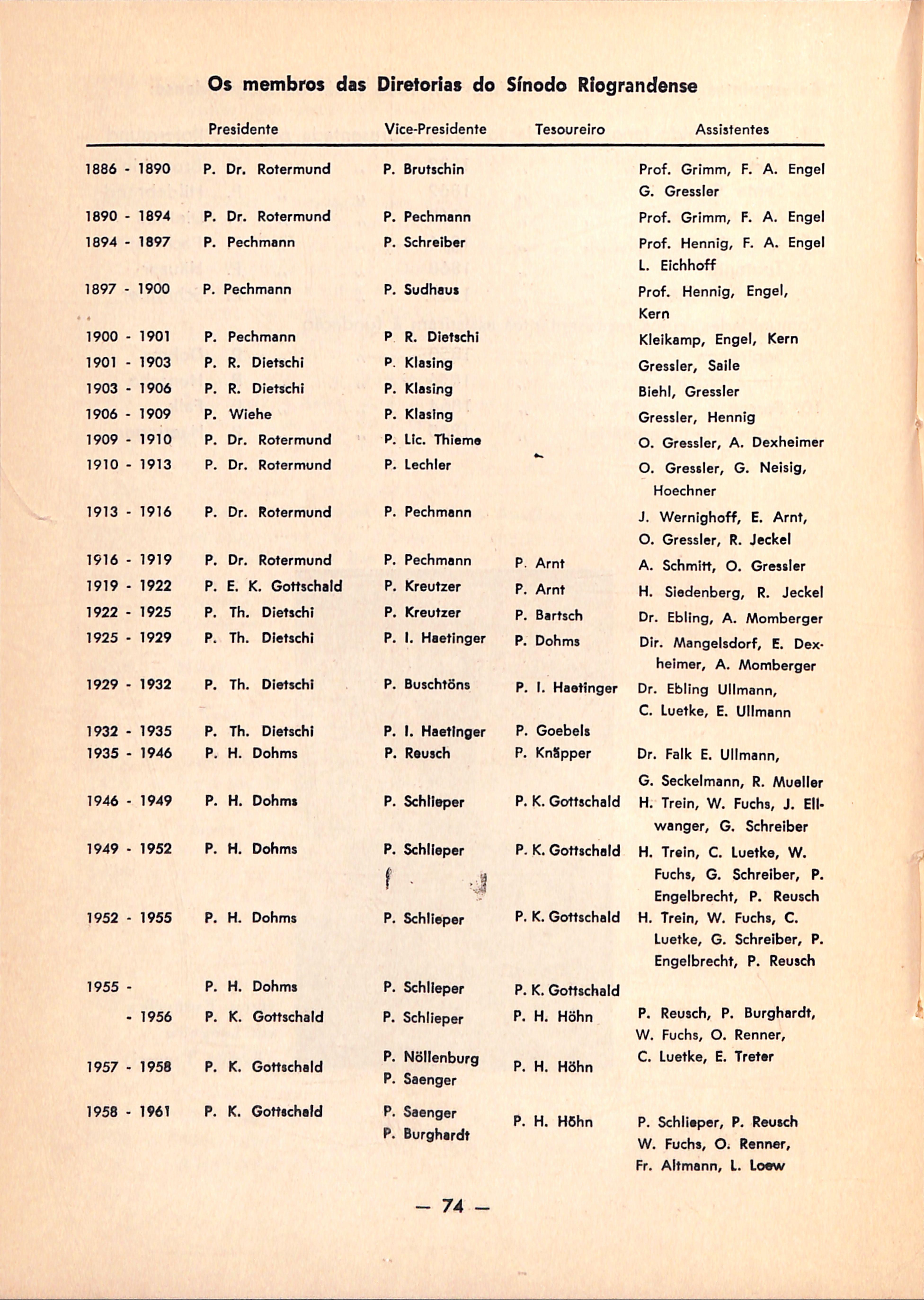 Grato também sou por me haver sido dado conhecer durante o Congresso da Federação Mundial Luterana, em Hannover, o venerando Presidente D. H. Dohms. Com isso, porém, se citaram apenas alguns nomes importantes. Perma nece a memória dos muitos pastores conhecidos e anônimos, das suas espôsas e dos membros das comunidades que na vida e na evolução do Sínodo Riogran dense desempenharam papel importante diante dos olhos de Deus, (talvez mal compreendido pelos homens).