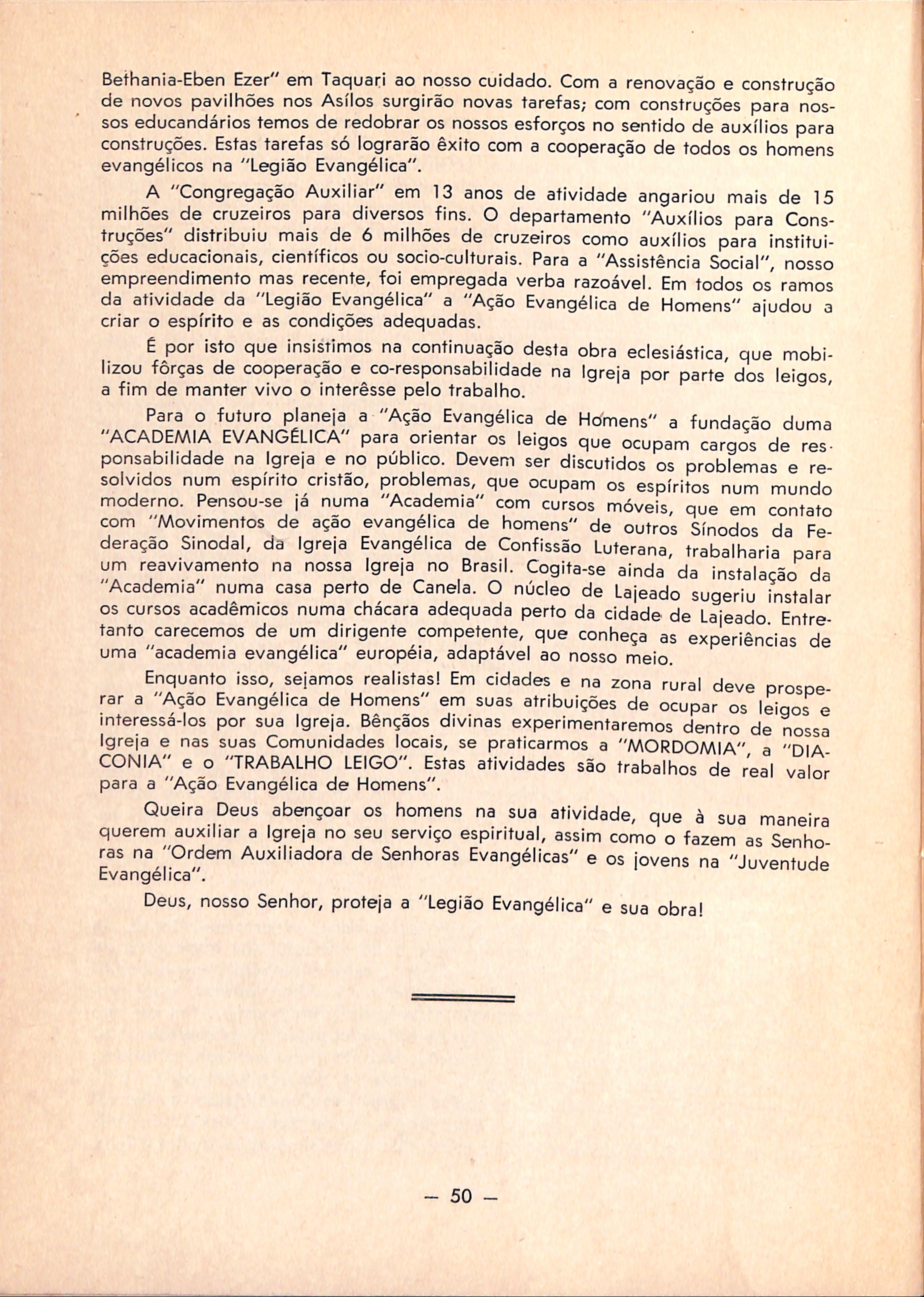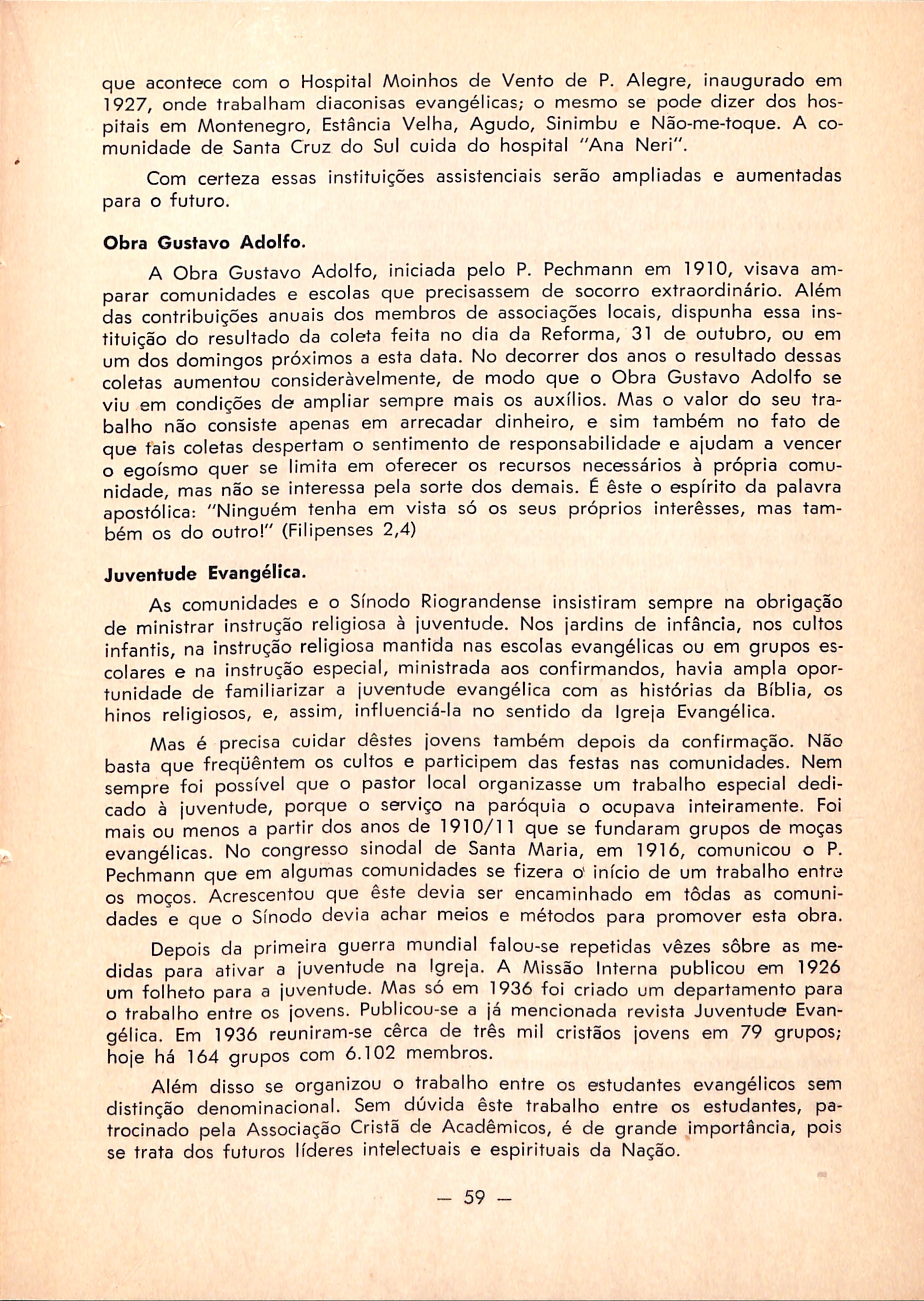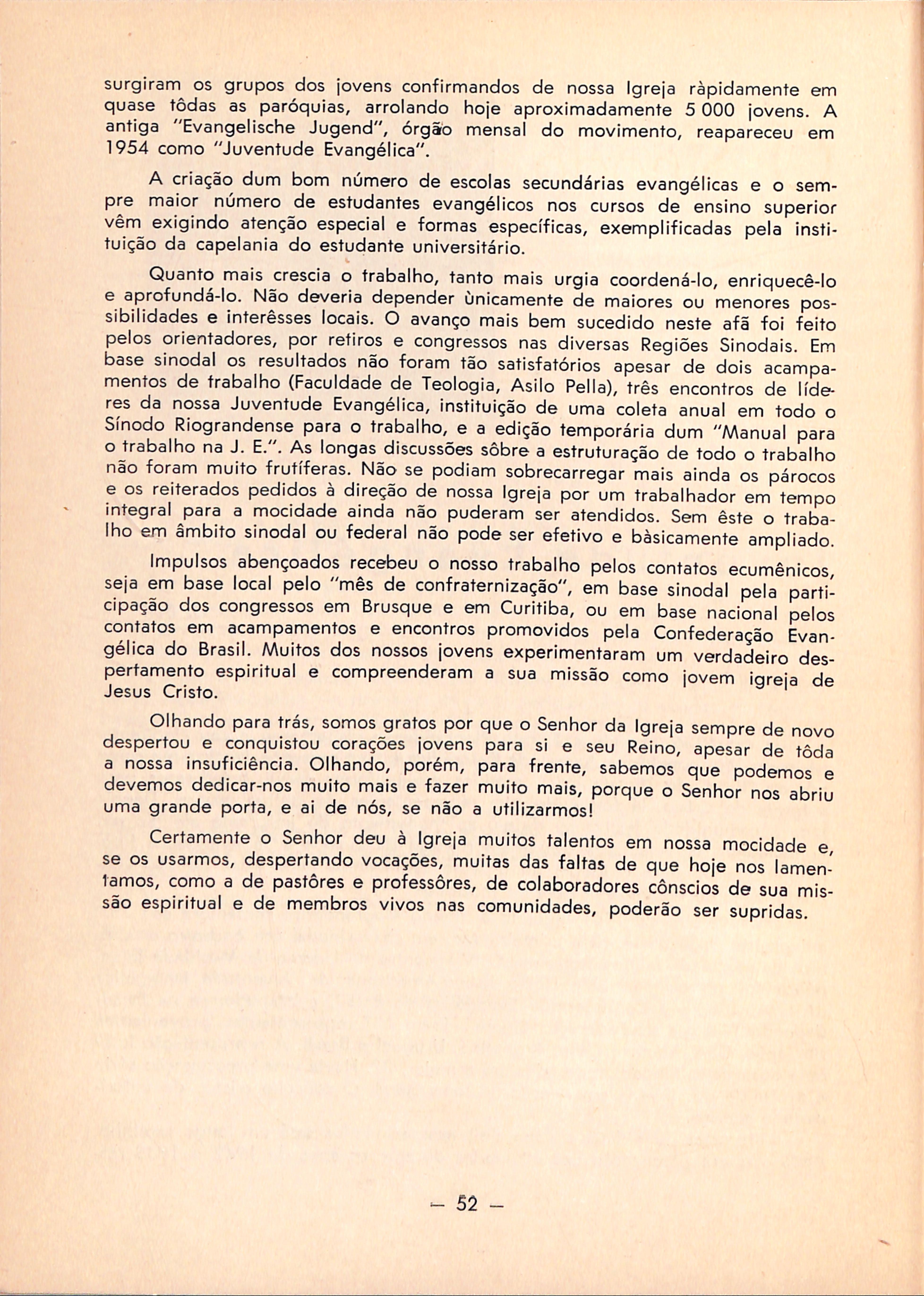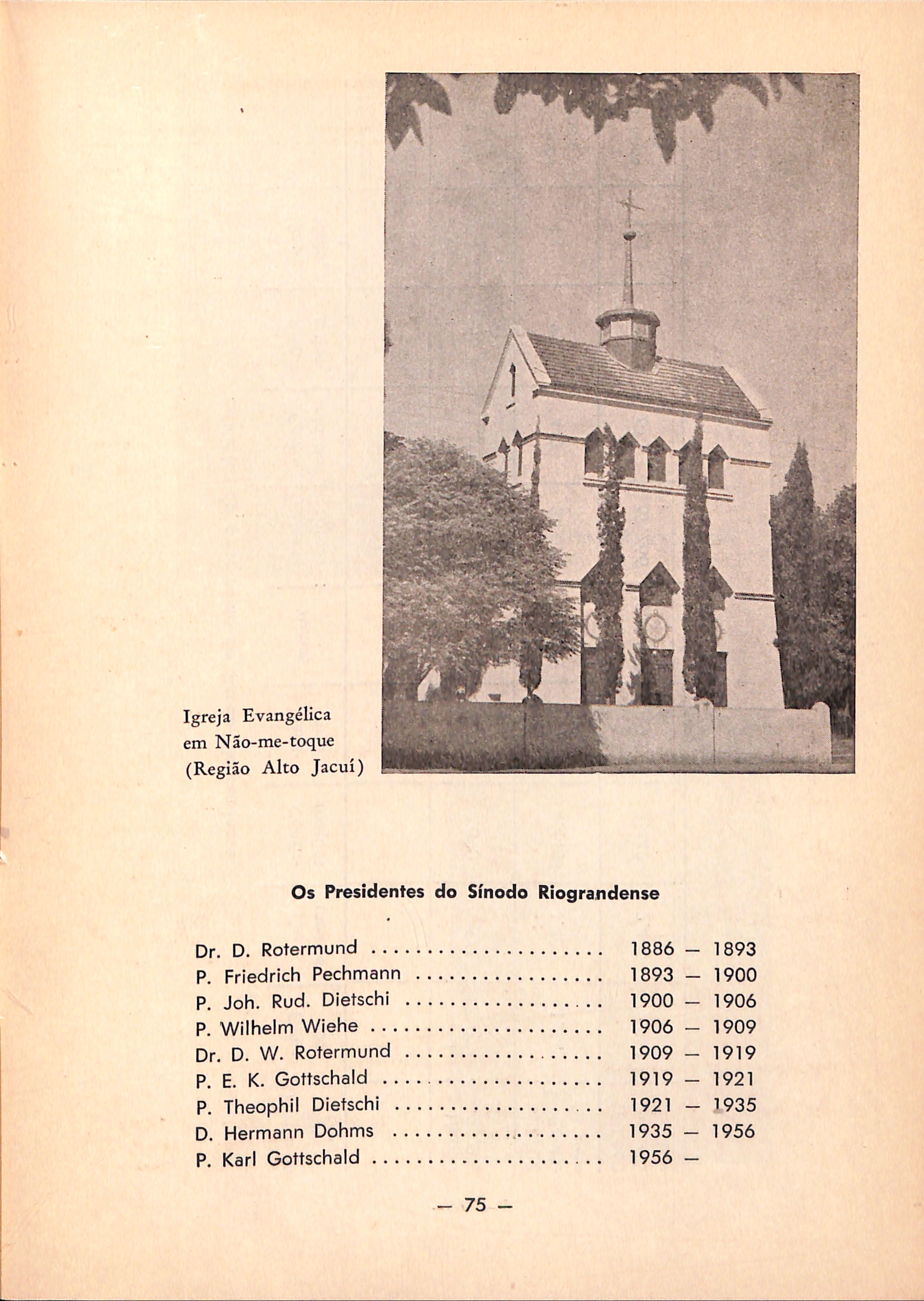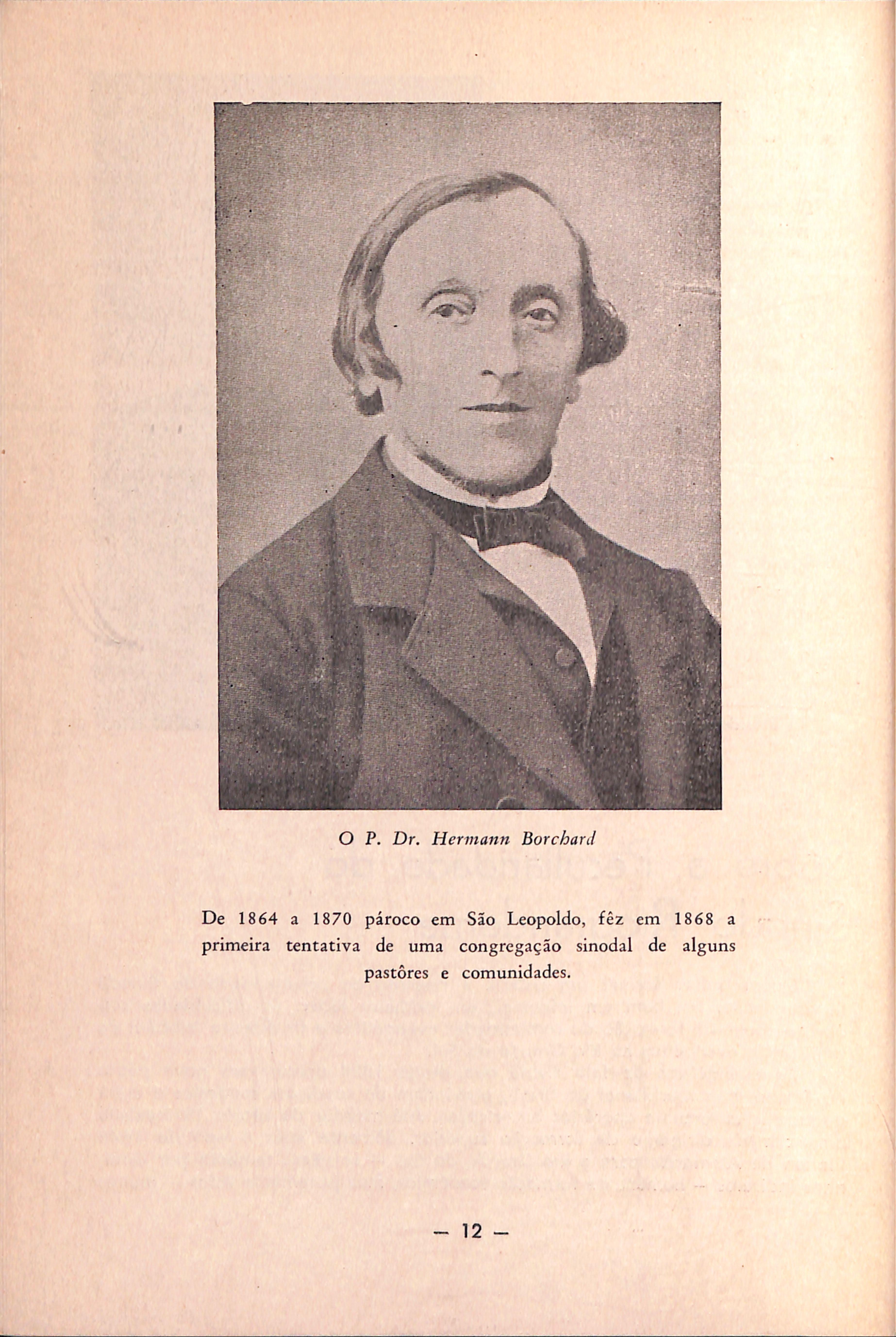 Grato também sou por me haver sido dado conhecer durante o Congresso da Federação Mundial Luterana, em Hannover, o venerando Presidente D. H. Dohms. Com isso, porém, se citaram apenas alguns nomes importantes. Perma nece a memória dos muitos pastores conhecidos e anônimos, das suas espôsas e dos membros das comunidades que na vida e na evolução do Sínodo Riogran dense desempenharam papel importante diante dos olhos de Deus, (talvez mal compreendido pelos homens).