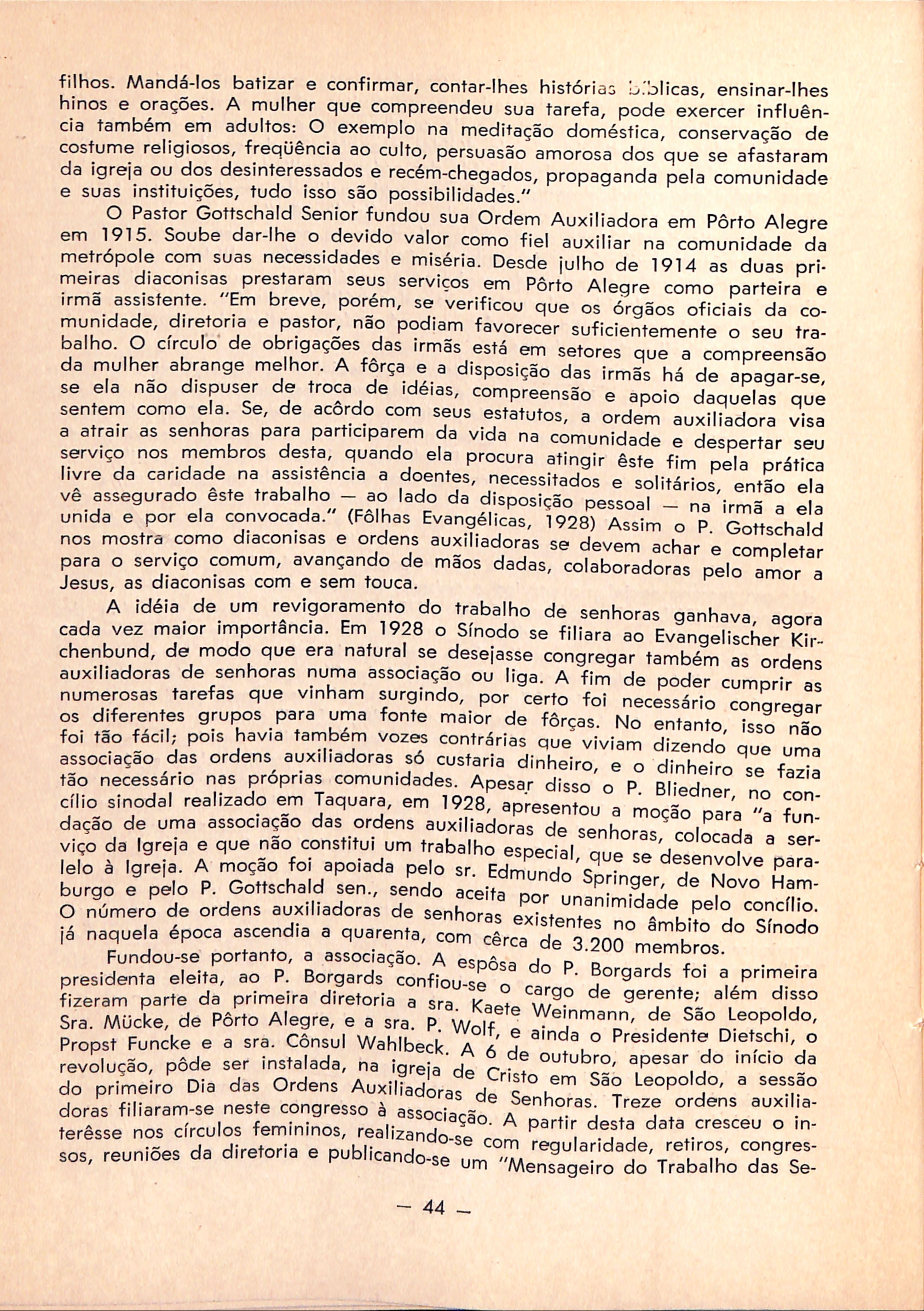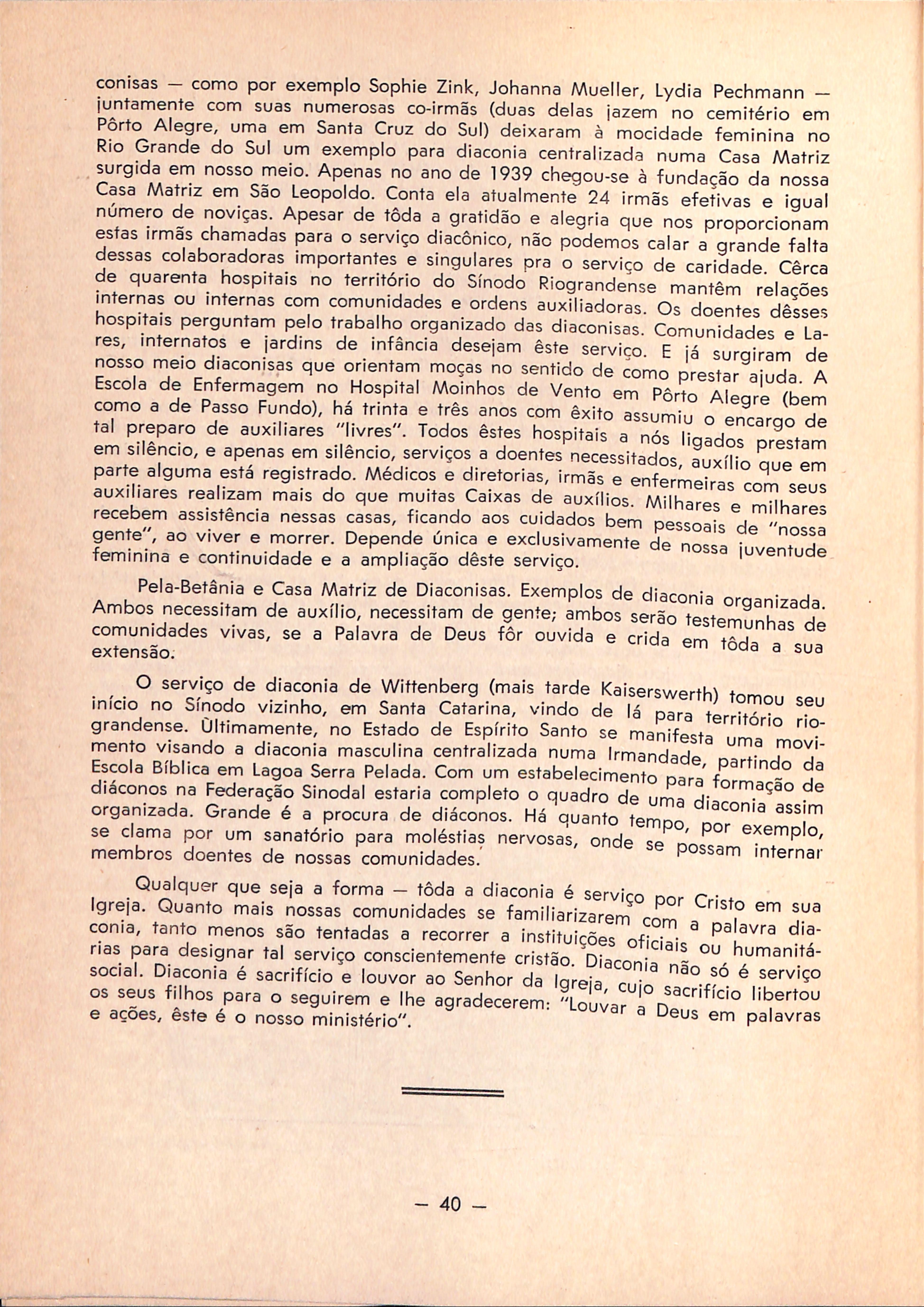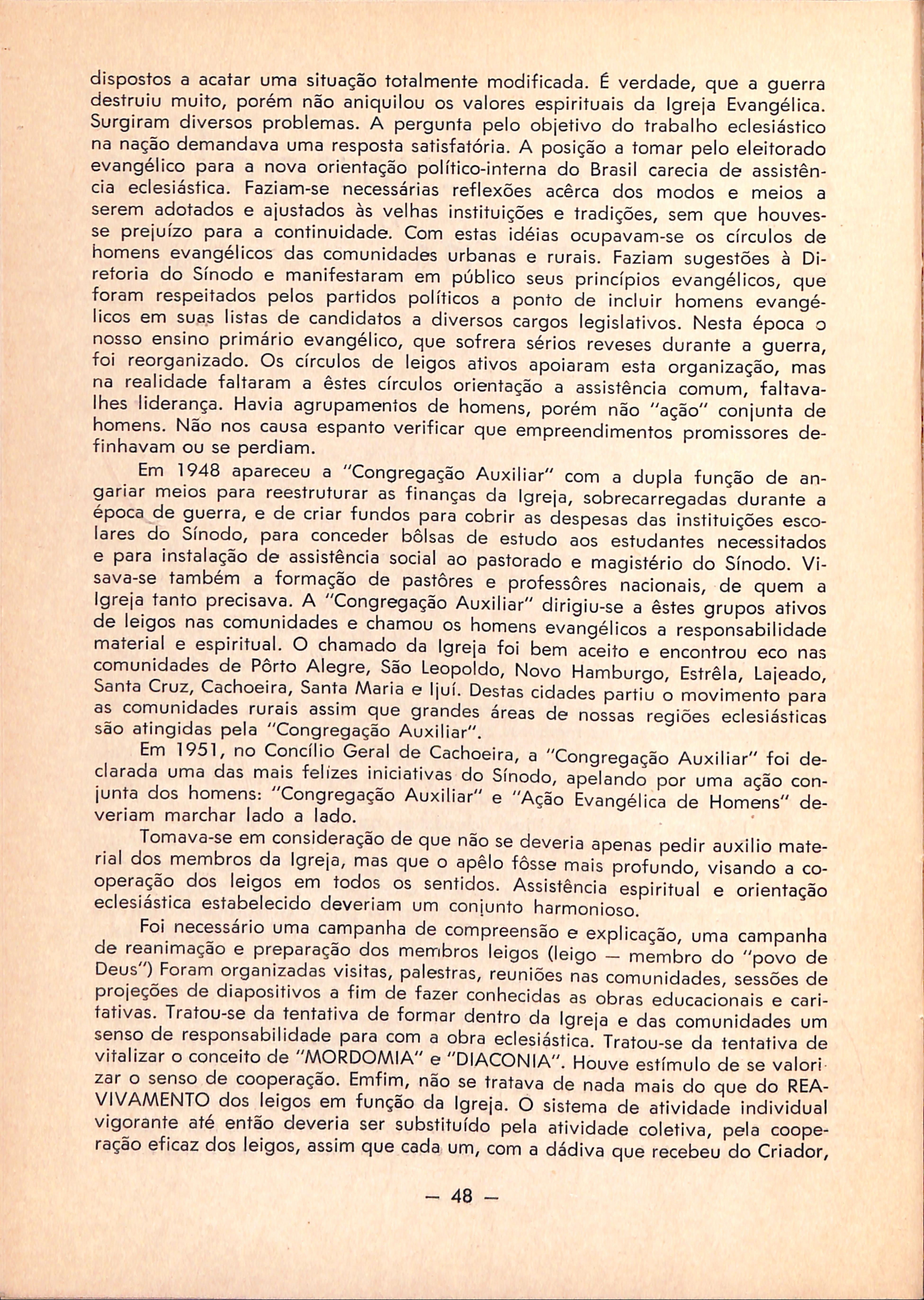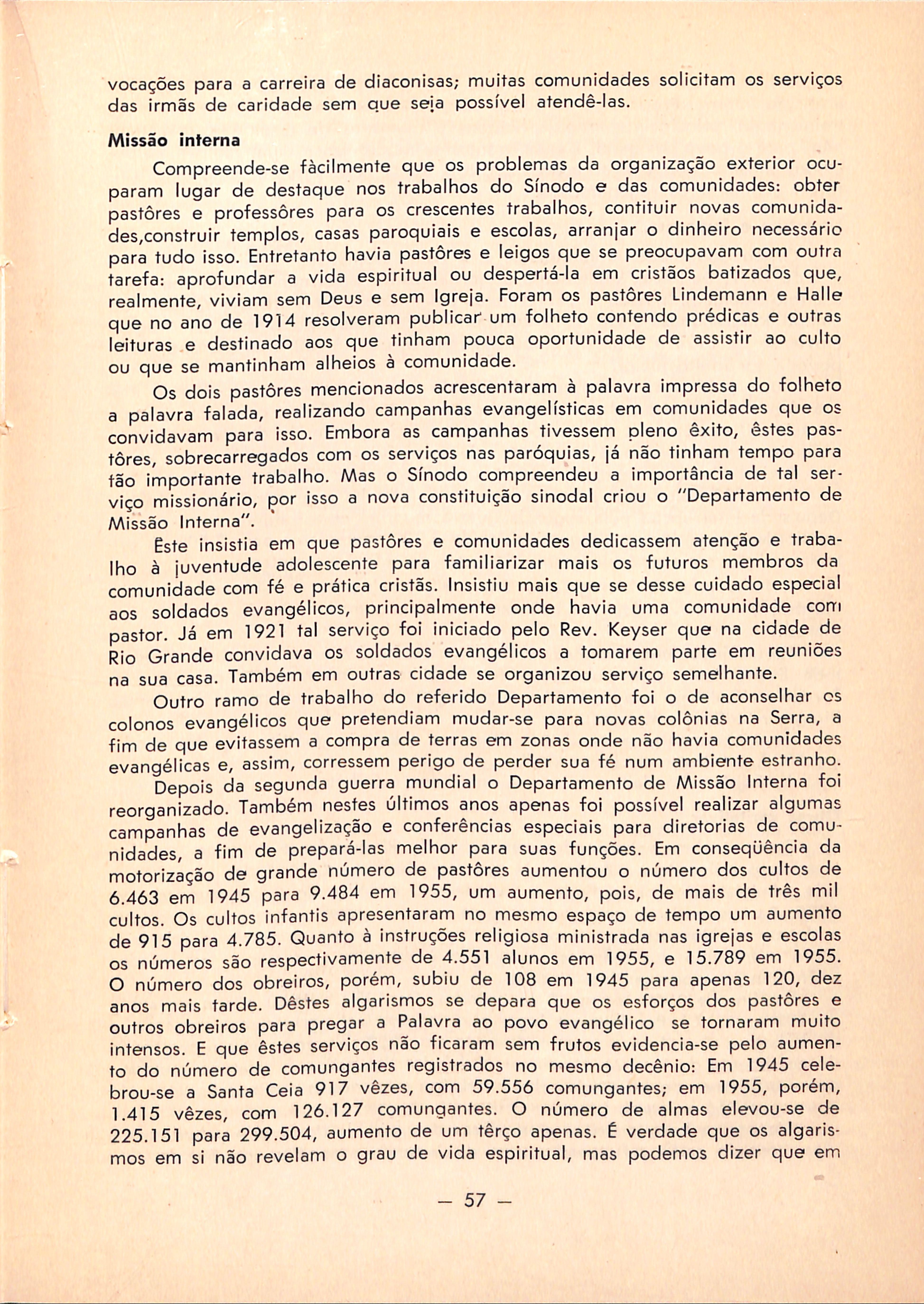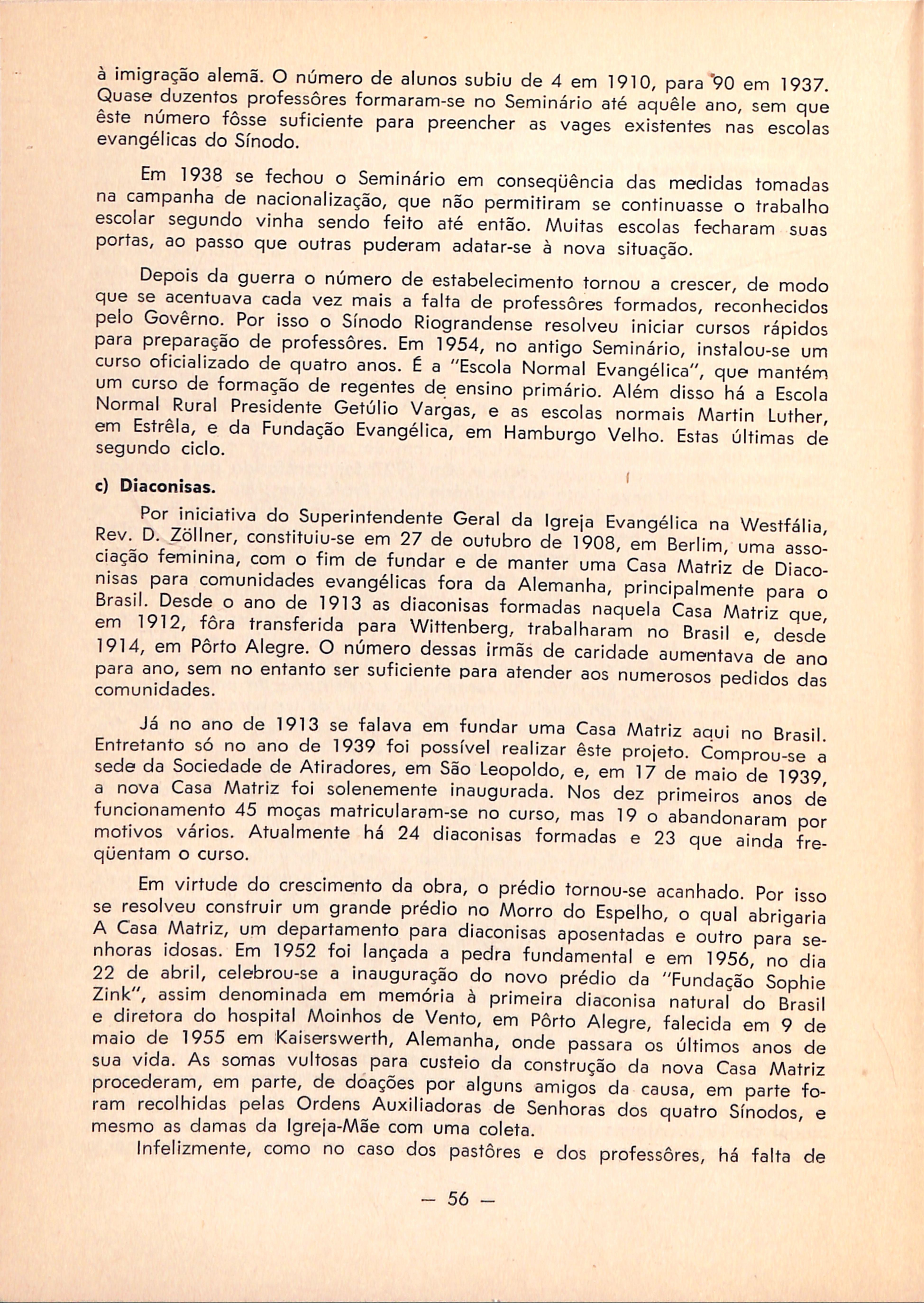 Grato também sou por me haver sido dado conhecer durante o Congresso da Federação Mundial Luterana, em Hannover, o venerando Presidente D. H. Dohms. Com isso, porém, se citaram apenas alguns nomes importantes. Perma nece a memória dos muitos pastores conhecidos e anônimos, das suas espôsas e dos membros das comunidades que na vida e na evolução do Sínodo Riogran dense desempenharam papel importante diante dos olhos de Deus, (talvez mal compreendido pelos homens).