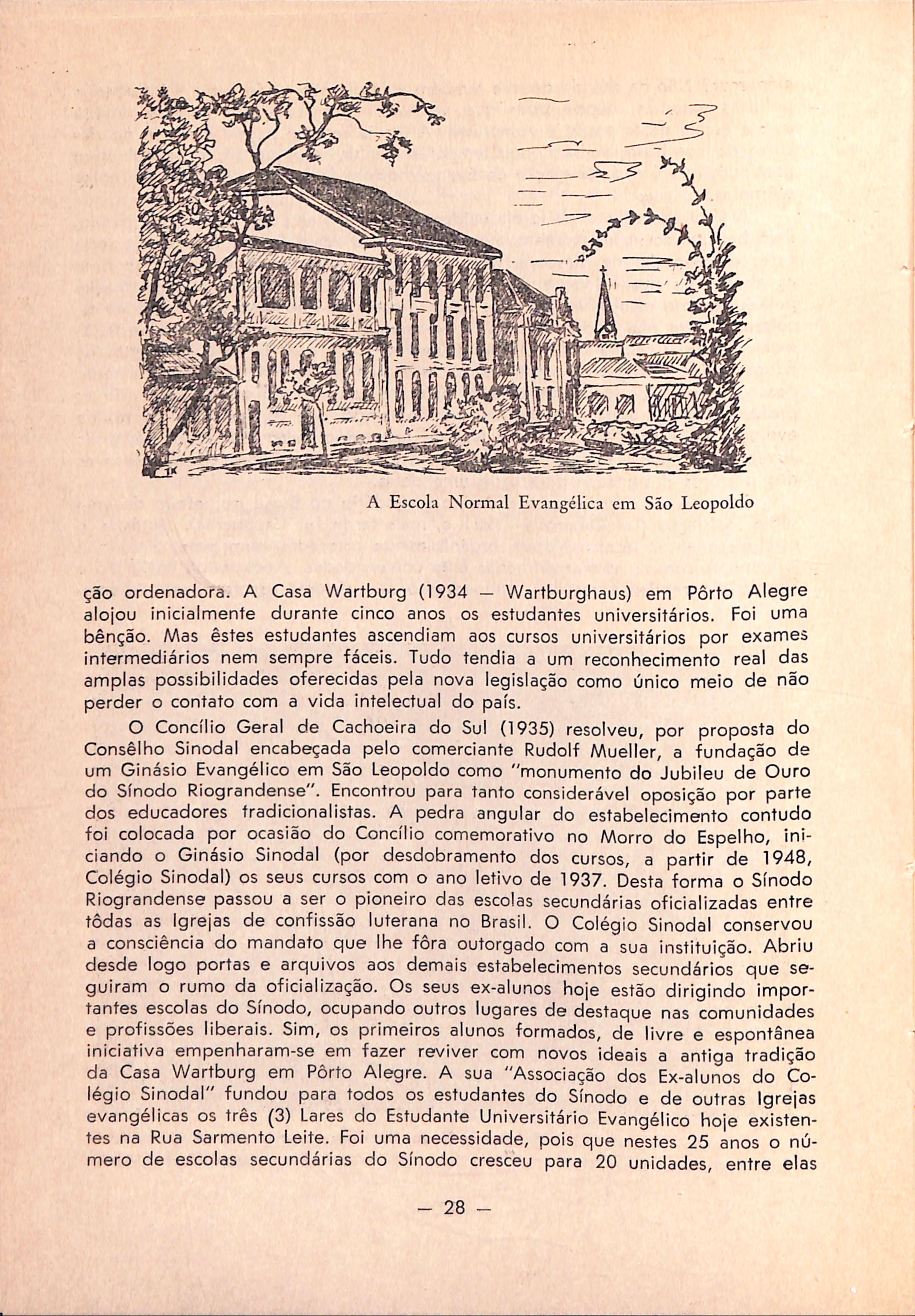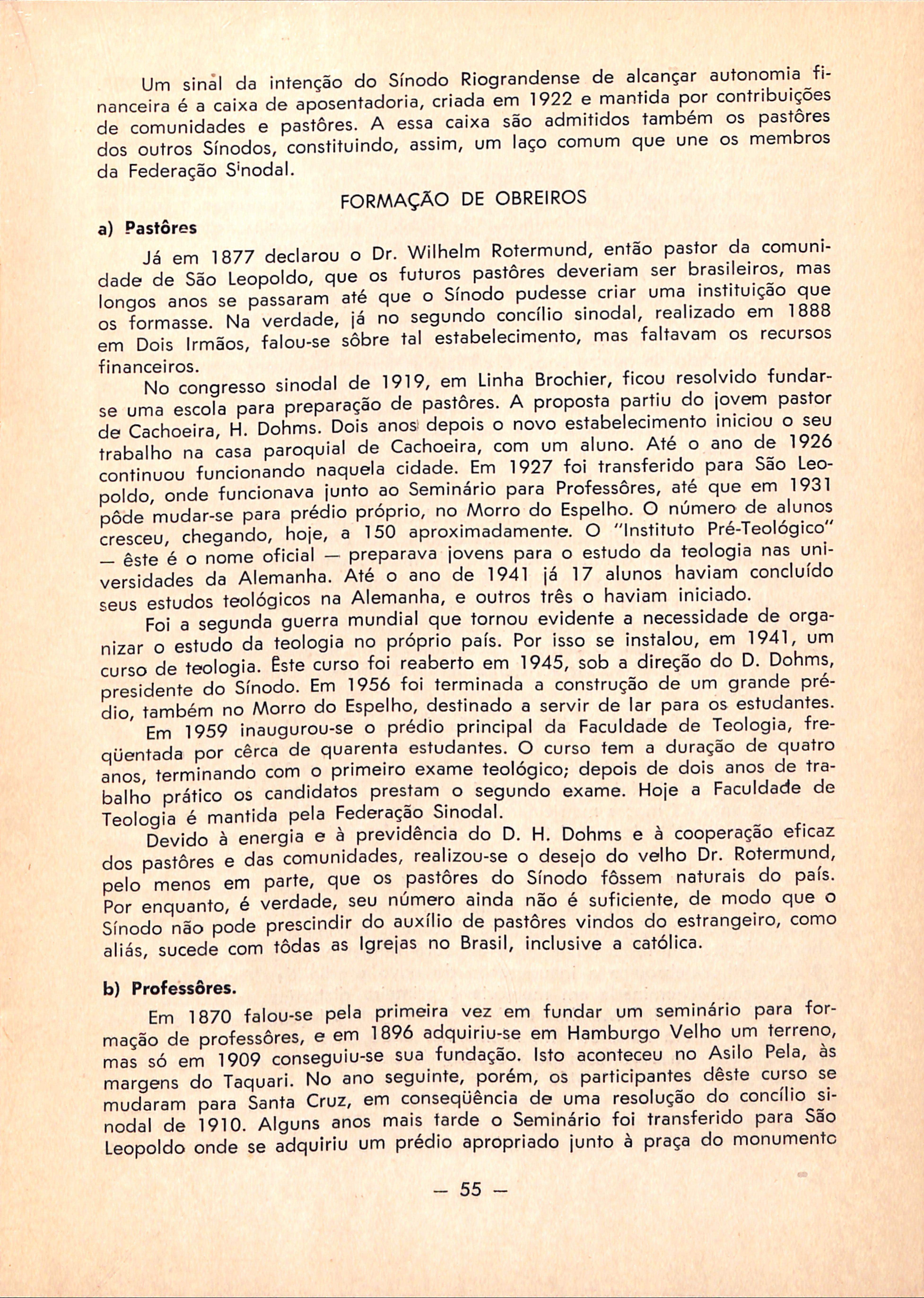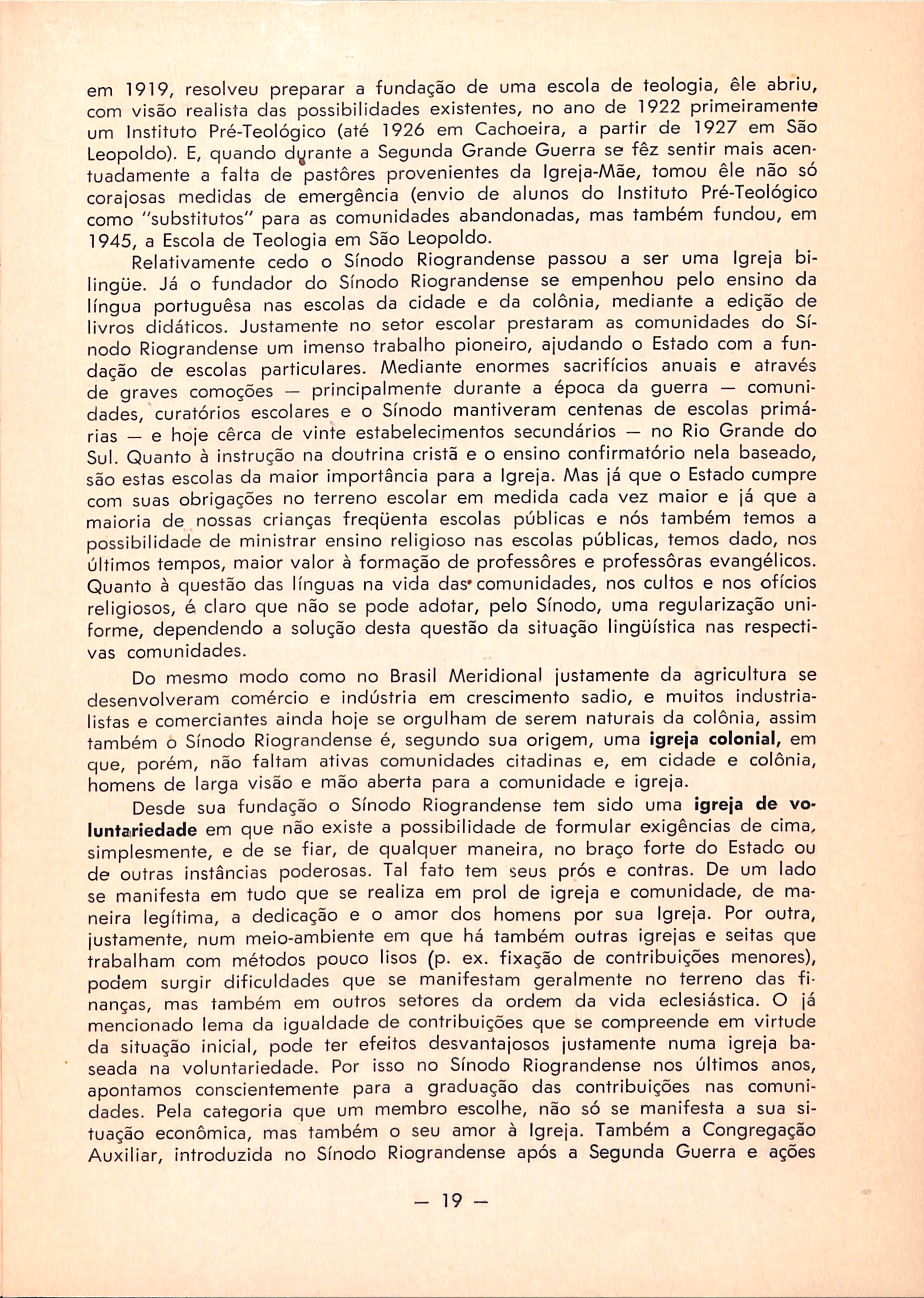 1919, resolveu preparar a fundação de uma escola de teologia, êle abriu, com visão realista das possibilidades existentes, no ano de 1922 primeiramente um Instituto Pré-Teológico (até 1926 em Cachoeira, a partir de 1927 em São Leopoldo). E, quando dyrante a Segunda Grande Guerra se fêz sentir mais acentuadamente a falta de pastores provenientes da Igreja-Mãe, tomou êle não só medidas de emergência (envio de alunos do Instituto Pré-Teológico "substitutos” para as comunidades abandonadas, mas também fundou, em 1945, a Escola de Teologia em São Leopoldo. Relativamente cedo o Sínodo Riograndense passou a ser uma Igreja bilingüe. Já o fundador do Sínodo Riograndense se empenhou pelo ensino da língua portuguêsa nas escolas da cidade e da colônia, mediante a edição de livros didáticos. Justamente no setor escolar prestaram as comunidades do Sí nodo Riograndense um imenso trabalho pioneiro, ajudando o Estado com a fun dação de escolas particulares. Mediante enormes sacrifícios anuais e através de graves comoções — principalmente durante a época da guerra — comuni dades, curatórios escolares e o Sínodo mantiveram centenas de escolas primá— e hoje cêrca de vinte estabelecimentos secundários — no Rio Grande do Sul. Quanto à instrução na doutrina cristã e o ensino confirmatório nela baseado, são estas escolas da maior importância para a Igreja. Mas já que o Estado cumpre obrigações no terreno escolar em medida cada vez maior e já que a