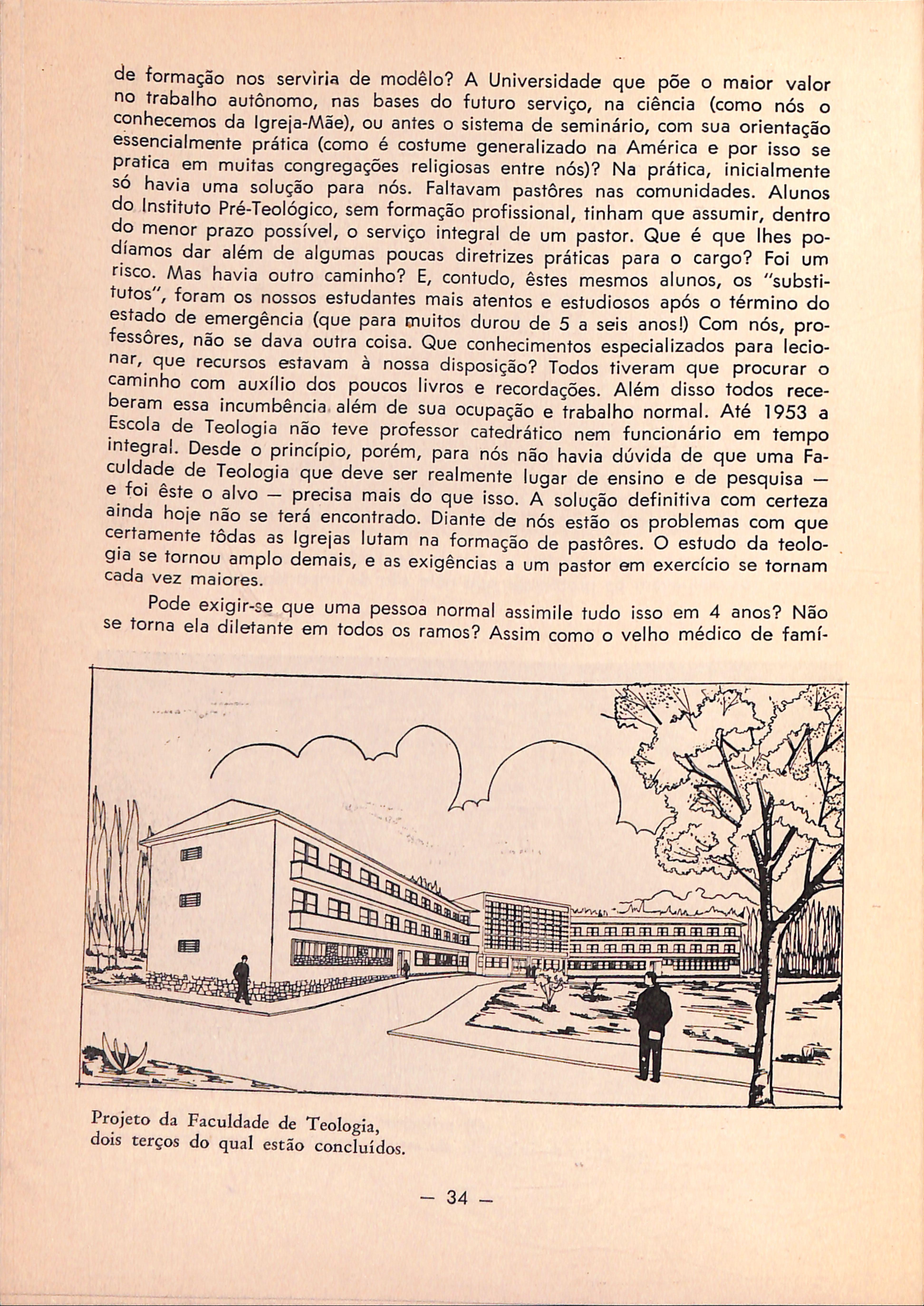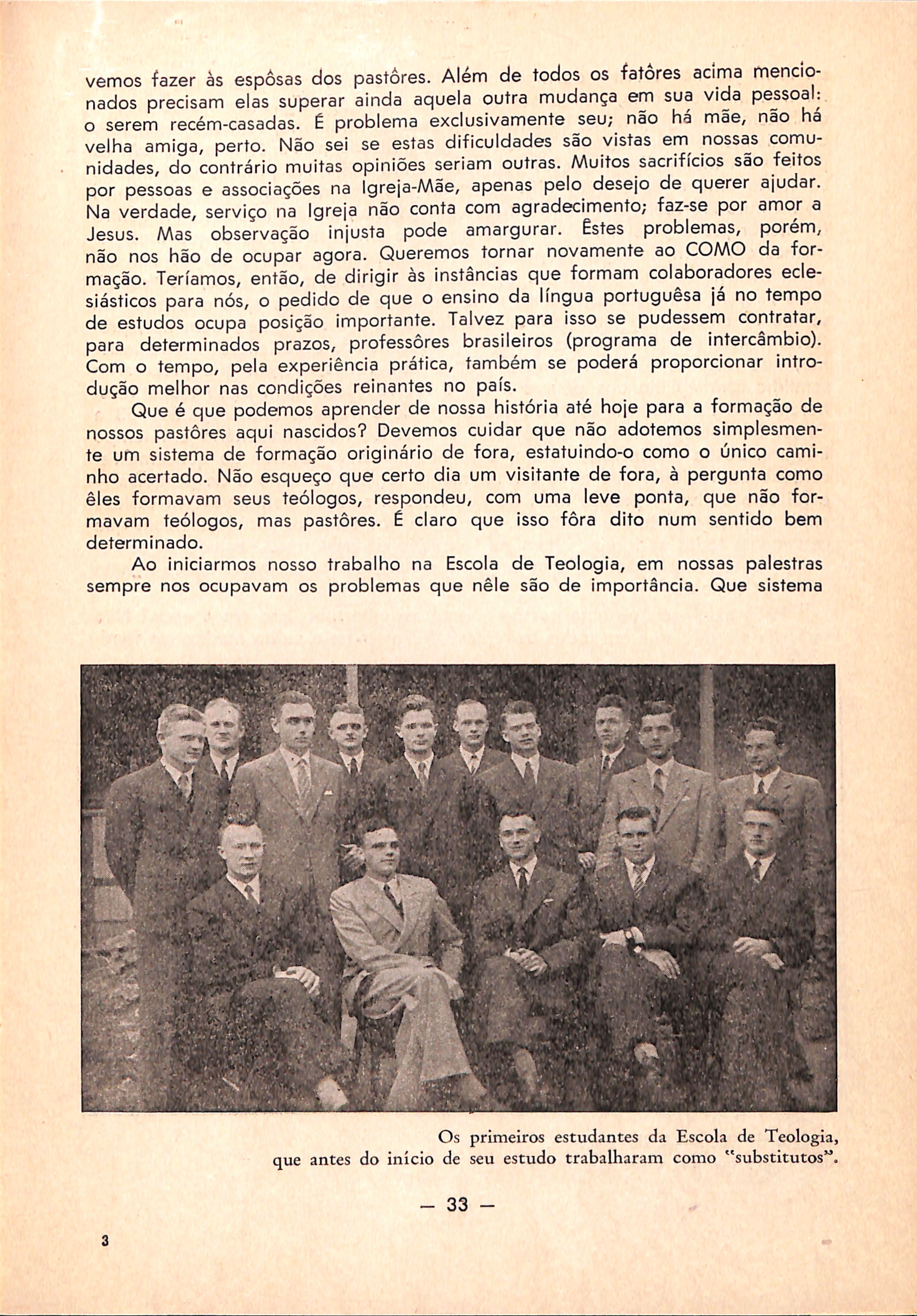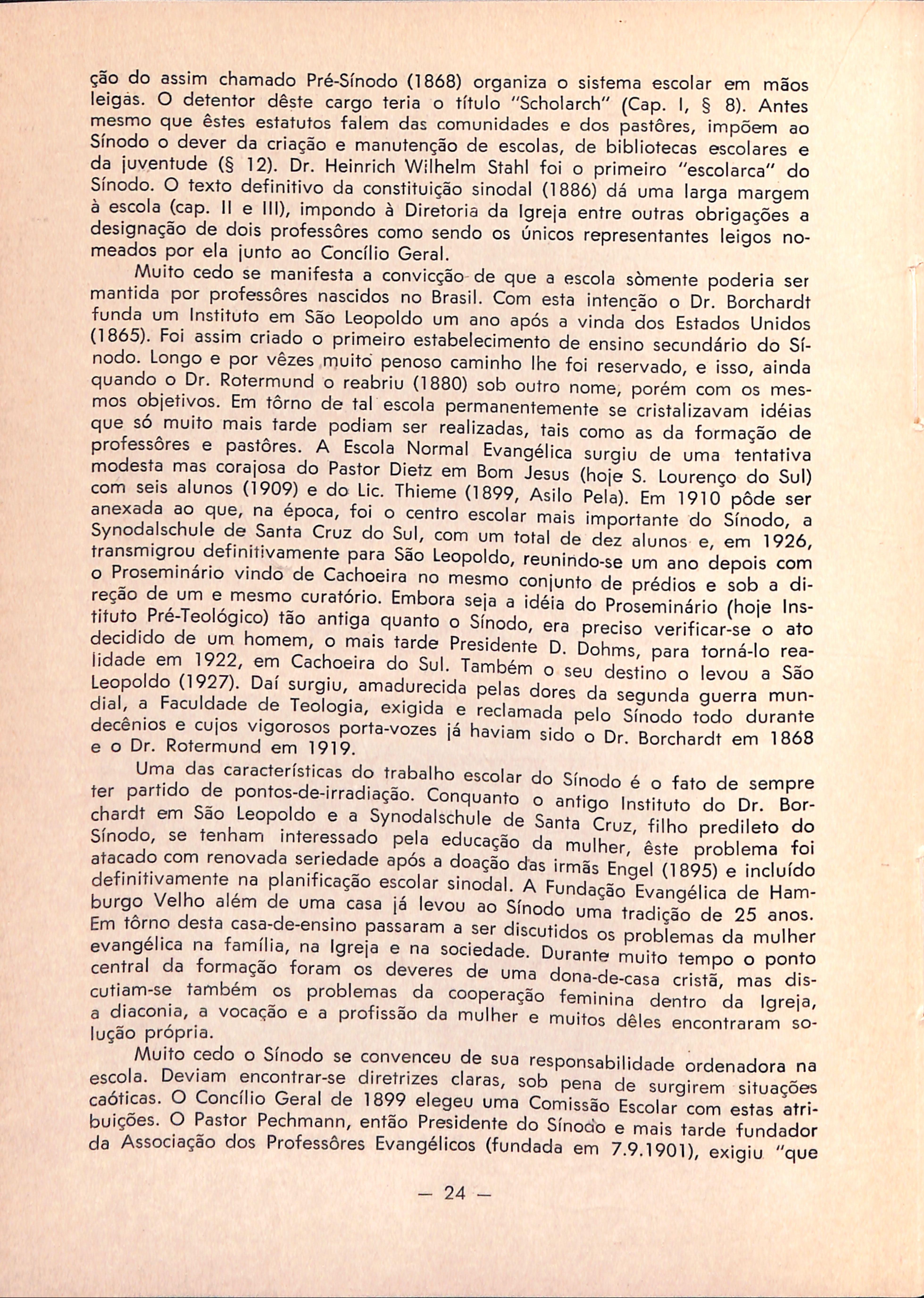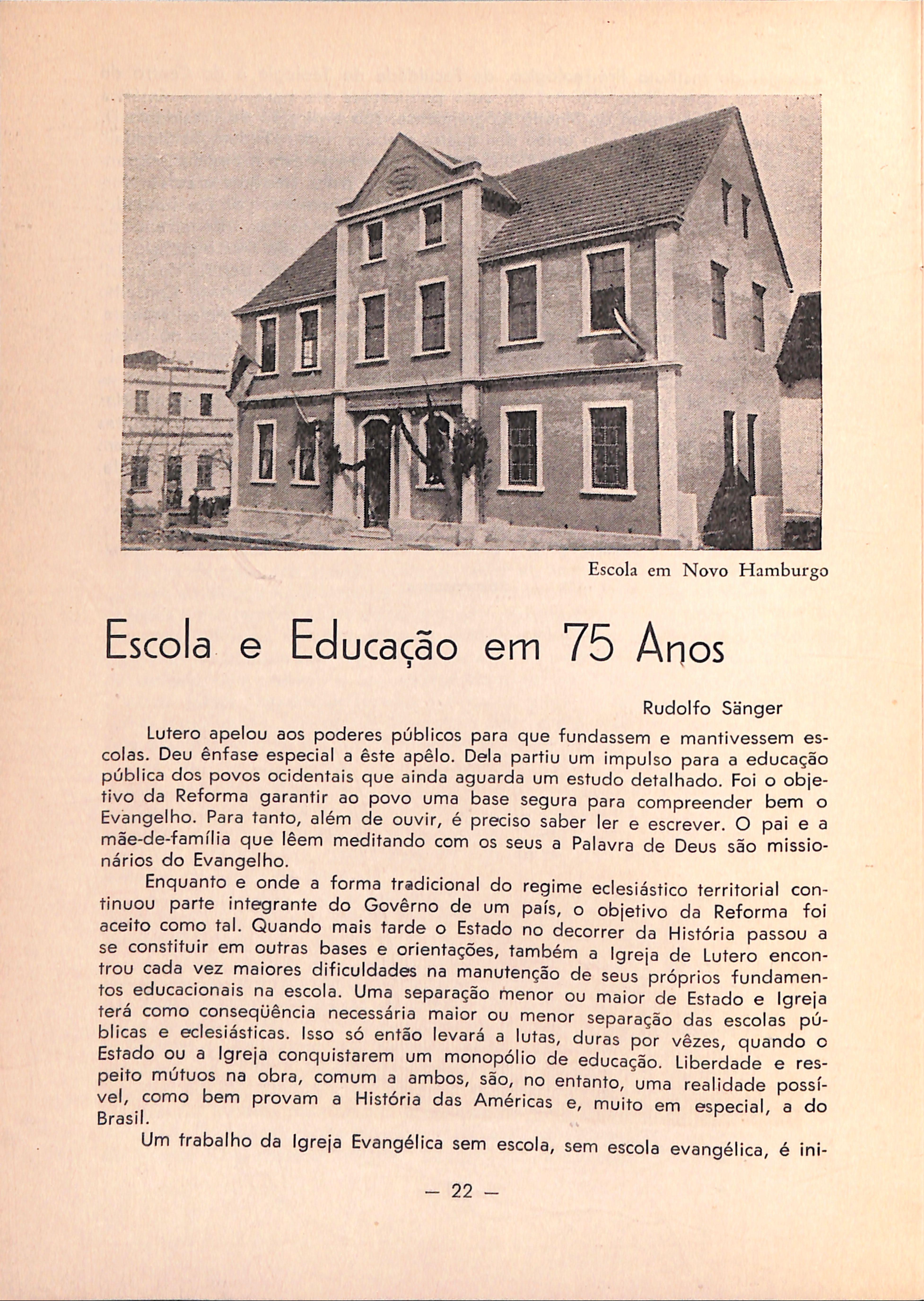 1919, resolveu preparar a fundação de uma escola de teologia, êle abriu, com visão realista das possibilidades existentes, no ano de 1922 primeiramente um Instituto Pré-Teológico (até 1926 em Cachoeira, a partir de 1927 em São Leopoldo). E, quando dyrante a Segunda Grande Guerra se fêz sentir mais acentuadamente a falta de pastores provenientes da Igreja-Mãe, tomou êle não só medidas de emergência (envio de alunos do Instituto Pré-Teológico "substitutos” para as comunidades abandonadas, mas também fundou, em 1945, a Escola de Teologia em São Leopoldo. Relativamente cedo o Sínodo Riograndense passou a ser uma Igreja bilingüe. Já o fundador do Sínodo Riograndense se empenhou pelo ensino da língua portuguêsa nas escolas da cidade e da colônia, mediante a edição de livros didáticos. Justamente no setor escolar prestaram as comunidades do Sí nodo Riograndense um imenso trabalho pioneiro, ajudando o Estado com a fun dação de escolas particulares. Mediante enormes sacrifícios anuais e através de graves comoções — principalmente durante a época da guerra — comuni dades, curatórios escolares e o Sínodo mantiveram centenas de escolas primá— e hoje cêrca de vinte estabelecimentos secundários — no Rio Grande do Sul. Quanto à instrução na doutrina cristã e o ensino confirmatório nela baseado, são estas escolas da maior importância para a Igreja. Mas já que o Estado cumpre obrigações no terreno escolar em medida cada vez maior e já que a