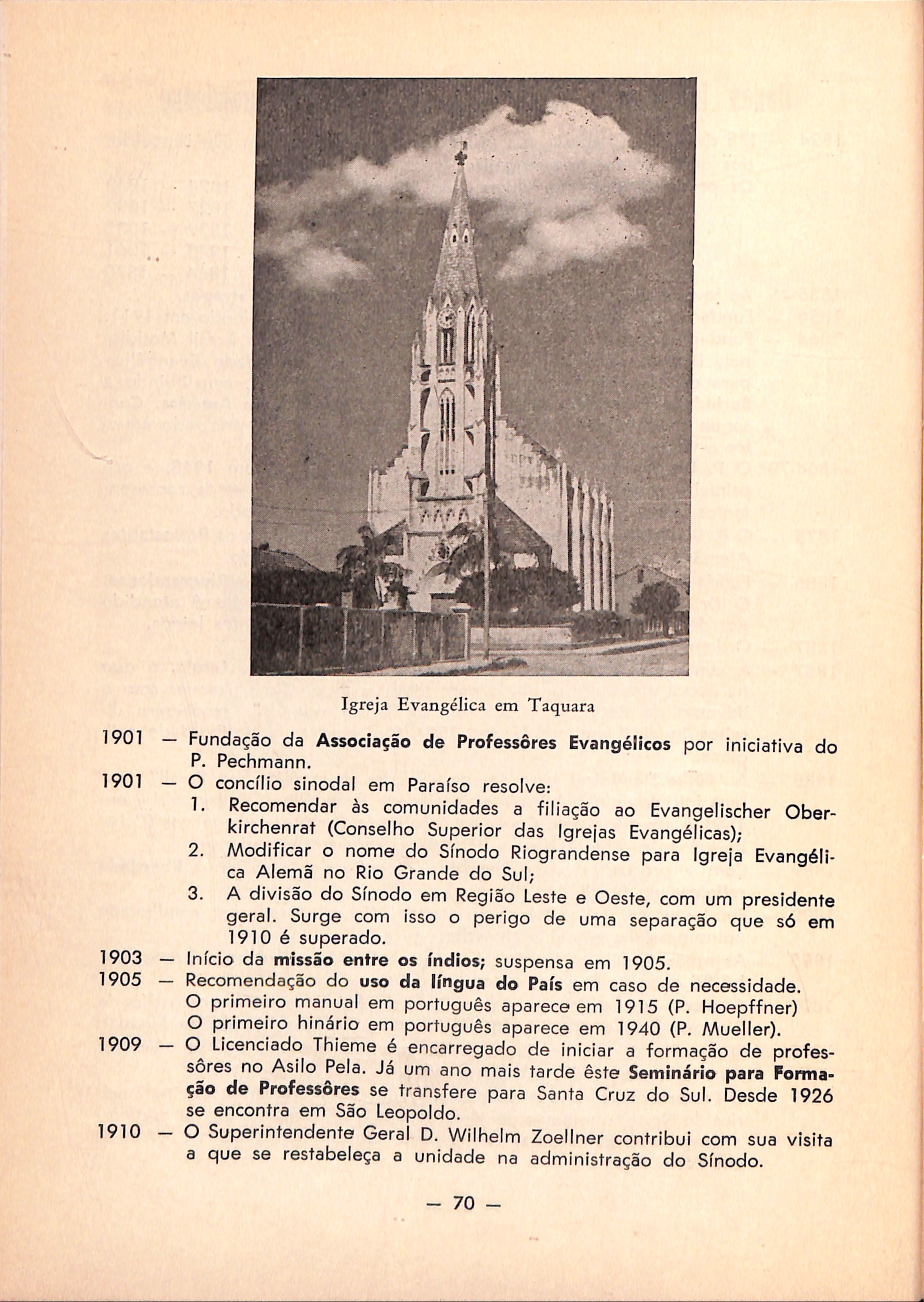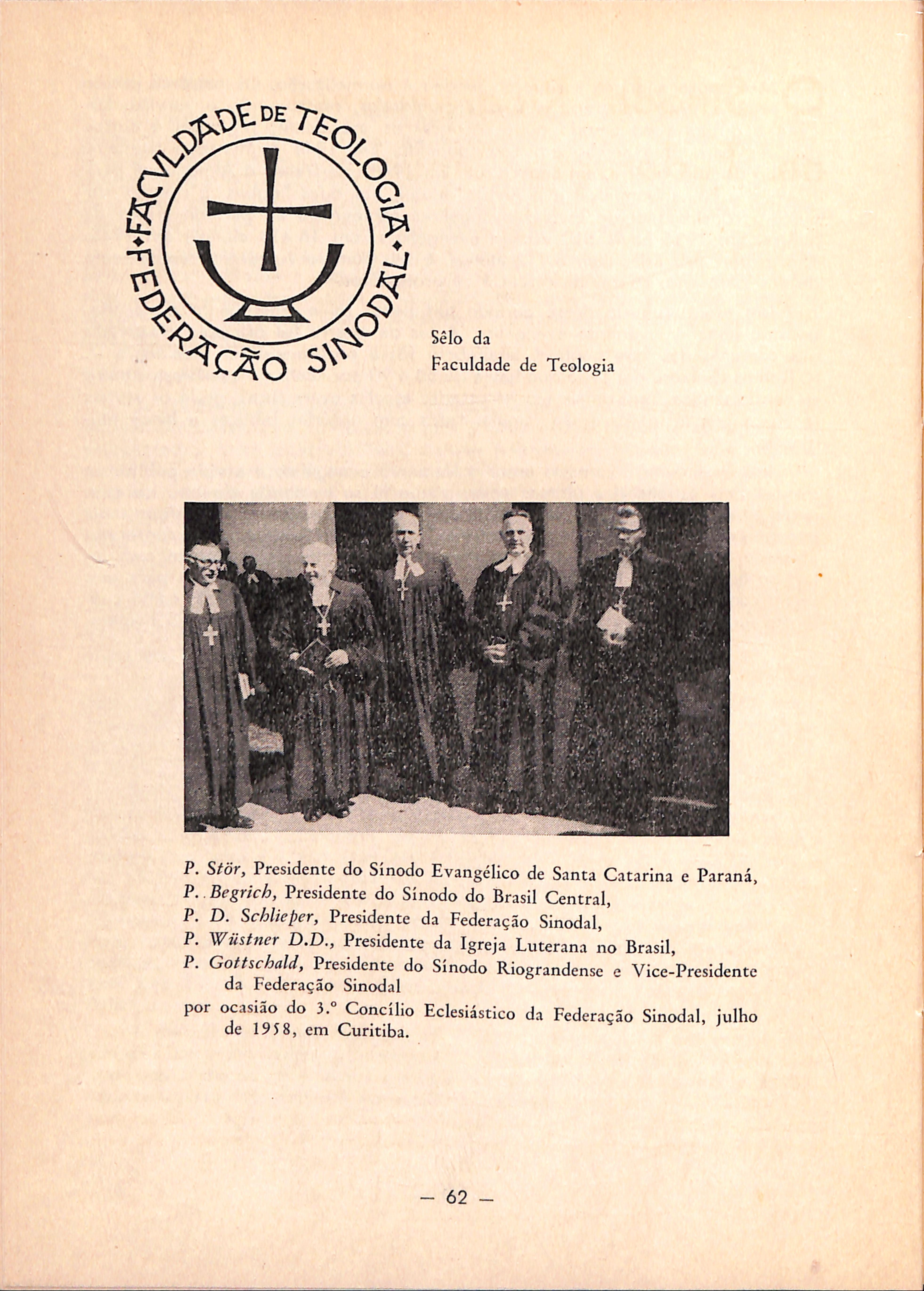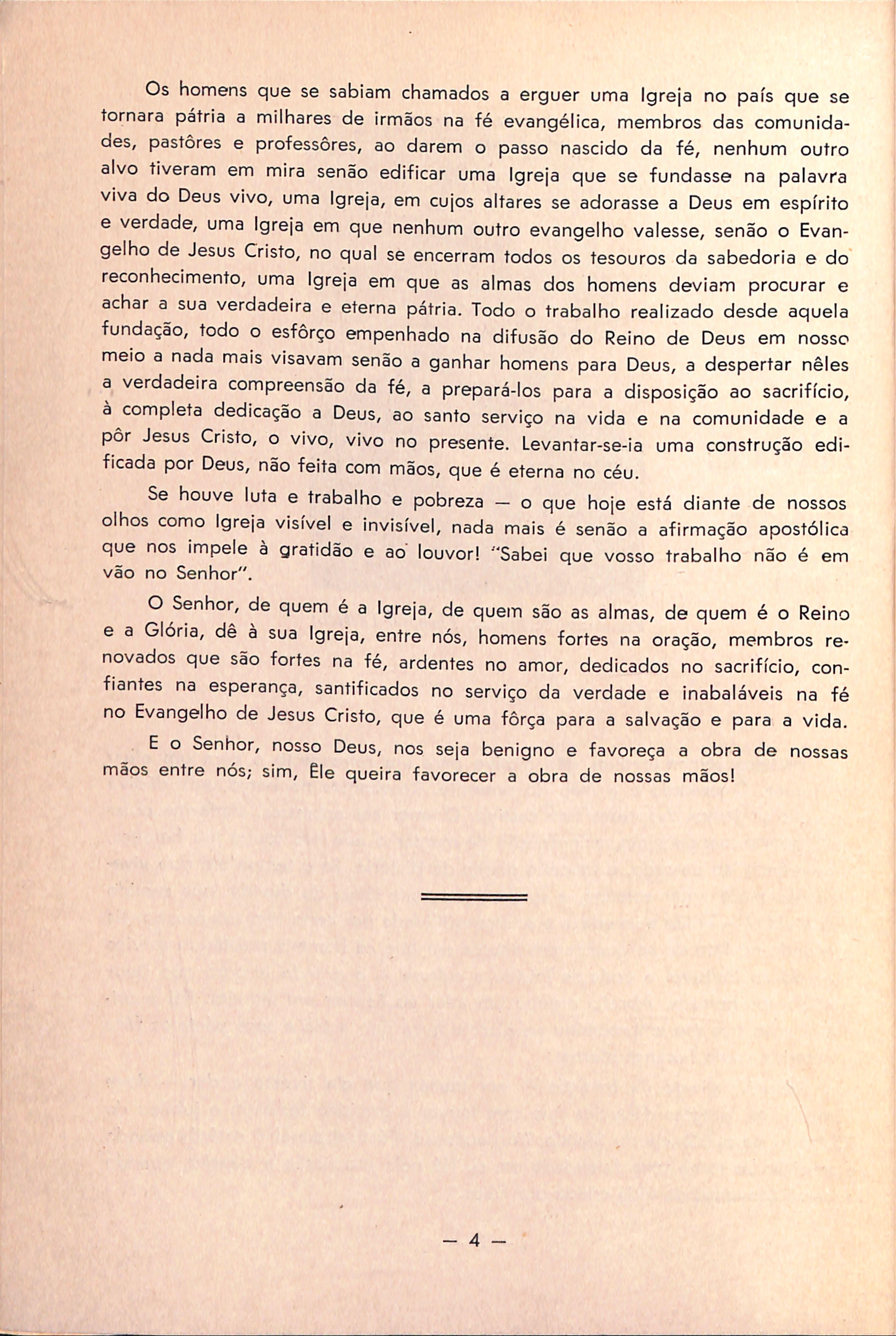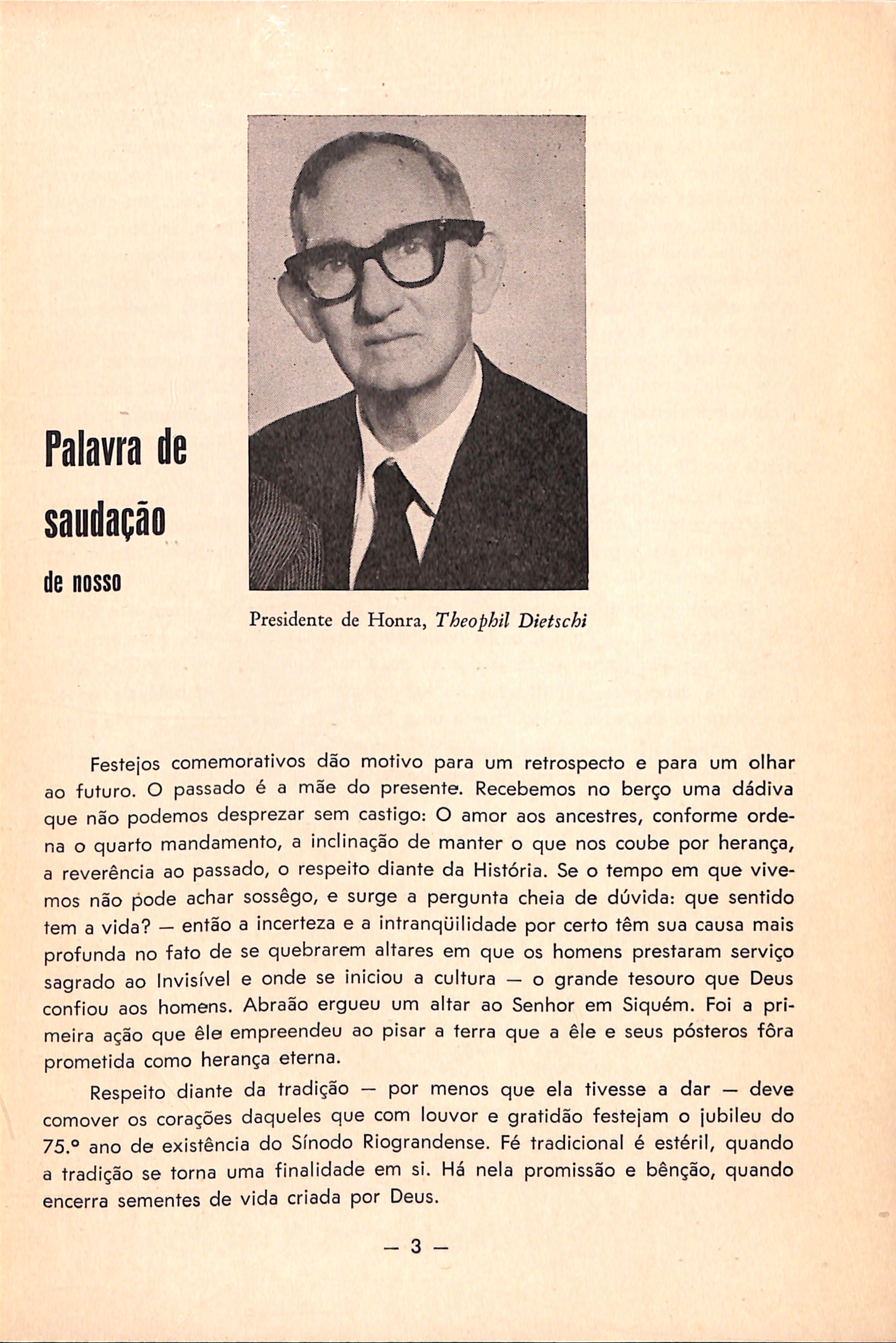 Presidente de Honra, Theophil DietschiOs homens que se sabiam chamados a erguer uma Igreja no país que se tornara pátria a milhares de irmãos na fé evangélica, membros das comunida des, pastores e professores, ao darem o passo nascido da fé, nenhum outro mira senão edificar uma Igreja que se fundasse na palavra viva do Deus vivo, uma Igreja, em cujos altares se adorasse a Deus em espírito e verdade, uma Igreja em que nenhum outro evangelho valesse, senão o Evan gelho de Jesus Cristo, no qual se encerram todos os tesouros da sabedoria e do reconhecimento, uma Igreja em que as almas dos homens deviam procurar e achar a sua verdadeira