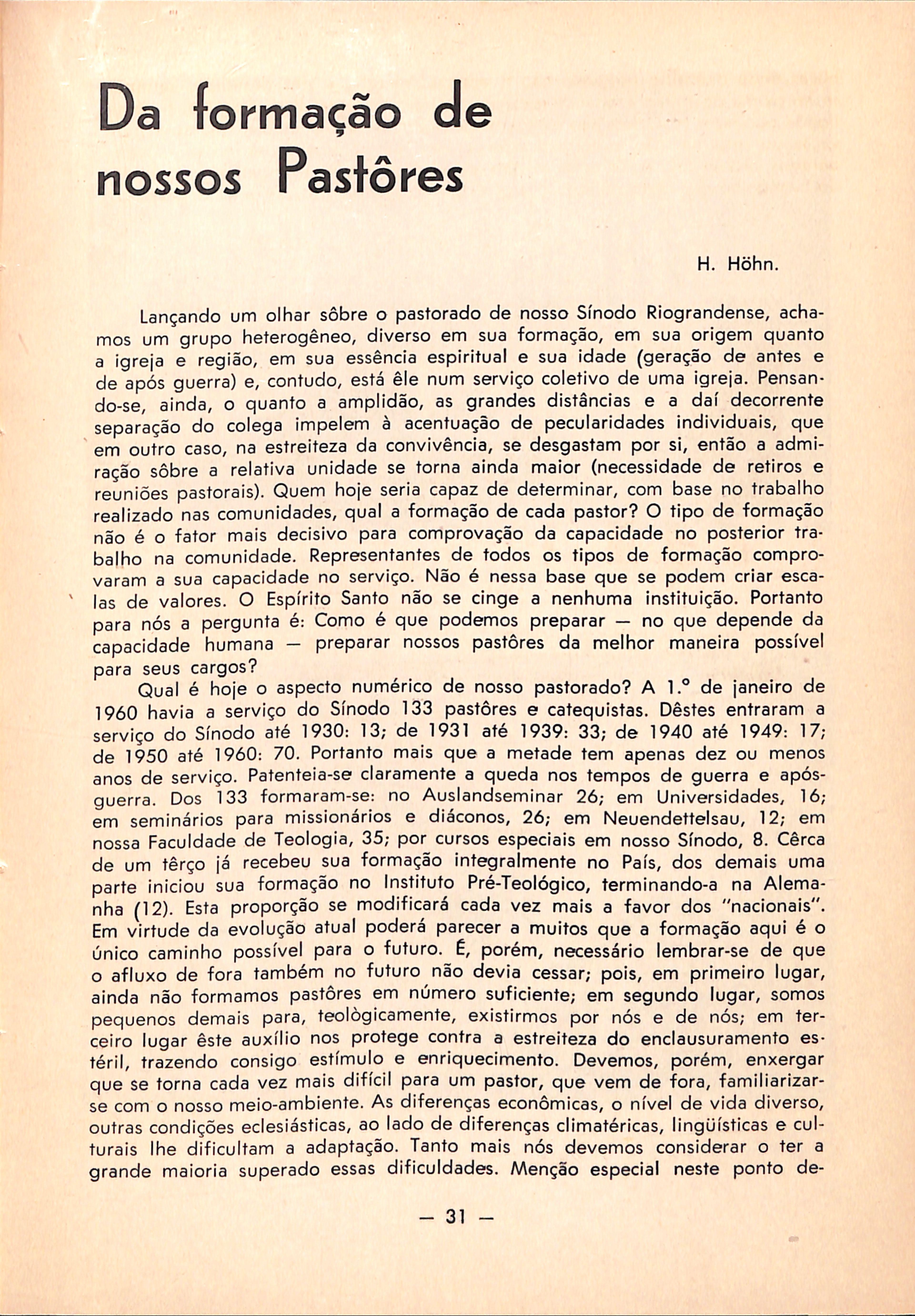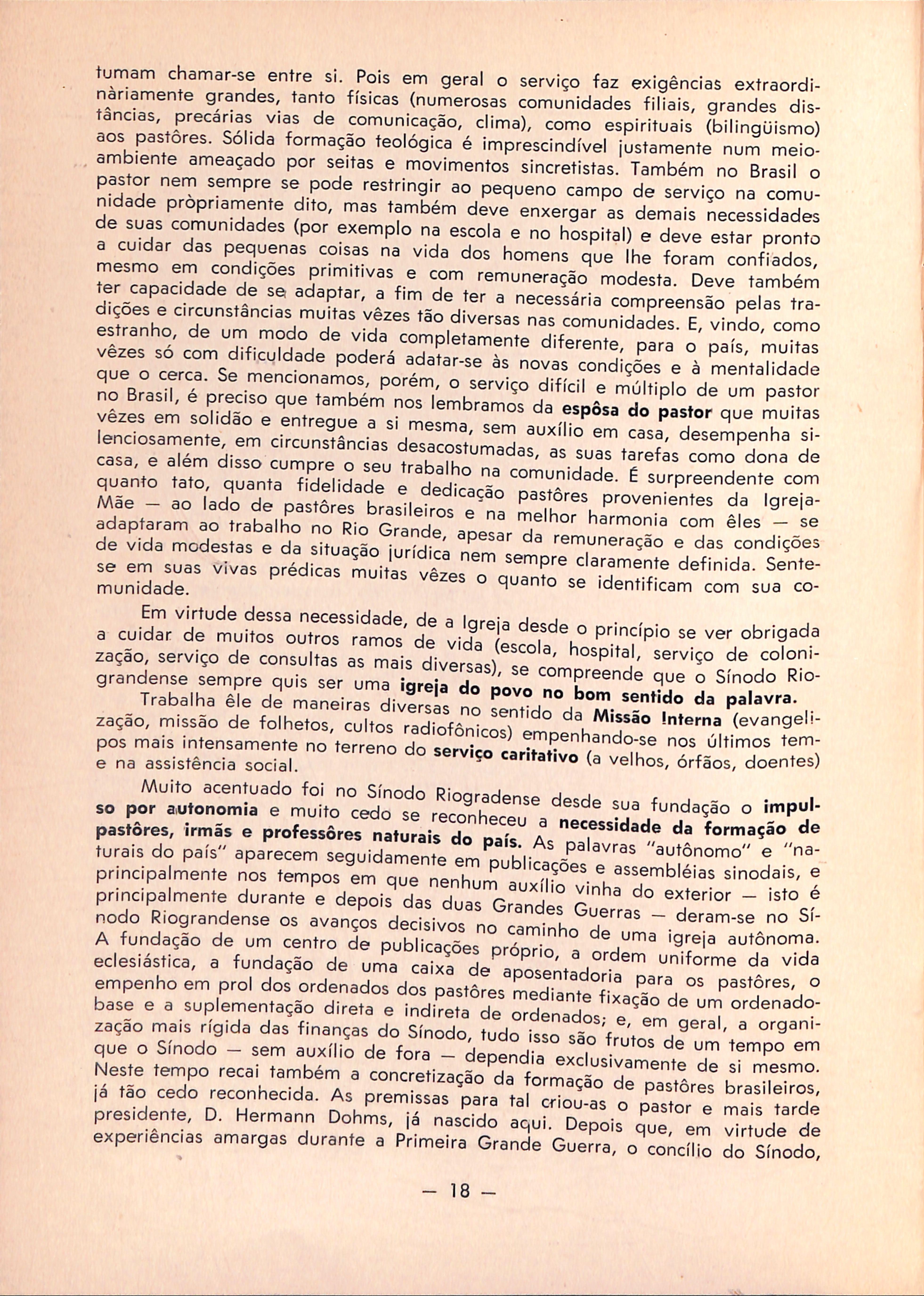 tumam chamar-se entre si. Pois em geral o serviço faz exigências extraordi nariamente grandes, tanto físicas (numerosas comunidades filiais, grandes discomunicação, clima), como espirituais (bilingüismo) aos pastores. Solida formaçao teologica é imprescindível iustamente ambiente ameaçado por seitas num meio„ , , ® movimentos sincretistas. Também no Brasil o pastor nem sempre se pode restringir ao pequeno campo de serviço na comudL suÍ^c3nidad necessidades fcu^ r dTs nf ® ^“Pital) e deve estar pronto a cuidar das pequenas coisas na vida dos homens que lhe foram confiados, ter capacid^ade dé^srad^"T'^'''"%® mmuneração modesta. Deve também