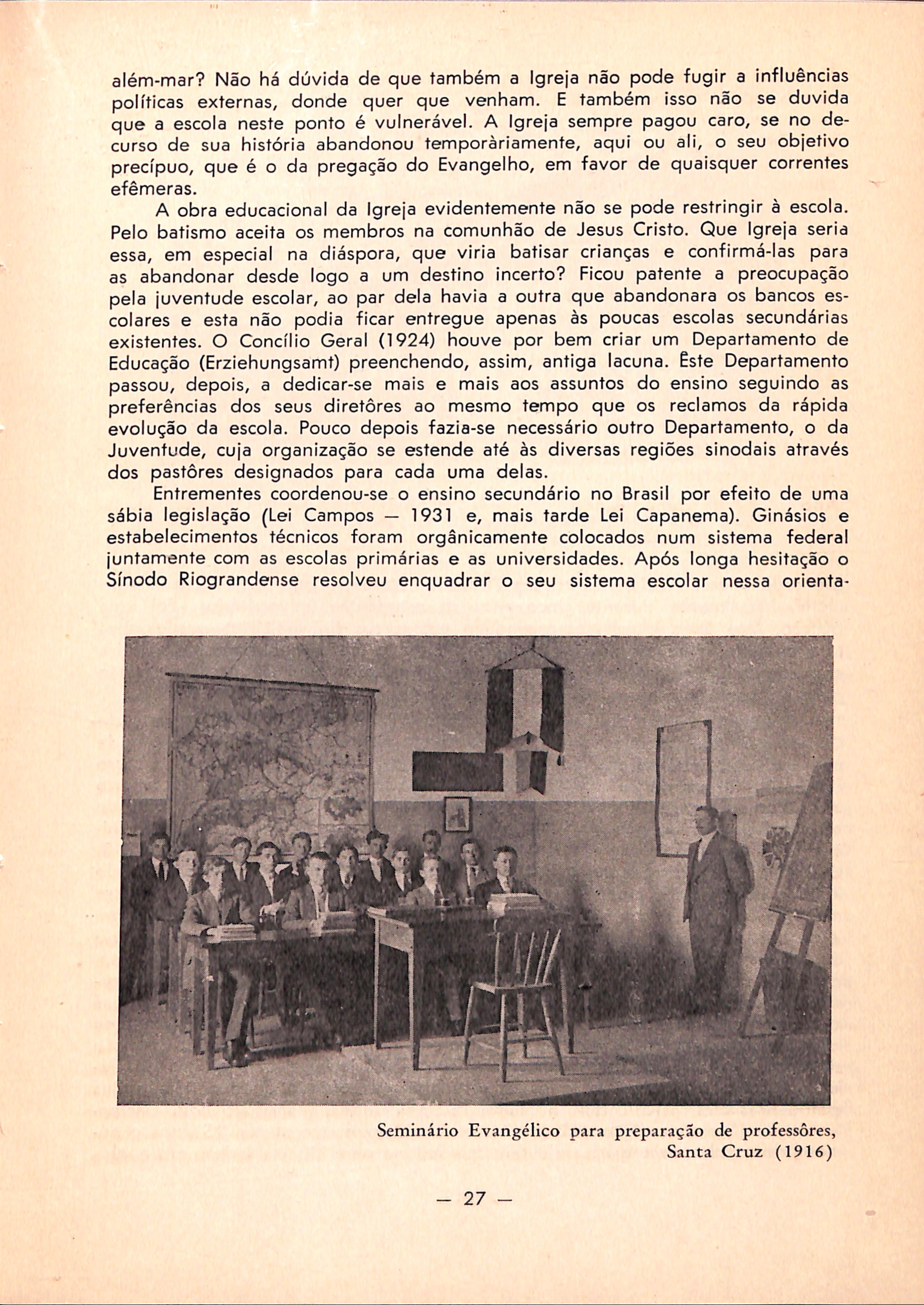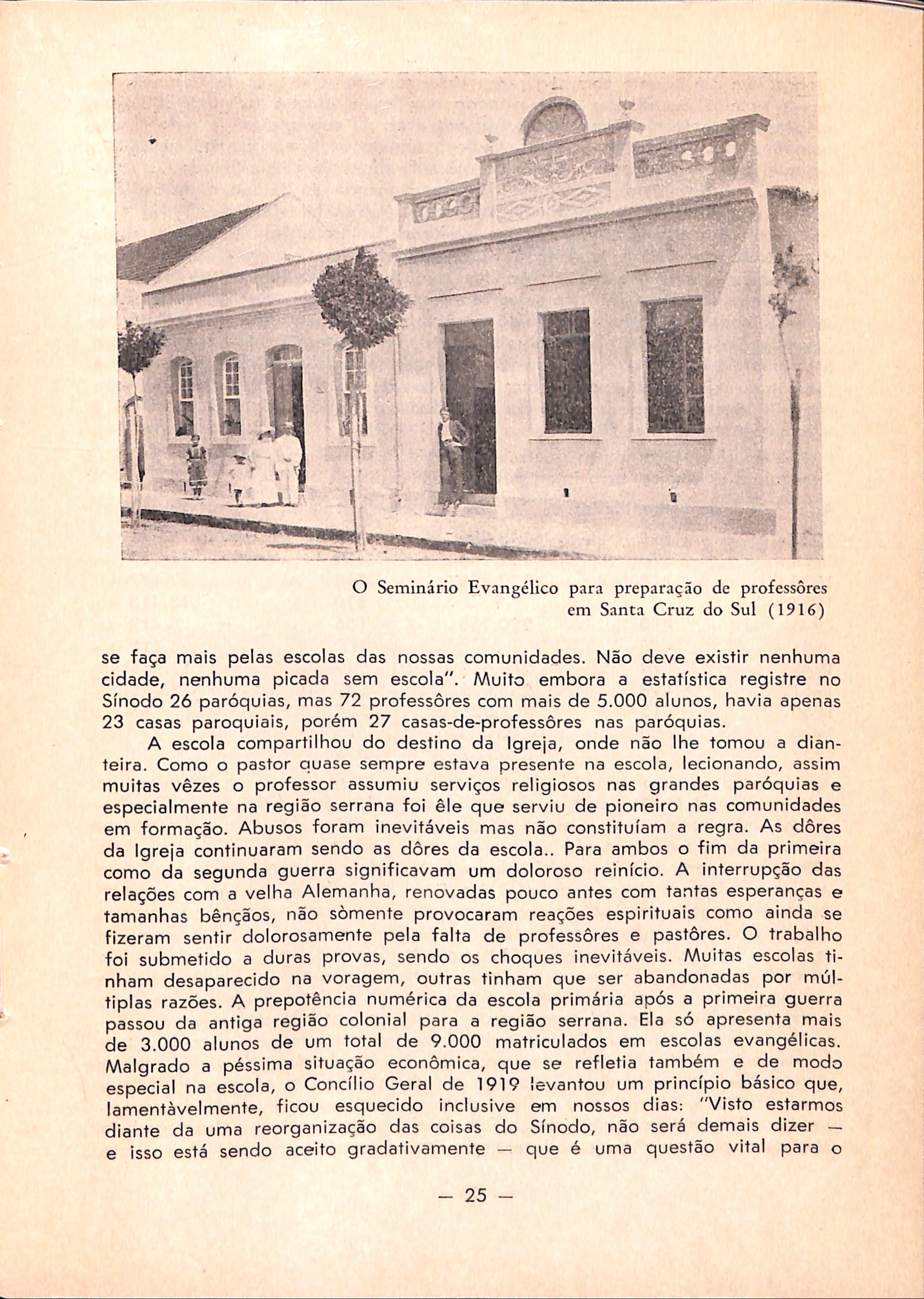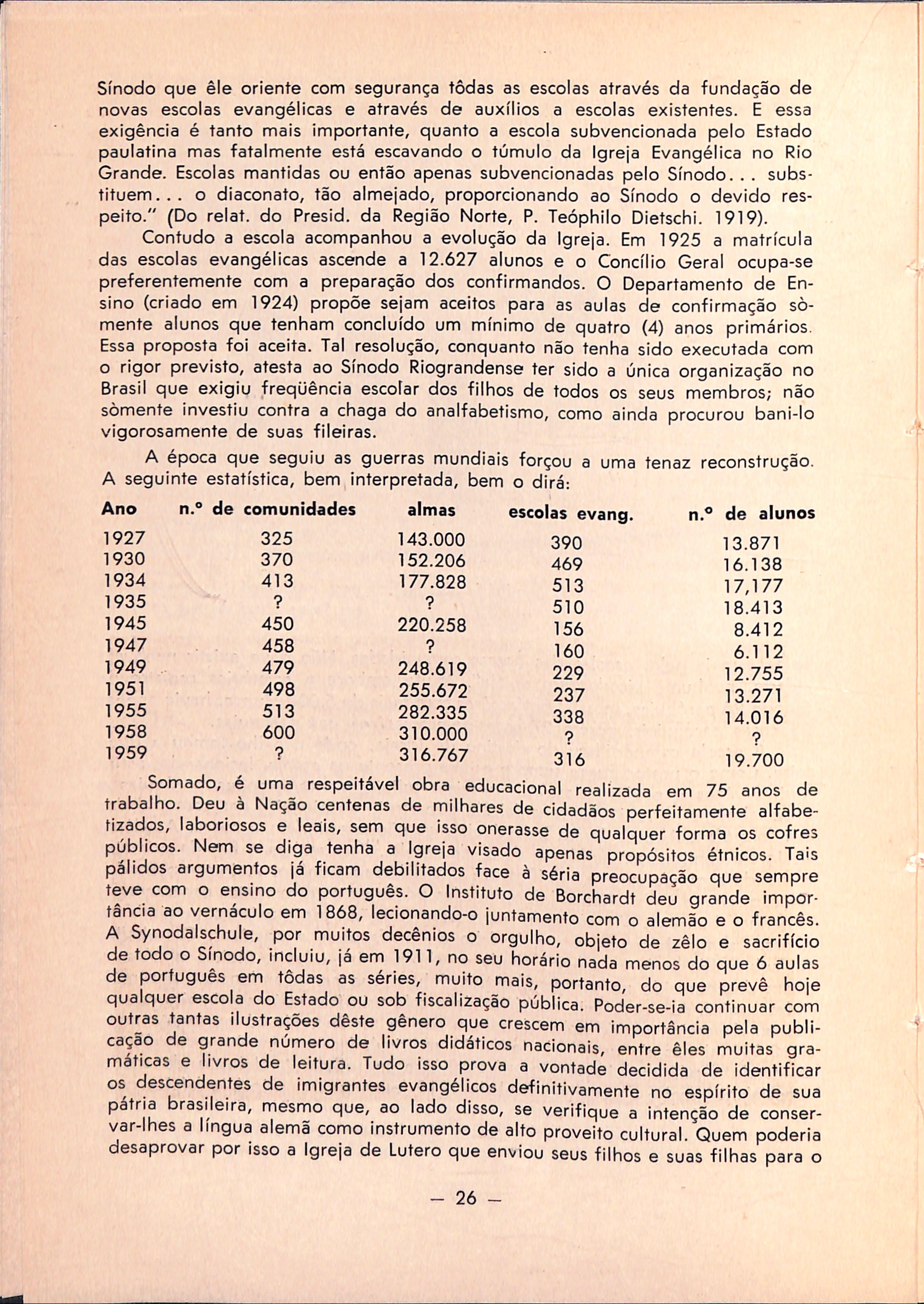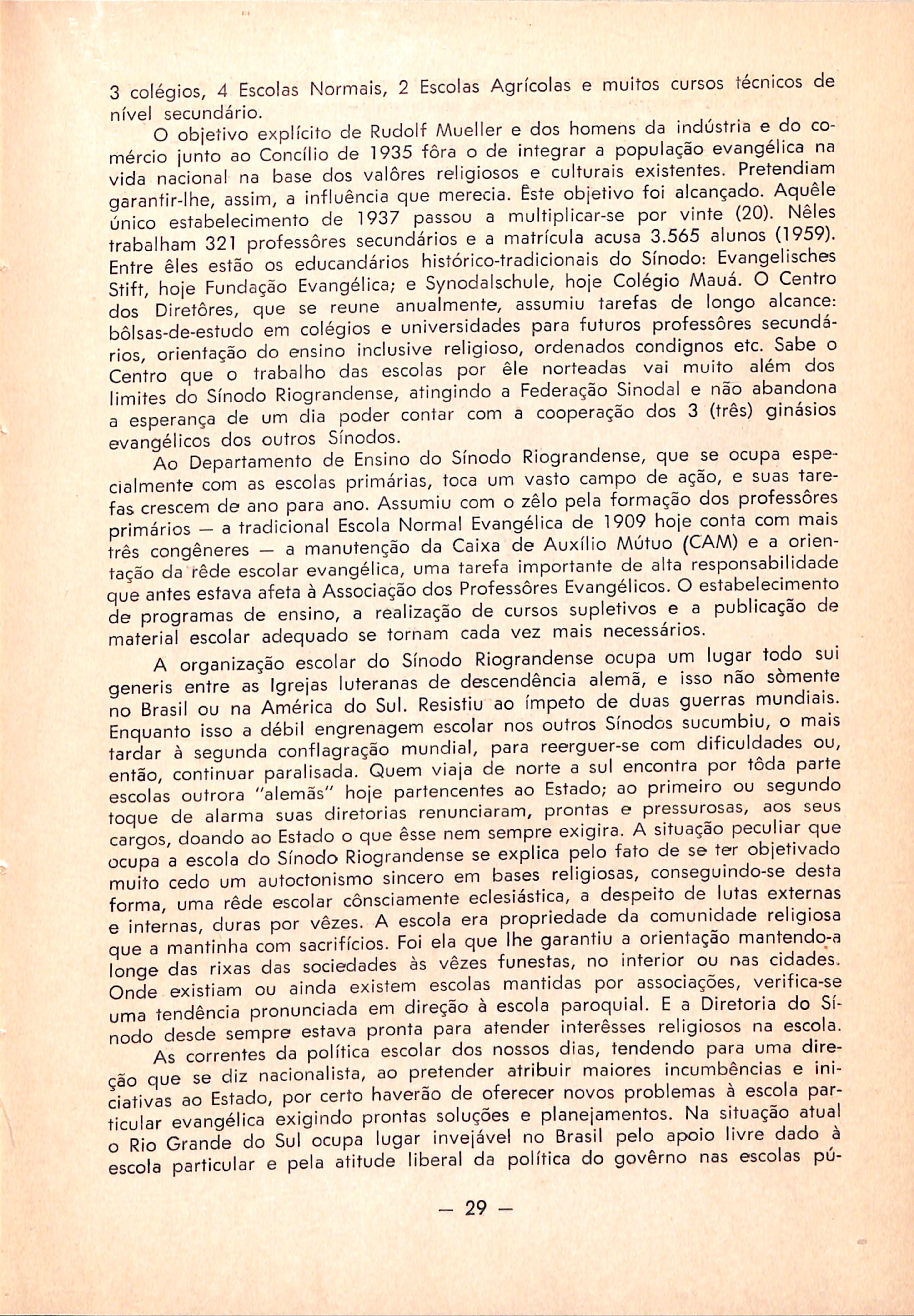 maioria de nossas crianças freqüenta escolas públicas e nós também temos a possibilidade de ministrar ensino religioso nas escolas públicas, temos dado, nos últimos tempos, maior valor à formação de professores e professôras evangélicos. Quanto à questão das línguas na vida das* comunidades, nos cultos e nos ofícios religiosos, é claro que não se pode adotar, pelo Sínodo, uma regularização uni forme, dependendo a solução desta questão da situação lingüística nas respecti vas comunidades.
